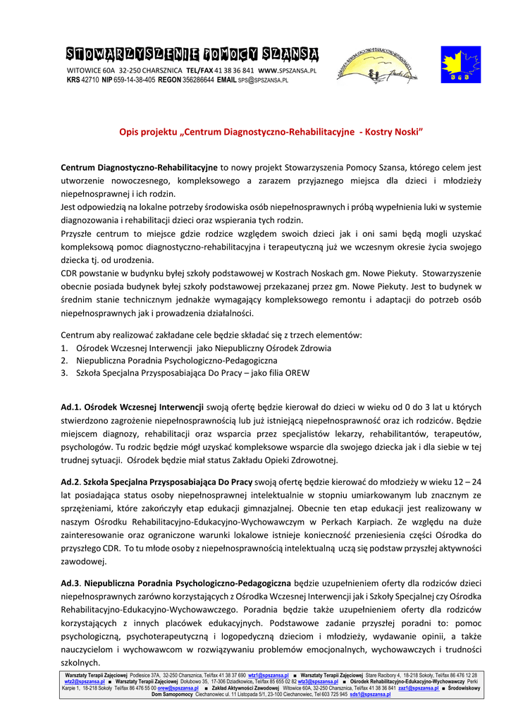 STOWARZYSZENIE POMOCY SZANSA WITOWICE 60A 32-250 CHARSZNICA TEL/FAX 41 38 36 841 WWW.SPSZANSA.PL KRS 42710 NIP 659-14-38-405 REGON 356286644 EMAIL [email protected] Opis projektu „Centrum Diagnostyczno-Rehabilitacyjne - Kostry Noski” Centrum Diagnostyczno-Rehabilitacyjne to nowy projekt Stowarzyszenia Pomocy Szansa, którego celem jest utworzenie nowoczesnego, kompleksowego a zarazem przyjaznego miejsca dla dzieci i młodzieży niepełnosprawnej i ich rodzin. Jest odpowiedzią na lokalne potrzeby środowiska osób niepełnosprawnych i próbą wypełnienia luki w systemie diagnozowania i rehabilitacji dzieci oraz wspierania tych rodzin. Przyszłe centrum to miejsce gdzie rodzice względem swoich dzieci jak i oni sami będą mogli uzyskać kompleksową pomoc diagnostyczno-rehabilitacyjna i terapeutyczną już we wczesnym okresie życia swojego dziecka tj. od urodzenia. CDR powstanie w budynku byłej szkoły podstawowej w Kostrach Noskach gm. Nowe Piekuty. Stowarzyszenie obecnie posiada budynek byłej szkoły podstawowej przekazanej przez gm. Nowe Piekuty. Jest to budynek w średnim stanie technicznym jednakże wymagający kompleksowego remontu i adaptacji do potrzeb osób niepełnosprawnych jak i prowadzenia działalności. Centrum aby realizować zakładane cele będzie składać się z trzech elementów: 1. Ośrodek Wczesnej Interwencji jako Niepubliczny Ośrodek Zdrowia 2. Niepubliczna Poradnia Psychologiczno-Pedagogiczna 3. Szkoła Specjalna Przysposabiająca Do Pracy – jako filia OREW Ad.1. Ośrodek Wczesnej Interwencji swoją ofertę będzie kierował do dzieci w wieku od 0 do 3 lat u których stwierdzono zagrożenie niepełnosprawnością lub już istniejącą niepełnosprawność oraz ich rodziców. Będzie miejscem diagnozy, rehabilitacji oraz wsparcia przez specjalistów lekarzy, rehabilitantów, terapeutów, psychologów. Tu rodzic będzie mógł uzyskać kompleksowe wsparcie dla swojego dziecka jak i dla siebie w tej trudnej sytuacji. Ośrodek będzie miał status Zakładu Opieki Zdrowotnej. Ad.2. Szkoła Specjalna Przysposabiająca Do Pracy swoją ofertę będzie kierować do młodzieży w wieku 12 – 24 lat posiadająca status osoby niepełnosprawnej intelektualnie w stopniu umiarkowanym lub znacznym ze sprzężeniami, które zakończyły etap edukacji gimnazjalnej. Obecnie ten etap edukacji jest realizowany w naszym Ośrodku Rehabilitacyjno-Edukacyjno-Wychowawczym w Perkach Karpiach. Ze względu na duże zainteresowanie oraz ograniczone warunki lokalowe istnieje konieczność przeniesienia części Ośrodka do przyszłego CDR. To tu młode osoby z niepełnosprawnością intelektualną uczą się podstaw przyszłej aktywności zawodowej. Ad.3. Niepubliczna Poradnia Psychologiczno-Pedagogiczna będzie uzupełnieniem oferty dla rodziców dzieci niepełnosprawnych zarówno korzystających z Ośrodka Wczesnej Interwencji jak i Szkoły Specjalnej czy Ośrodka Rehabilitacyjno-Edukacyjno-Wychowawczego. Poradnia będzie także uzupełnieniem oferty dla rodziców korzystających z innych placówek edukacyjnych. Podstawowe zadanie przyszłej poradni to: pomoc psychologiczną, psychoterapeutyczną i logopedyczną dzieciom i młodzieży, wydawanie opinii, a także nauczycielom i wychowawcom w rozwiązywaniu problemów emocjonalnych, wychowawczych i trudności szkolnych. Warsztaty Terapii Zajęciowej Podlesice 37A, 32-250 Charsznica, Tel/fax 41 38 37 690 [email protected] ■ Warsztaty Terapii Zajęciowej Stare Racibory 4, 18-218 Sokoły, Tel/fax 86 476 12 28 [email protected] ■ Warsztaty Terapii Zajęciowej Dołubowo 35, 17-306 Dziadkowice, Tel/fax 85 655 02 82 [email protected] ■ Ośrodek Rehabilitacyjno-Edukacyjno-Wychowawczy Perki Karpie 1, 18-218 Sokoły Tel/fax 86 476 55 00 [email protected] ■ Zakład Aktywności Zawodowej Witowice 60A, 32-250 Charsznica, Tel/fax 41 38 36 841 [email protected] ■ Środowiskowy Dom Samopomocy Ciechanowiec ul. 11 Listopada 5/1, 23-100 Ciechanowiec, Tel 603 725 945 [email protected] Oferta CDR będzie skierowana dla mieszkańców woj. Podlaskiego ( pow. Siemiatycki; Wysokomazowiecki; Zambrowski; Białostocki, Białystok Bielski ) oraz woj. Mazowieckiego (pow. Ostrowski) a także dla innych chętnych osób z innego miejsca. Bieżąca działalność CDR będzie finansowana w ramach kontraktu z NFZ, dotacji oświatowej, środków samorządu, grantów oraz UE. Oferta CDR będzie bezpłatna. Aby osiągnąć zakładany cel nasz projekt podzieliliśmy na trzy etapu: 1. Etap I - Projekty 2. Etap II – Remont i adaptacja 3. Etap III – Uruchomienie CDR i bieżąca działalność Etap pierwszy obejmuje przygotowanie dokumentacji projektu architektonicznego, kosztorysów budowlanych, uzgodnień branżowych, uzyskanie pozwoleń administracyjnych niezbędnych do rozpoczęcia remontu i adaptacji budynku byłej szkoły podstawowej w Kostrach Noskach na potrzeby Centrum DiagnostycznoRehabilitacyjne. Aby ten cel osiągnąć potrzebujemy zebrać 50 000zł na przygotowanie powyższej dokumentacji. Przewidywany termin zakończenia – 30.11.2015r. Etap drugi to przeprowadzenie remontu i adaptacji budynku byłej szkoły podstawowej na podstawie opracowanych projektów architektonicznych i kosztorysów. Jednocześnie pozyskiwanie środków na to działanie od PFRON, samorząd gminy, powiatu, wojewódzki, prywatnych osób, firm. To także pozyskiwanie środków z Unii Europejskiej, Ministerstw a także środków zagranicznych. Obecnie przewidujemy iż łączny koszt remontu, adaptacji oraz zakupu niezbędnego wyposażenia wyniesie od 2 000 000zł do 2 500 000zł. Dokładne wyliczenie będzie możliwe z chwilą zakończenia pierwszego etapu realizacji projektu i obecny koszt powstania CDR może być niższy. Etap ten to także rejestracja poszczególnych elementów składowych w odpowiednich rejestrach i ewidencjach, rekrutacja przyszłych pracowników, oraz zabezpieczenie środków na bieżącą działalność w formie dotacji, kontraktu z NFZ, dofinansowania