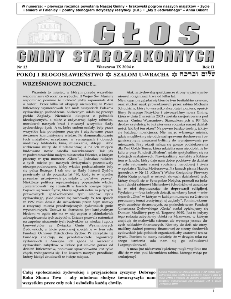 W numerze: • pierwsza rocznica powstania Naszej Gminy • krakowski pogrom naszych majątków • życie i śmierć w Falenicy • poufny stenogram dotyczący restytucji (c.d.) • „My z Jedwabnego” – Anna Bikont Nr 13 Warszawa IX 2004 r. POKÓJ I BŁOGOSŁAWIEŃSTWO Rok II SZALOM U-WRACHA WRZEŚNIOWE ROCZNICE... Wrzesień to miesiąc, w którym przede wszystkim wspominamy 65 rocznicę wybuchu II Wojny Św. Musimy wspominać, pomimo że ludzkość jakby zapomniała dziś o historii. Przez kilka lat okupacji niemieckiej w Polsce hitlerowcy wymordowali bez mała wszystkich Polaków żydowskiego pochodzenia. Nielicznym udało się przeżyć piekło Zagłady. Niemiecki okupant z pobudek ideologicznych, a także z ordynarnej żądzy rabunku, mordował naszych braci i niszczył wszystkie ślady żydowskiego życia. A te, które cudem ocalały, były przez wszystkie lata powojenne przejęte i użytkowane przez ówczesne komunistyczne władze. Po skomunalizowaniu tych majątków, urządzano w synagogach i domach modlitwy biblioteki, kina, mieszkania, sklepy... Albo rozbierano mury do fundamentów, a na ich miejscu budowano nowe osiedla mieszkaniowe. Tak jak w podwarszawskim małym miasteczku Falenica, o którym piszemy w tym numerze „Głosu”.... Jednakże niektóre z tych miejsc po naszych świątyniach pozostawały niezagospodarowane, jakby władze podświadomie bały się palca Bożego. I tak oto te ślady historii Żydów przetrwały aż do początku lat `90, kiedy to w wyniku przemian ustrojowych powstało „ państwo prawa”. Niektórzy politycy reprezentujący poprzednie władze „przefarbowali ' się i zasiedli w ławach nowego Sejmu. Pojawili się 'nowi' Żydzi, którzy ogłosili siebie za jedynych prawowitych spadkobierców tych śladów życia żydowskiego, jakie jeszcze się zachowały. W ten sposób w 1997 roku doszło do uchwalenia przez Sejm ustawy o restytucji mienia przedwojennych żydowskich gmin wyznaniowych. Ustawa ta obarczona jest kardynalnym błędem: w ogóle nie ma w niej zapisu o jakimkolwiek zabezpieczeniu tych zabytków. Ustawa pozwala natomiast na zupełne niszczenie tych budynków za wiedzą i zgodą konwertytów ze Związku Gmin Wyznaniowych Żydowskich, a także powołanej specjalnie w tym celu Fundacji Ochrony Dziedzictwa Żydów. W zarządzie tej Fundacji znajdują się przedstawiciele organizacji żydowskich z Ameryki. Ich zgoda na niszczenie żydowskich zabytków w Polsce jest stokroć gorsza od działań hitlerowców, ponieważ spowodowana jest tylko chęcią wzbogacenia się. I to kosztem naszych przodków, którzy kiedyś zbudowali te święte miejsca. Atak na żydowską spuściznę ze strony wyżej wymienionych organizacji trwa od kilku lat. Nie mogąc przyglądać się biernie tym bestialskim czynom, oraz słuchać nauk prowadzonych przez rabina Michaela Schudricha, który to wszystko akceptuje i popiera, opuściliśmy Synagogę Nożyków i utworzyliśmy nową Gminę, która w dniu 2 września 2003 r została zarejestrowana pod nazwą Gmina Wyznaniowa Starozakonnych w RP. Tak, drodzy czytelnicy, to już pierwsza rocznica naszej działalności. Jaki był ten okres? Na pewno bardzo trudny, jak życie każdego nowicjusza. Nie mając własnego miejsca, gdzie moglibyśmy się oddawać sprawom duchowym i organizacyjnym, zmuszeni byliśmy do wynajmowania pomieszczeń. Przy okazji należą się gorące podziękowania dla Pani Gołdy Tencer, która udzieliła nam nieodpłatnie lokalu w przy Fundacji „Shalom”, gdzie spotykaliśmy się na kolacjach szabatowych. Nawiązaliśmy kontakty z Rabinatem w Izraelu, który daje nam dobre podstawy do działań w celu ratowaniu naszej spuścizny narodowej i życia w zgodzie z Tablicą Mojżeszową. Na łamach pisma Hacofe (przedruk w Nr 12 „Głosu”) Wielce Czcigodny Pierwszy Rabin Kraju potępił w ostrych słowach działalność tych, którzy skupili się w Synagodze Nożyka, przeszli na judaizm i dzięki rabinowi Michaelowi Schudrichowi zarządzają w niej dopuszczając się deprawacji religijnej. Wydajemy — bez żadnych dotacji, na własny koszt — miesięcznik „Głos” w którym w każdym numerze na 2 stronie poruszamy temat „restytucyjnej zagłady”. Pomimo skromnych zasobów finansowych, za pośrednictwem Fundacji Cmentarza Żydowskiego „Gęsia” nadal opiekujemy się Domem Modlitwy przy ul. Targowej 50/52. Jest to jedyny tego rodzaju zabytkowy obiekt na Mazowszu, w którym znajdują się malowidła ścienne, ale wymaga jeszcze dużych nakładów finansowych. Niestety do dziś nie otrzymaliśmy żadnej pomocy finansowej ze strony środowisk żydowskich jak i polskich organizacji, aby uratować ten zabytek.. Pomimo to mamy nadzieję, że w drugim roku naszego istnienia uda nam się go odbudować i zagospodarować. A może już niebawem będziemy mogli wspólnie modlić się w nim pod kierunkiem rabina, którego wciąż poszukujemy? Całej społeczności żydowskiej i przyjaciołom życzymy Dobrego Roku Shana Tova – aby miodowa słodycz towarzyszyła nam wszystkim przez cały rok i osłodziła każdą chwilę. Gmina Wyznaniowa Starozakonnych w RP została zarejestrowana przez MSWiA na podstawie Ustawy z dnia 17 maja 1989r. i wpisana do Rejestru kościołów i innych związków wyznaniowych pod numerem 155 z dniem 2 września 2003r. 1 IX 2004 Głos Gminy Starozakonnych Rzeczypospolitej Polskiej Księga Strat W kolejnych wydaniach Głosu Gminy Starozakonnych w RP publikować będziemy „Księgę Strat” – rzecz o tyleż oryginalną, co i niestety smutną, ponieważ owa cykliczna publikacja prezentować będzie przypadki bezpowrotnego niszczenia materialnych pamiątek żydowskich, jakie ocalały z pożogi II wojny światowej. Będziemy przypominać nie tylko świątynie, cmentarze i zabytki zniszczone w czasie istnienia PRL. Głównym celem powstania „Księgi Strat” jest piętnowanie przypadków niszczenia dziedzictwa Żydów Polskich, do jakiego dochodzi, dzisiaj – w III Rzeczypo