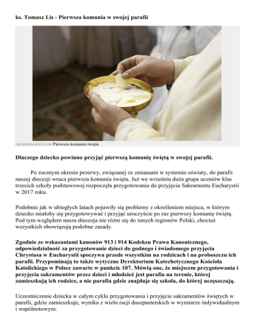 ks. Tomasz Lis - Pierwsza komunia w swojej parafii ARCHIWUM PRYWATNE Pierwsza komunia święta Dlaczego dziecko powinno przyjąć pierwszą komunię świętą w swojej parafii. Po rocznym okresie przerwy, związanej ze zmianami w systemie oświaty, do parafii naszej diecezji wraca pierwsza komunia święta. Już we wrześniu duża grupa uczniów klas trzecich szkoły podstawowej rozpoczęła przygotowania do przyjęcia Sakramentu Eucharystii w 2017 roku. Podobnie jak w ubiegłych latach pojawiły się problemy z określeniem miejsca, w którym dziecko miałoby się przygotowywać i przyjąć uroczyście po raz pierwszy komunię świętą. Pod tym względem nasza diecezja nie różni się do innych regionów Polski, chociaż wszystkich obowiązują podobne zasady. Zgodnie ze wskazaniami kanonów 913 i 914 Kodeksu Prawa Kanonicznego, odpowiedzialność za przygotowanie dzieci do godnego i świadomego przyjęcia Chrystusa w Eucharystii spoczywa przede wszystkim na rodzicach i na proboszczu ich parafii. Przypominają to także wytyczne Dyrektorium Katechetycznego Kościoła Katolickiego w Polsce zawarte w punkcie 107. Mówią one, że miejscem przygotowania i przyjęcia sakramentów przez dzieci i młodzież jest parafia na terenie, której zamieszkują ich rodzice, a nie parafia gdzie znajduje się szkoła, do której uczęszczają. Uczestniczenie dziecka w całym cyklu przygotowania i przyjęcie sakramentów świętych w parafii, gdzie zamieszkuje, wynika z wielu racji duszpasterskich w wymiarze indywidualnym i wspólnotowym. Podczas lipcowej rozmowy z polskimi biskupami w Krakowie, Ojciec św. Franciszek zapytany o rolę parafii we współczesnym świecie powiedział: „Parafia musi pozostać: jest strukturą, której nie wolno nam wyrzucić przez okno (…) Parafia jest nietykalna: musi pozostać jako miejsce kreatywności, odniesienia, macierzyństwa i tego wszystkiego. Tam należy realizować wszelką zdolność kreatywności”. Dziecko nawiązuje trwałe kontakty ze swoimi rówieśnikami i ze starszymi w środowisku, w którym wzrasta. Grupa rówieśnicza związana ze szkołą ulega bardzo szybko zmianie i nie daje tej trwałości relacji. Tymczasem w procesie dojrzewania na płaszczyźnie wiary bardzo ważne jest zakorzenienie we wspólnocie i utożsamianie się z nią. Potrzebny jest stały i pewny punkt odniesienia, osoby na które można zawsze liczyć, od których można się uczyć. W pierwszej kolejności powinni to być rodzice. Jeżeli od najmłodszych lat zabierają oni ze sobą do kościoła parafialnego własne dzieci, razem z nimi uczestniczą w Mszy św., na ich oczach przyjmują komunię św., będzie czymś naturalnym, że również dzieci przyjmą pierwszą komunię św. w tej samej świątyni. To pomoże im dalej rozwijać harmonijnie życie religijne. Eucharystia będzie postrzegana nie jako coś „od wielkiego święta”, ale jako pokarm otrzymany od Boga, którym trzeba stale się karmić, bo bez niego trudno jest być prawdziwym chrześcijaninem. Konsekwencją zaniedbań religijnych rodziców oraz braku związku rodziny z parafią, jest to, że już w krótkim czasie po przyjęciu Pierwszej Komunii część dzieci pojawia się w kościele tylko sporadycznie. Przygotowanie do sakramentu we własnej parafii sprzyja włączeniu dziecka w grupy duszpasterskie takie jak: ministranci, schole parafialne, oaza, które pomagają pogłębiać wiarę. Ma także wpływ na żywotność parafii. Dzień przyjęcia przez dzieci pierwszej komunii świętej jest ponadto bardzo ważnym wydarzeniem w życiu całej wspólnoty. To święto całej parafii, która zostaje w ten sposób umocniona i ubogacona. Takie momenty jednoczą starszych i młodszych bez względu na więzy krwi i bezpośrednią znajomość. A przecież są w naszej diecezji parafie, w których nie ma szkół podstawowych. One również mają prawo przeżywać doniosłe wydarzenie, jakim jest pierwsza komunia święta.