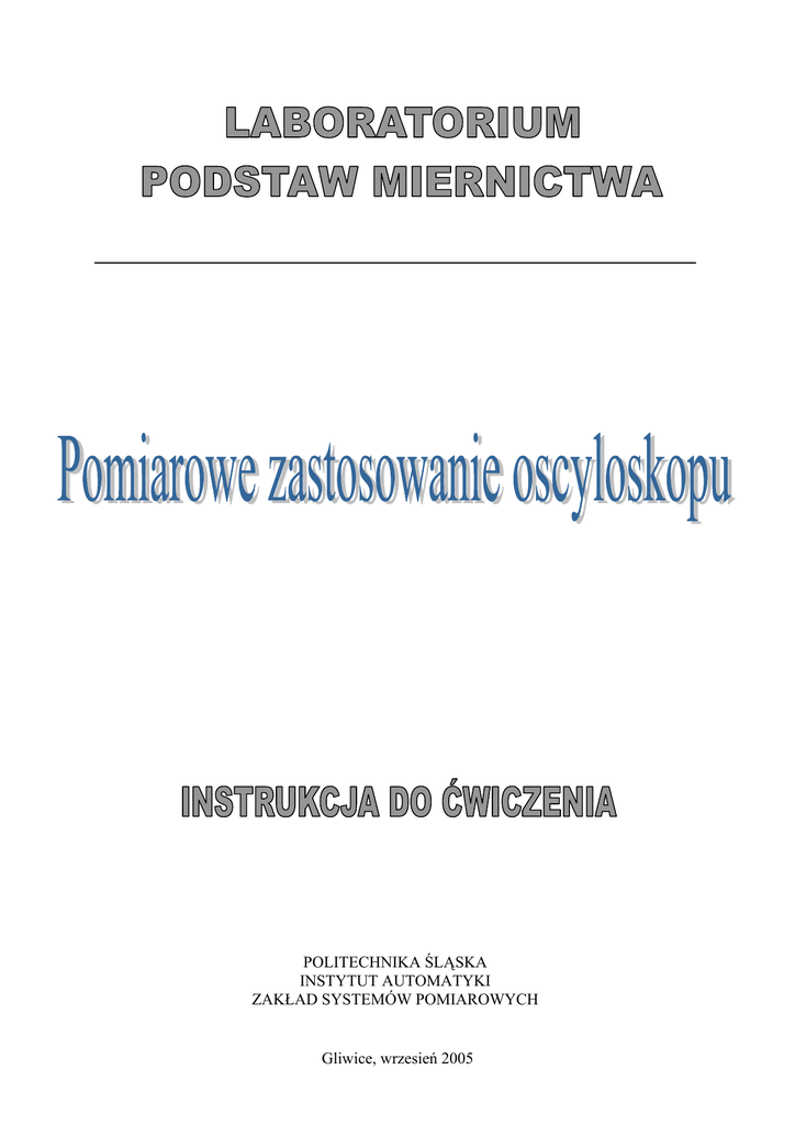 POLITECHNIKA ŚLĄSKA INSTYTUT AUTOMATYKI ZAKŁAD SYSTEMÓW POMIAROWYCH Gliwice, wrzesień 2005 Pomiarowe zastosowanie oscyloskopu Cel ćwiczenia Celem ćwiczenia jest zapoznanie się z budową, zasadą działania oraz funkcjami pomiarowymi oscyloskopu analogowego. Zadania 1. Zapoznać się z instrukcją oscyloskopu w zakresie jego funkcji. 2. Przenieść do protokołu dane techniczne charakteryzujące możliwości użytkowe i pomiarowe oscyloskopu (zaznaczone w instrukcji dostępnej na stanowisku). 3. Włączyć oscyloskop. Ustawić taką funkcję pomiarową, by możliwe było obserwowanie nieruchomej plamki. Ustawić możliwie najlepszą ostrość i średnią jasność, następnie dokonać pomiaru (oceny) średnicy plamki. 4. Podać na wejście sygnał sinusoidalny o takiej częstotliwości, by na lampie oscyloskopowej widoczne były 1 – 2 okresy, a sygnał zajmował ¾ wysokości. Przesunąć obraz w prawo o ok. 1 cm. Ustawić tryb automatycznego wyzwalania podstawy czasu. Obserwować przebieg regulując potencjometrem poziom wyzwalania aż do zerwania synchronizacji. Zmienić zbocze wyzwalające generator podstawy czasu. Przełączyć podstawę czasu w tryb normalny (normal) i poczynić obserwacje jak poprzednio. Zanotować spostrzeżenia. Z czego wynika zauważona różnica? 5. Uaktywnić dwa kanały pomiarowe w trybie czoperowym, na wejścia podać sygnały o różnych i małych częstotliwościach (ok. 10 Hz), a następnie dużych częstotliwościach (ok. 100 kHz). Uaktywnić tryb pracy dwukanałowej alternatywnej. Powtórzyć obserwacje jak w trybie czoperowym. Porównać wyniki. 6. Poczynając od najwolniejszej podstawy czasu, znaleźć taką jej wartość, dla której możliwe jest obserwowanie obu przebiegów i nie da się wyraźnie zaobserwować, że oba przebiegi wyświetlane są oddzielnie (nie występuje „migotanie” przebiegów). Obliczyć częstotliwość „odświeżania” obrazu zakładając, że okres jest równy czasowi przelotu plamki. Porównać wynik z częstotliwością stosowaną w telewizji i monitorach komputerowych. 7. Ponownie uruchomić tryb pracy jednokanałowej. Ustawić na ekranie oscyloskopu obraz obejmujący ok. 20 okresów sygnału trójkątnego o częstotliwości np. 100 kHz. Uaktywnić opóźnioną podstawę czasu – B tak, aby widoczny był równocześnie obraz z podstawy czasu A oraz B. Ustawić współczynnik podstawy czasu B umożliwiający obserwację tylko jednego „wierzchołka” sygnału trójkątnego. Zmieniając czas opóźnienia podstawy B zbadać kolejno wszystkie „wierzchołki” sygnału. 8. Uruchomić oscyloskop w trybie pracy XY. Na wejścia podać dwa niezależne sygnały sinusoidalne o niewielkiej częstotliwości (ok. 6 do 10 Hz). Zaobserwować figury Lissajous, gdy stosunek częstotliwości sygnałów podawanych na wejścia X i Y wynoszą: 1:1, 1:2, 1:3, itd. Przerysować uzyskane przebiegi oraz zanotować częstotliwości sygnałów. 9. Zapoznać się z definicją zwisów wg. Normy PN-86/06502. Podać na wejście sygnał prostokątny o częstotliwości ok. 80 Hz i wypełnieniu 50%. Wejście ustawić w tryb AC. Dokonać pomiaru wielkości A i ∆A, oraz czasu trwania sygnału. Wyznaczyć częstotliwość, dla której zwisy mieszczą się w błędzie podstawowym oscyloskopu. Pytania kontrolne 1. 2. 3. 4. 5. 6. 7. Do jakich celów służy oscyloskop? Z jakich podzespołów składa się oscyloskop? Jaki kształt ma napięcie podawane na płytki odchylające X w trybie pracy Y(t)? Jaka jest różnica w pracy oscyloskopu w trybie czoperowym i alternatywnym? Na czym polega synchronizacja obrazu? Jak działa opóźniona podstawa czasu? W jaki sposób powstają figury Lissajous? Do jakich zadań pomiarowych można je wykorzystywać? 8. Co to jest zwis oraz co powoduje jego powstanie? Literatura 1. 2. 3. 4. Piotrowski J.: Podstawy miernictwa, WNT, Warszawa, 2002, ss. 257-264 Marcyniuk A.: Podstawy miernictwa elektrycznego, Wyd. Pol. Śl., Gliwice, 2002 Rydzewski J.: Pomiary Oscyloskopowe, WNT, Warszawa, 1994, ss. 33-38 Norma PN-86/06502 pt.: „Oscyloskopy elektroniczne. Ogólne wymagania i badania.” oraz oryginalny wykaz podstawowych parametrów oscyloskopu
