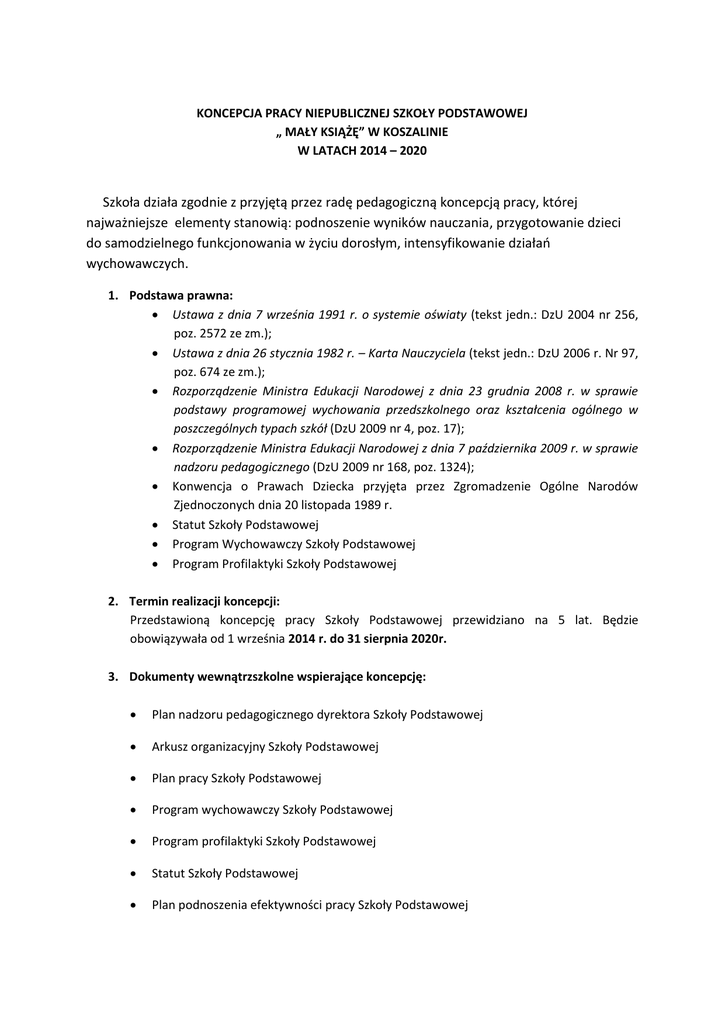 KONCEPCJA PRACY NIEPUBLICZNEJ SZKOŁY PODSTAWOWEJ „ MAŁY KSIĄŻĘ” W KOSZALINIE W LATACH 2014 – 2020 Szkoła działa zgodnie z przyjętą przez radę pedagogiczną koncepcją pracy, której najważniejsze elementy stanowią: podnoszenie wyników nauczania, przygotowanie dzieci do samodzielnego funkcjonowania w życiu dorosłym, intensyfikowanie działań wychowawczych. 1. Podstawa prawna: Ustawa z dnia 7 września 1991 r. o systemie oświaty (tekst jedn.: DzU 2004 nr 256, poz. 2572 ze zm.); Ustawa z dnia 26 stycznia 1982 r. – Karta Nauczyciela (tekst jedn.: DzU 2006 r. Nr 97, poz. 674 ze zm.); Rozporządzenie Ministra Edukacji Narodowej z dnia 23 grudnia 2008 r. w sprawie podstawy programowej wychowania przedszkolnego oraz kształcenia ogólnego w poszczególnych typach szkół (DzU 2009 nr 4, poz. 17); Rozporządzenie Ministra Edukacji Narodowej z dnia 7 października 2009 r. w sprawie nadzoru pedagogicznego (DzU 2009 nr 168, poz. 1324); Konwencja o Prawach Dziecka przyjęta przez Zgromadzenie Ogólne Narodów Zjednoczonych dnia 20 listopada 1989 r. Statut Szkoły Podstawowej Program Wychowawczy Szkoły Podstawowej Program Profilaktyki Szkoły Podstawowej 2. Termin realizacji koncepcji: Przedstawioną koncepcję pracy Szkoły Podstawowej przewidziano na 5 lat. Będzie obowiązywała od 1 września 2014 r. do 31 sierpnia 2020r. 3. Dokumenty wewnątrzszkolne wspierające koncepcję: Plan nadzoru pedagogicznego dyrektora Szkoły Podstawowej Arkusz organizacyjny Szkoły Podstawowej Plan pracy Szkoły Podstawowej Program wychowawczy Szkoły Podstawowej Program profilaktyki Szkoły Podstawowej Statut Szkoły Podstawowej Plan podnoszenia efektywności pracy Szkoły Podstawowej PRIORYTETY SZKOŁY Cele ogólne a) Wykorzystanie istniejących oraz poszukiwanie nowych możliwości kierowania szkołą i zapewnienia właściwego obiegu informacji. b) Współpraca ze środowiskiem lokalnym, organami samorządowymi i pozyskanie ich wsparcia dla realizacji zadań szkoły. Cele etapowe a) Kontynuowanie działań zmierzających do zapewnienia bezpiecznego pobytu ucznia w szkole. b) Podejmowanie skutecznych działań, mających na celu stworzenie właściwych warunków do wszechstronnego rozwoju ucznia. Cele na najbliższy rok szkolny a) Podnoszenie efektywności pracy dydaktycznej. b) Wspieranie rodziców w wychowaniu dziecka. c) Kształtowanie postaw i nawyków w duchu poszanowania godności człowieka, tradycji narodowych, regionalnych, szkolnych i rodzinnych. d) Przygotowanie uczniów do aktywnego udziału w życiu społecznym i tolerancji dla innych. Priorytety w pracy wychowawczej szkoły a) rozumienie dobrego i złego zachowania b) umiejętność funkcjonowania w grupie społecznej c) zdrowy tryb życia 4. Charakterystyka szkoły: Lokalizacja szkoły Szkoła jest zlokalizowana w cichej i spokojnej dzielnicy Koszalina, nieopodal lasu. W pobliskiej odległości od szkoły znajduje się przystanek autobusowy sieci MZK, co ułatwia dojazd do placówki. Budynek szkoły otoczony jest atrakcyjną zielenią. Niedaleko od szkoły w parku znajduje się boisko do piłki siatkowej. Przy budynku szkoły uczniowie mogą korzystać z placu rekreacyjnego. Cały teren placówki jest ogrodzony i bezpieczny dla dzieci, teren szkoły znajduje się pod obserwacją kamer co zapewnia bezpieczeństwo przebywających w szkole uczniów. Baza szkoły Szkoła jest małą kameralną placówką, na terenie której stworzono uczniom optymalne warunki nauki. Sale lekcyjne są jasne, nowocześnie urządzone, wyposażone w sprzęt komputerowy i audiowizualny oraz w nowoczesne pomoce dydaktyczne. Szkoła ma stały dostęp do Internetu. Organizacja pracy szkoły Organizacja pracy szkoły umożliwia uczniom naukę uwzględniając ich indywidualne potrzeby. Mocne strony szkoły Słabe strony szkoły 1) Kadra pedagogiczna w całości posiada kwalifikacje do nauczanych przedmiotów. 2) Oferta zajęć pozalekcyjnych w oczach uczniów jest interesująca i spełnia ich oczekiwania. 3) W szkole prowadzone są zajęcia dla uczniów wymagających wsparcia specjalistów: gimnastyka korekcyjna, zajęcia dydaktyczno-wyrównawcze, logopedyczne zajęcia z teorii umysłu 4) W szkole opracowano program wychowawczy i profilaktyki w oparciu o zdiagnozowane potrzeby społeczności szkolnej. Są one systematycznie realizowane i poddawane bieżącej ewaluacji i modyfikacji. 5) W szkole obowiązują spójne zasady oceniania zapisane w wewnątrzszkolnych zasadach oceniania, na podstawie których nauczyciele konstruują przedmiotowe zasady oceniania. 6) W każdym roku szkolnym przygotowywany jest ciekawy i bogaty kalendarz imprez i uroczystości szkolnych. 7) Środowisko lokalne pozytywnie postrzega szkołę jako instytucję nie tylko edukacyjną, ale również kulturalną. 8) W szkole funkcjonuje monitoring przyczyniające się do wzrostu bezpieczeństwa uczniów szkole. 9) W szkole funkcjonują estetyczne i zadbane pomieszczenia 1) Małą ilość pomieszczeń szkolnych oraz ograniczona ilość miejsc w placówce dla nowych uczniów. 2) Ograniczenia społeczne i edukacyjne dzieci z autyzmem. 5. Misja i wizja szkoły: a) Misja Jesteśmy Niepubliczną Szkołą Podstawową znajdującą się w Koszalinie przy ulicy Dywizji Drezdeńskiej 13. Szkoła nosi imię „ Mały Książę” Uczniami szkoły są dzieci z wysoko funkcjonującym autyzmem oraz dzieci ze sprzężoną niepełnosprawnością . Chcemy stworzyć przyjazną szkołę, w której każdy będzie mógł realizować się na miarę własnych potrzeb i możliwości. Nasz cel osiągniemy współpracując ze wszystkimi środowiskami nad zapewnieniem jak najlepszych warunków rozwoju uczniów i nauczycieli. Chcemy, aby nasi absolwenci wyróżniali się kulturą osobistą, szacunkiem, uczciwością i odpowiedzialnością oraz tolerancją dla każdego człowieka. Rozbudzamy w naszych uczniach ciekawość otaczającego świata, uczymy ich współdziałania. Nasz zespół wyróżnia atmosfera twórczej