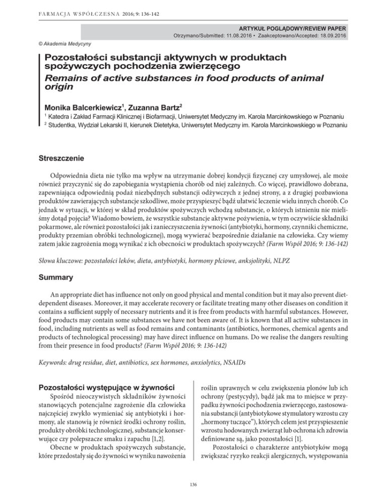 136 FA R M A C J A W S P Ó Ł C Z E S N A 2016; 9: 136-142 ARTYKUŁ POGLĄDOWY/REVIEW PAPER Otrzymano/Submitted: 11.08.2016 • Zaakceptowano/Accepted: 18.09.2016 © Akademia Medycyny Pozostałości substancji aktywnych w produktach spożywczych pochodzenia zwierzęcego Remains of active substances in food products of animal origin Monika Balcerkiewicz1, Zuzanna Bartz2 1 2 Katedra i Zakład Farmacji Klinicznej i Biofarmacji, Uniwersytet Medyczny im. Karola Marcinkowskiego w Poznaniu Studentka, Wydział Lekarski II, kierunek Dietetyka, Uniwersytet Medyczny im. Karola Marcinkowskiego w Poznaniu Streszczenie Odpowiednia dieta nie tylko ma wpływ na utrzymanie dobrej kondycji fizycznej czy umysłowej, ale może również przyczynić się do zapobiegania wystąpienia chorób od niej zależnych. Co więcej, prawidłowo dobrana, zapewniająca odpowiednią podaż niezbędnych substancji odżywczych z jednej strony, a z drugiej pozbawiona produktów zawierających substancje szkodliwe, może przyspieszyć bądź ułatwić leczenie wielu innych chorób. Co jednak w sytuacji, w której w skład produktów spożywczych wchodzą substancje, o których istnieniu nie mieliśmy dotąd pojęcia? Wiadomo bowiem, że wszystkie substancje aktywne pożywienia, w tym oczywiście składniki pokarmowe, ale również pozostałości jak i zanieczyszczenia żywności (antybiotyki, hormony, czynniki chemiczne, produkty przemian obróbki technologicznej), mogą wywierać bezpośrednie działanie na człowieka. Czy wiemy zatem jakie zagrożenia mogą wynikać z ich obecności w produktach spożywczych? (Farm Współ 2016; 9: 136-142) Słowa kluczowe: pozostałości leków, dieta, antybiotyki, hormony płciowe, anksjolityki, NLPZ Summary An appropriate diet has influence not only on good physical and mental condition but it may also prevent dietdependent diseases. Moreover, it may accelerate recovery or facilitate treating many other diseases on condition it contains a sufficient supply of necessary nutrients and it is free from products with harmful substances. However, food products may contain some substances we have not been aware of. It is known that all active substances in food, including nutrients as well as food remains and contaminants (antibiotics, hormones, chemical agents and products of technological processing) may have direct influence on humans. Do we realise the dangers resulting from their presence in food products? (Farm Współ 2016; 9: 136-142) Keywords: drug residue, diet, antibiotics, sex hormones, anxiolytics, NSAIDs Pozostałości występujące w żywności roślin uprawnych w celu zwiększenia plonów lub ich ochrony (pestycydy), bądź jak ma to miejsce w przypadku żywności pochodzenia zwierzęcego, zastosowania substancji (antybiotykowe stymulatory wzrostu czy „hormony tuczące”), których celem jest przyspieszenie wzrostu hodowanych zwierząt lub ochrona ich zdrowia definiowane są, jako pozostałości [1]. Pozostałości o charakterze antybiotyków mogą zwiększać ryzyko reakcji alergicznych, występowania Spośród nieoczywistych składników żywności stanowiących potencjalne zagrożenie dla człowieka najczęściej zwykło wymieniać się antybiotyki i hormony, ale stanowią je również środki ochrony roślin, produkty obróbki technologicznej, substancje konserwujące czy polepszacze smaku i zapachu [1,2]. Obecne w produktach spożywczych substancje, które przedostały się do żywności w wyniku nawożenia 136 FA R M A C J A W S P Ó Ł C Z E S N A 2016; 9: 136-142 chorób grzybiczych oraz co szczególnie obecnie niepokojące powstawania i narastania oporności drobnoustrojów na te antybiotyki. Spożywanie produktów zawierających pozostałości substancji hormonalnych może natomiast prowadzić do zaburzeń gospodarki hormonalnej człowieka [2]. Nasuwa się, zatem pytanie: skoro znane są niekorzystne dla ludzi skutki obecności tych substancji w produktach spożywczych, dlaczego tam się one pojawiają? hodowlanych. Stwierdzono wówczas, że antybiotyki podawane zwierzętom z paszą mogą mieć inne niż terapeutyczne działanie, w tym zwiększenie przyrostów dziennych czy lepsze wykorzystanie paszy. Z tego powodu dodatki te zyskały nazwę antybiotykowych stymulatorów wzrostu (ASW). Obserwacje korzystnych właściwości antybiotyków w hodowli zwierząt sprawiły, że wkrótce potem były one szeroko wykorzystywane w praktyce żywieniowej zwierząt hodowlanych [3]. Świetność antybiotyków przypadała na lata 60. i 70. ubiegłego wieku, jednak w niedługim czasie okazało się, że ich stosowanie stało się przyczyną wielu problemów, w tym najpoważniejszego, lekooporności [3]. W konsekwencji stopniowo wycofywano się ze stosowania ASW w hodowli zwierząt, jednak równocześnie zaobserwowano niepokojący wzrost zużycia antybiotyków w celach terapeutycznych u zwierząt hodowlanych [3]. Istotnym skutkiem stosowania antybiotyków u zwierząt hodowlanych okazało się występowanie ich pozostałości w surowcach i produktach spożywczych pochodzenia zwierzęcego. Konsekwencje z tego wynikające to przede wszystkim wspomniana wcześniej oporność drobnoustrojów, ale również ryzyko bezpośredniego oddziaływania na organizm w tym wpływ na mikroflorę jelitową [3] (tabela II). Substancje lecznicze W żywności pochodzenia zwierzęcego, oprócz leków weterynaryjnych, tj. leków uspokajających i niesteroidowych leków przeciwzapalnych, mogą zostać zidentyfi kowane inne biologicznie aktywne substancje. Najczęściej wykrywanymi substancjami leczniczymi są antybiotyki, hormony płciowe, tyreostatyki i β2-sympatykomimetyki, które wykorzystuje się jako dodatki do pasz celem zintensyfikowania wzrostu a przez to zwiększenia produktywności [1]. Antybiotyki Zastosowanie antybiotyków w hodowli zwierząt wywołuje wiele korzystnych efektów, począwszy od wpływu na zdrowie zwierząt i właściwości stymulujące ich wzrost, skończywszy na korzyściach pr