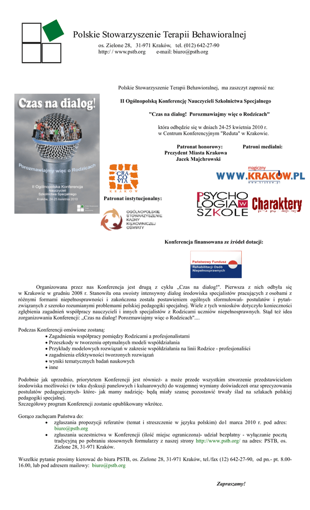Polskie Stowarzyszenie Terapii Behawioralnej os. Zielone 28, 31-971 Kraków, tel. (012) 642-27-90 http:/ / www.pstb.org e-mail: [email protected] Polskie Stowarzyszenie Terapii Behawioralnej, ma zaszczyt zaprosić na: II Ogólnopolską Konferencję Nauczycieli Szkolnictwa Specjalnego "Czas na dialog! Porozmawiajmy więc o Rodzicach" która odbędzie się w dniach 24-25 kwietnia 2010 r. w Centrum Konferencyjnym "Reduta" w Krakowie. Patronat honorowy: Prezydent Miasta Krakowa Jacek Majchrowski Patroni medialni: Patronat instytucjonalny: Konferencja finansowana ze źródeł dotacji: Organizowana przez nas Konferencja jest drugą z cyklu „Czas na dialog!". Pierwsza z nich odbyła się w Krakowie w grudniu 2008 r. Stanowiła ona swoisty intensywny dialog środowiska specjalistów pracujących z osobami z róŜnymi formami niepełnosprawności i zakończona została postawieniem ogólnych sformułowań- postulatów i pytańzwiązanych z szeroko rozumianymi problemami polskiej pedagogiki specjalnej. Wiele z tych wniosków dotyczyło konieczności zgłębienia zagadnień współpracy nauczycieli i innych specjalistów z Rodzicami uczniów niepełnosprawnych. Stąd teŜ idea zorganizowania Konferencji: „Czas na dialog! Porozmawiajmy więc o Rodzicach".... Podczas Konferencji omówione zostaną: • Zagadnienia współpracy pomiędzy Rodzicami a profesjonalistami • Przeszkody w tworzeniu optymalnych modeli współdziałania • Przykłady modelowych rozwiązań w zakresie współdziałania na linii Rodzice - profesjonaliści • zagadnienia efektywności tworzonych rozwiązań • wyniki tematycznych badań naukowych • inne Podobnie jak uprzednio, priorytetem Konferencji jest równieŜ- a moŜe przede wszystkim stworzenie przedstawicielom środowiska moŜliwości (w toku dyskusji panelowych i kuluarowych) do wzajemnej wymiany doświadczeń oraz sprecyzowania postulatów pedagogicznych- które- jak mamy nadzieję- będą miały szansę pozostawić trwały ślad na szlakach polskiej pedagogiki specjalnej. Szczegółowy program Konferencji zostanie opublikowany wkrótce. Gorąco zachęcam Państwa do: • zgłaszania propozycji referatów (temat i streszczenie w języku polskim) do1 marca 2010 r. pod adres: [email protected] • zgłaszania uczestnictwa w Konferencji (ilość miejsc ograniczona)- udział bezpłatny - wyłączanie pocztą tradycyjną po pobraniu stosownych formularzy z naszej strony http://www.pstb.org/ na adres: PSTB, os. Zielone 28, 31-971 Kraków. Wszelkie pytanie prosimy kierować do biura PSTB, os. Zielone 28, 31-971 Kraków, tel./fax (12) 642-27-90, od pn.- pt. 8.0016.00, lub pod adresem mailowy: [email protected] Zapraszamy!