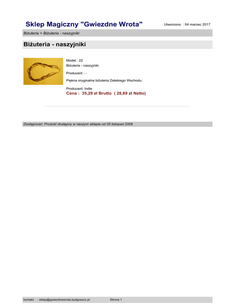 Sklep Magiczny "Gwiezdne Wrota" Biżuteria > Biżuteria - naszyjniki Biżuteria - naszyjniki Model : 22 Biżuteria - naszyjniki Producent : Piękna oryginalna biżuteria Dalekiego Wschodu. Producent: Indie Cena : 35,29 zł Brutto ( 28,69 zł Netto) Dostępność: Produkt dostępny w naszym sklepie od 05 listopad 2008 kontakt : - [email protected] Strona 1 Utworzono : 04 marzec 2017