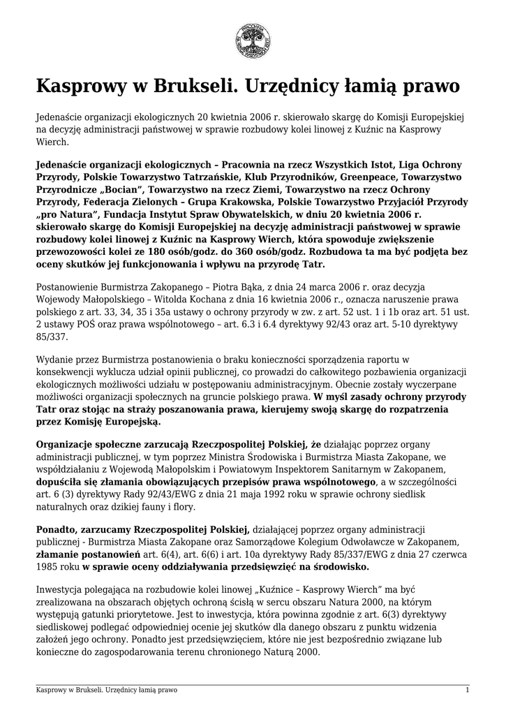 Kasprowy w Brukseli. Urzędnicy łamią prawo Jedenaście organizacji ekologicznych 20 kwietnia 2006 r. skierowało skargę do Komisji Europejskiej na decyzję administracji państwowej w sprawie rozbudowy kolei linowej z Kuźnic na Kasprowy Wierch. Jedenaście organizacji ekologicznych – Pracownia na rzecz Wszystkich Istot, Liga Ochrony Przyrody, Polskie Towarzystwo Tatrzańskie, Klub Przyrodników, Greenpeace, Towarzystwo Przyrodnicze „Bocian”, Towarzystwo na rzecz Ziemi, Towarzystwo na rzecz Ochrony Przyrody, Federacja Zielonych – Grupa Krakowska, Polskie Towarzystwo Przyjaciół Przyrody „pro Natura”, Fundacja Instytut Spraw Obywatelskich, w dniu 20 kwietnia 2006 r. skierowało skargę do Komisji Europejskiej na decyzję administracji państwowej w sprawie rozbudowy kolei linowej z Kuźnic na Kasprowy Wierch, która spowoduje zwiększenie przewozowości kolei ze 180 osób/godz. do 360 osób/godz. Rozbudowa ta ma być podjęta bez oceny skutków jej funkcjonowania i wpływu na przyrodę Tatr. Postanowienie Burmistrza Zakopanego – Piotra Bąka, z dnia 24 marca 2006 r. oraz decyzja Wojewody Małopolskiego – Witolda Kochana z dnia 16 kwietnia 2006 r., oznacza naruszenie prawa polskiego z art. 33, 34, 35 i 35a ustawy o ochrony przyrody w zw. z art. 52 ust. 1 i 1b oraz art. 51 ust. 2 ustawy POŚ oraz prawa wspólnotowego – art. 6.3 i 6.4 dyrektywy 92/43 oraz art. 5-10 dyrektywy 85/337. Wydanie przez Burmistrza postanowienia o braku konieczności sporządzenia raportu w konsekwencji wyklucza udział opinii publicznej, co prowadzi do całkowitego pozbawienia organizacji ekologicznych możliwości udziału w postępowaniu administracyjnym. Obecnie zostały wyczerpane możliwości organizacji społecznych na gruncie polskiego prawa. W myśl zasady ochrony przyrody Tatr oraz stojąc na straży poszanowania prawa, kierujemy swoją skargę do rozpatrzenia przez Komisję Europejską. Organizacje społeczne zarzucają Rzeczpospolitej Polskiej, że działając poprzez organy administracji publicznej, w tym poprzez Ministra Środowiska i Burmistrza Miasta Zakopane, we współdziałaniu z Wojewodą Małopolskim i Powiatowym Inspektorem Sanitarnym w Zakopanem, dopuściła się złamania obowiązujących przepisów prawa wspólnotowego, a w szczególności art. 6 (3) dyrektywy Rady 92/43/EWG z dnia 21 maja 1992 roku w sprawie ochrony siedlisk naturalnych oraz dzikiej fauny i flory. Ponadto, zarzucamy Rzeczpospolitej Polskiej, działającej poprzez organy administracji publicznej - Burmistrza Miasta Zakopane oraz Samorządowe Kolegium Odwoławcze w Zakopanem, złamanie postanowień art. 6(4), art. 6(6) i art. 10a dyrektywy Rady 85/337/EWG z dnia 27 czerwca 1985 roku w sprawie oceny oddziaływania przedsięwzięć na środowisko. Inwestycja polegająca na rozbudowie kolei linowej „Kuźnice – Kasprowy Wierch” ma być zrealizowana na obszarach objętych ochroną ścisłą w sercu obszaru Natura 2000, na którym występują gatunki priorytetowe. Jest to inwestycja, która powinna zgodnie z art. 6(3) dyrektywy siedliskowej podlegać odpowiedniej ocenie jej skutków dla danego obszaru z punktu widzenia założeń jego ochrony. Ponadto jest przedsięwzięciem, które nie jest bezpośrednio związane lub konieczne do zagospodarowania terenu chronionego Naturą 2000. Kasprowy w Brukseli. Urzędnicy łamią prawo 1 Rozbudowa kolei linowej nie służy również celom ochrony przyrody w parku narodowym, a jej realizacja spowoduje naruszenie zakazów obowiązujących na jego terenie (w tym zakazów, o których mowa w art. 15). Zgodnie z obowiązującym prawem rozbudowa kolei linowej na terenie Tatrzańskiego PN i obszarze Natura 2000 – „Tatry”, wymaga przeprowadzenia tzw. oceny habitatowej, która wynika z postanowień prawa wspólnotowego (Dyrektywa Habitatowa 92/43/EWG). Zgodnie z art. 6 ust. 3 Dyrektywy z dnia 21 maja 1992 r. w sprawie ochrony siedlisk naturalnych oraz dzikiej fauny i flory jasno wskazane jest, że każde przedsięwzięcie, które nie jest bezpośrednio związane lub konieczne dla ochrony walorów ostoi Natura 2000, ale które może na nie w istotny sposób oddziaływać, podlega odpowiedniej ocenie skutków z punktu widzenia założeń ochrony. Przedsięwzięcie może zostać zrealizowane dopiero po upewnieniu się, że nie wpłynie ono niekorzystnie na dany teren, po uzyskaniu opinii całego społeczeństwa. W świetle orzecznictwa Europejskiego Trybunału Sprawiedliwości (ETS) nawet przedsięwzięcia o małej skali mogą mieć znaczący wpływ na środowisko, jeśli są zlokalizowane na obszarach, na których elementy środowiska, wymienione w art. 3 dyrektywy 85/337, takie jak fauna, flora, gleba, woda, klimat, dziedzictwo kulturowe, są wrażliwe na najmniejsze zmiany (C – 392/26 p.66). W przypadku rozbudowy kolei linowej na Kasprowy Wierch orzecznictwo ETS powinno mieć zastosowanie. W świetle obowiązujących przepisów oraz orzecznictwa ETS-u każde przedsięwzięcie, które niesie z sobą ryzyko naruszenia założeń ochrony obszaru Natura 2000, należy uznać za przedsięwzięcie mogące oddziaływać na przedmiotowy obszar w sposób istotny. „Odpowiednia ocena wpływu” oznacza, zgodnie z orzecznictwem ETS-u, że przed udzieleniem pozwolenia na rozbudowę powinny zostać określone, zgodnie z najlepszą wiedzą naukową w tej dziedzinie, wszystkie aspekty przedsięwzięcia, mogące osobno lub w połączeniu z innymi przedsięwzięciami oddziaływać na założenia ochrony tego obszaru (C-127/02, pkt. 61). Burmistrz Miasta Zakopane, Wojewoda Małopolski, Powiatowy Inspektor Sanitarny w Zakopanem nie dokonali oceny „istotności wpływu na siedlisko” Natury 2000. Tym samym, Burmistrz nie chciał dopuścić do wykonania raportu OOŚ, pomimo pełnienia przez niego funkcji członka w Państwowej Radzie Ochrony Przyrody oraz członka Rady Naukowej Tatrzańskiego Parku Narodowego. Warto zwrócić uwagę na fakt, iż Burmistrz Zakopanego oraz Wojewoda Ma