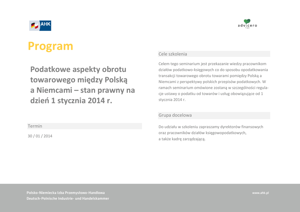 Program Podatkowe aspekty obrotu towarowego między Polską a Niemcami – stan prawny na dzień 1 stycznia 2014 r. Cele szkolenia Celem tego seminarium jest przekazanie wiedzy pracownikom działów podatkowo-księgowych co do sposobu opodatkowania transakcji towarowego obrotu towarami pomiędzy Polską a Niemcami z perspektywy polskich przepisów podatkowych. W ramach seminarium omówione zostaną w szczególności regulacje ustawy o podatku od towarów i usług obowiązujące od 1 stycznia 2014 r. Grupa docelowa Termin 30 / 01 / 2014 Do udziału w szkoleniu zapraszamy dyrektorów finansowych oraz pracowników działów księgowopodatkowych, a także kadrę zarządzającą. Agenda I. Informacje wprowadzające [ 0,25h] a. Transakcje z kontrahentami z Niemiec b. Transakcje w ramach podmiotów z grupy c. Obrót towarami w ramach jednego przedsiębiorstwa d. Dokumenty w obrocie towarowym II. Zagadnienia dotyczące podatku od towarów i usług [2,5h] a. Najważniejsze zmiany w ustawie o podatku od towarów i usług w 2014 r. b. Polskie regulacje dotyczące wewnątrzwspólnotowego nabycia i wewnątrzwspólnotowej dostawy towarów (WNT i WDT) – stan prawny na dzień 1 stycznia 2014 r. b. Przesunięcia własnych towarów do / z Polski c. Obowiązki dokumentacyjne d. Transakcje łańcuchowe e. Transakcje trójstronne f. Magazyn konsygnacyjny g. Specjalne regulacje dotyczące dostawy towarów z montażem i usług budowlanomontażowych h. Usługi spedycyjne i. Przeniesienie obowiązku podatkowego na nabywcę – zastosowanie mechanizmu reverse charge j. Obrót towarami z Polską i stałe miejsce prowadzenia działalności w świetle podatku VAT k. Rejestracja na cele podatku od towarów i usług w Polsce (terminy, numer VAT, przedstawiciel podatkowy) l. Zwrot podatku naliczonego – możliwe procedury m. Kary za brak rejestracji / odpowiedniej dokumentacji i okresy przedawnienia III. Zagadnienia dotyczące podatków dochodowych [0,75h] a. Stałe miejsce prowadzenia działalności gospodarczej – zakład w rozumieniu umowy o unikaniu podwójnego opodatkowania zawartej między Rzecząpospolitą Polską a Republiką Federalną Niemiec b. Rejestracja na cele podatku dochodowego od osób prawnych i od osób fizycznych w Polsce c. Kształtowanie umów (umowa spedycji, umowa licencyjna na oprogramowanie, umowa podwykonawstwa, ogólne warunki umów) d. Dokumentacja cen transferowych przy obrocie towarowym e. Regulacje dotyczące opodatkowania przeniesienia działalności gospodarczej do innego kraju w ramach optymalizacji obciążeń podatkowych i przepisy dotyczące opodatkowanie zagranicznych spółek kontrolowanych (CFC) IV. Obowiązek składania informacji statystycznych - INTRASTAT [0,25h] V. Przykłady praktyczne – Case Study [0,5h] Referenci Katarzyna Klimkiewicz-Deplano jest Partnerem w Advicero Tax. Jest licencjonowanym doradcą podatkowym od 2003 r., doświadczenie zawodowe zdobywa od 2000 r. W ciągu swojej kariery zawodowej współpracowała z międzynarodowymi firmami konsultingowymi, w tym z tzw. Big 4. Katarzyna specjalizuje się w doradztwie transakcyjnym. Ma bogate doświadczenie w zakresie transakcji restrukturyzacyjnych, a także nabywaniu i zbywaniu aktywów lub ich grup. Doradza w zakresie bieżących kwestii podatkowych dla podmiotów m.in. z sektora handlu detalicznego, nieruchomościowego, oraz energetycznego. Katarzyna posiada również bogate doświadczenie w prowadzeniu postępowań przed organami podatkowymi oraz sądami administracyjnymi. Jest autorką licznych publikacji o tematyce podatkowej, w tym redaktorem i współautorką wydanej w 2011 r. publikacji książkowej „Restrukturyzacje spółek kapitałowych – aspekty podatkowe”. Prelegent na wielu konferencjach i szkoleniach o tematyce podatkowej. Katarzyna ukończyła Szkołę Główną Handlową w Warszawie, studiowała również na Leopold Franzens Universitaet w Innsbrucku, Austria oraz ukończyła Studia Podyplomowe z Prawa Europejskiego na Uni- wersytecie Warszawskim. Katarzyna doradza w języku polskim, angielskim i niemieckim. Sławomir Patejuk jest menadżerem w dziale podatkowym Advicero. Doświadczenie zawodowe zdobywa od 2007 r. - w latach 2007-2012 pracował w międzynarodowej spółce doradztwa podatkowego, gdzie był odpowiedzialny m.in. za obsługę klientów niemieckojęzycznych oraz polskich przedsiębiorstw z ich udziałem. Sławomir był zaangażowany w liczne projekty związane z badaniem rozliczeń podatkowych spółek (Due Diligence oraz Tax Review), bieżącym doradztwem podatkowym w zakresie podatków korporacyjnych dla podmiotów działających na rynku polskim (w szczególności podatek VAT), analizą opodatkowania transakcji transgranicznych, doradztwem dla podmiotów zagranicznych działających w Polsce w formie oddziałów i filii, prowadzeniem rozliczeń podatników podatku od towarów i usług (VAT Compliance), optymalizacją w zakresie opodatkowania podatkiem od nieruchomości. Sławomir posiada również doświadczenie w postępowaniach przed organami podatkowymi oraz sądami administracyjnymi. Jest autorem publikacji o tematyce podatkowej w prasie krajowej i zagranicznej oraz prelegentem na szkoleniach i warsztatach podatkowych. Sławomir ukończył Szkołę Główną Handlową w Warszawie (magister nauk ekonomicznych, kierunek Finanse i Rachunkowość oraz Gospodarka Przestrzenna), studiował również w ramach programu JOSZEF na wiedeńskim Wirtschaftsuniversität Wien, Austria (2006-2008). Sławomir doradza w języku polskim, niemieckim oraz angielskim. Kancelaria podatkowa Advicero Tax – Nexia International Kancelaria podatkowa Advicero Tax z Warszawy świadczy kompleksowe usługi w zakresie doradztwa podatkowego i outsourcingu księgowego dla klientów niemieckojęzycznych. Doradzamy poprzez zespół doświadczonych specjalistów z wieloletnim praktycznym doświadczeniem, które było zdobywane w ramach pracy w międzynarodowych firmach konsultingowych. Od 2013 r. Advice