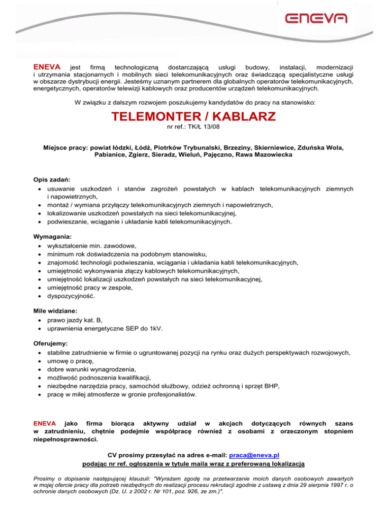 jest firmą technologiczną dostarczającą usługi budowy, instalacji, modernizacji i utrzymania stacjonarnych i mobilnych sieci telekomunikacyjnych oraz świadczącą specjalistyczne usługi w obszarze dystrybucji energii. Jesteśmy uznanym partnerem dla globalnych operatorów telekomunikacyjnych, energetycznych, operatorów telewizji kablowych oraz producentów urządzeń telekomunikacyjnych. ENEVA W związku z dalszym rozwojem poszukujemy kandydatów do pracy na stanowisko: TELEMONTER / KABLARZ nr ref.: TK/Ł 13/08 Miejsce pracy: powiat łódzki, Łódź, Piotrków Trybunalski, Brzeziny, Skierniewice, Zduńska Wola, Pabianice, Zgierz, Sieradz, Wieluń, Pajęczno, Rawa Mazowiecka Opis zadań: usuwanie uszkodzeń i stanów zagrożeń powstałych w kablach telekomunikacyjnych ziemnych i napowietrznych, montaż / wymiana przyłączy telekomunikacyjnych ziemnych i napowietrznych, lokalizowanie uszkodzeń powstałych na sieci telekomunikacyjnej, podwieszanie, wciąganie i układanie kabli telekomunikacyjnych. Wymagania: wykształcenie min. zawodowe, minimum rok doświadczenia na podobnym stanowisku, znajomość technologii podwieszania, wciągania i układania kabli telekomunikacyjnych, umiejętność wykonywania złączy kablowych telekomunikacyjnych, umiejętność lokalizacji uszkodzeń powstałych na sieci telekomunikacyjnej, umiejętność pracy w zespole, dyspozycyjność. Mile widziane: prawo jazdy kat. B, uprawnienia energetyczne SEP do 1kV. Oferujemy: stabilne zatrudnienie w firmie o ugruntowanej pozycji na rynku oraz dużych perspektywach rozwojowych, umowę o pracę, dobre warunki wynagrodzenia, możliwość podnoszenia kwalifikacji, niezbędne narzędzia pracy, samochód służbowy, odzież ochronną i sprzęt BHP, pracę w miłej atmosferze w gronie profesjonalistów. ENEVA jako firma biorąca aktywny udział w akcjach dotyczących równych szans w zatrudnieniu, chętnie podejmie współpracę również z osobami z orzeczonym stopniem niepełnosprawności. CV prosimy przesyłać na adres e-mail: [email protected] podając nr ref. ogłoszenia w tytule maila wraz z preferowaną lokalizacją Prosimy o dopisanie następującej klauzuli: "Wyrażam zgodę na przetwarzanie moich danych osobowych zawartych w mojej ofercie pracy dla potrzeb niezbędnych do realizacji procesu rekrutacji zgodnie z ustawą z dnia 29 sierpnia 1997 r. o ochronie danych osobowych (Dz. U. z 2002 r. Nr 101, poz. 926, ze zm.)".