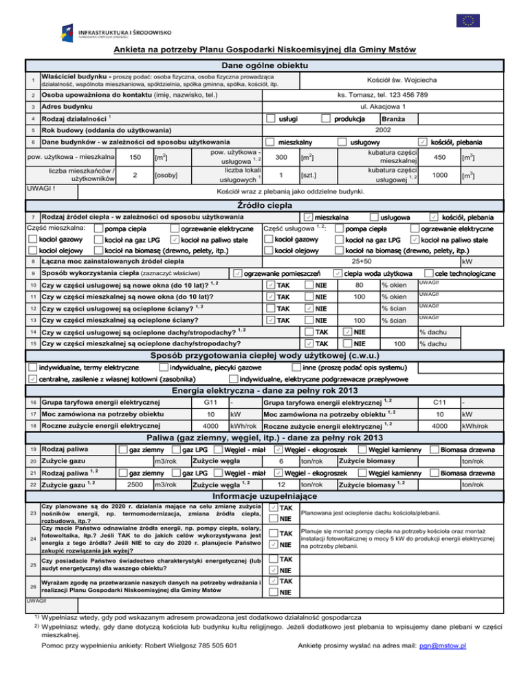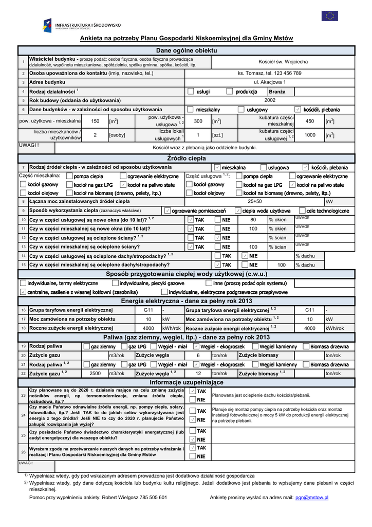 Ankieta na potrzeby Planu Gospodarki Niskoemisyjnej dla Gminy Mstów Dane ogólne obiektu 1 Właściciel budynku - proszę podać: osoba fizyczna, osoba fizyczna prowadząca Kościół św. Wojciecha działalność, wspólnota mieszkaniowa, spółdzielnia, spółka gminna, spółka, kościół, itp. 2 Osoba upoważniona do kontaktu (imię, nazwisko, tel.) 3 Adres budynku ks. Tomasz, tel. 123 456 789 ul. Akacjowa 1 1 usługi 4 Rodzaj działalności 5 Rok budowy (oddania do użytkowania) 6 Dane budynków - w zależności od sposobu użytkowania pow. użytkowa - mieszkalna liczba mieszkańców / użytkowników UWAGI ! 150 2 produkcja Branża 2002 mieszkalny pow. użytkowa usługowa 1, 2 liczba lokali usługowych 1 2 [m ] [osoby] usługowy 2 300 [m ] 1 [szt.] kościół, plebania kubatura części mieszkalnej kubatura części usługowej 1, 2 3 450 [m ] 1000 [m3] Kościół wraz z plebanią jako oddzielne budynki. Źródło ciepła 7 Rodzaj źródeł ciepła - w zależności od sposobu użytkowania Część mieszkalna: mieszkalna pompa ciepła ogrzewanie elektryczne kocioł gazowy kocioł na gaz LPG kocioł na paliwo stałe kocioł olejowy kocioł na biomasę (drewno, pelety, itp.) 1, 2 kościół, plebania usługowa pompa ciepła ogrzewanie elektryczne kocioł gazowy kocioł na gaz LPG kocioł na paliwo stałe kocioł olejowy kocioł na biomasę (drewno, pelety, itp.) Część usługowa : 25+50 8 Łączna moc zainstalowanych źródeł ciepła 9 Sposób wykorzystania ciepła (zaznaczyć właściwe) 10 Czy w części usługowej są nowe okna (do 10 lat)? 1, 2 TAK NIE 80 % okien UWAGI! 11 Czy w części mieszkalnej są nowe okna (do 10 lat)? TAK NIE 100 % okien UWAGI! TAK NIE % ścian UWAGI! TAK NIE 100 % ścian UWAGI! ogrzewanie pomieszczeń 1, 2 kW ciepła woda użytkowa 12 Czy w części usługowej są ocieplone ściany? 13 Czy w części mieszkalnej są ocieplone ściany? 14 Czy w części usługowej są ocieplone dachy/stropodachy? 1, 2 TAK NIE 15 Czy w części mieszkalnej są ocieplone dachy/stropodachy? TAK NIE cele technologiczne % dachu 100 % dachu Sposób przygotowania ciepłej wody użytkowej (c.w.u.) indywidualne, termy elektryczne indywidualne, piecyki gazowe centralne, zasilenie z własnej kotłowni (zasobnika) inne (proszę podać opis systemu) indywidualne, elektryczne podgrzewacze przepływowe Energia elektryczna - dane za pełny rok 2013 16 Grupa taryfowa energii elektrycznej G11 17 Moc zamówiona na potrzeby obiektu 10 18 Roczne zużycie energii elektrycznej 4000 Grupa taryfowa energii elektrycznej 1, 2 kW Moc zamówiona na potrzeby obiektu C11 1, 2 10 kWh/rok Roczne zużycie energii elektrycznej 1, 2 4000 kW kWh/rok Paliwa (gaz ziemny, węgiel, itp.) - dane za pełny rok 2013 19 Rodzaj paliwa 20 Zużycie gazu 21 22 m3/rok Rodzaj paliwa Zużycie gazu gaz ziemny 1, 2 1, 2 gaz ziemny 2500 m3/rok gaz LPG Węgiel - miał Zużycie węgla gaz LPG Węgiel - miał Zużycie węgla Węgiel - ekogroszek 6 1, 2 ton/rok Węgiel - ekogroszek 12 ton/rok Węgiel kamienny Zużycie biomasy ton/rok Węgiel kamienny Zużycie biomasy Biomasa drzewna 1, 2 Biomasa drzewna ton/rok Informacje uzupełniające Czy planowane są do 2020 r. działania mające na celu zmianę zużycia 23 nośników energii, np. termomodernizacja, zmiana źródła ciepła, rozbudowa, itp.? Czy macie Państwo odnawialne źródła energii, np. pompy ciepła, solary, fotowoltaika, itp.? Jeśli TAK to do jakich celów wykorzystywana jest 24 energia z tego źródła? Jeśli NIE to czy do 2020 r. planujecie Państwo zakupić rozwiązania jak wyżej? TAK Czy posiadacie Państwo świadectwo charakterystyki energetycznej (lub audyt energetyczny) dla waszego obiektu? TAK Wyrażam zgodę na przetwarzanie naszych danych na potrzeby wdrażania i realizacji Planu Gospodarki Niskoemisyjnej dla Gminy Mstów TAK 25 26 Planowana jest ocieplenie dachu kościoła/plebanii. NIE TAK NIE Planuje się montaż pompy ciepła na potrzeby kościoła oraz montaż instalacji fotowoltaicznej o mocy 5 kW do produkcji energii elektrycznej na potrzeby plebanii. NIE NIE UWAGI! 1) 2) Wypełniasz wtedy, gdy pod wskazanym adresem prowadzona jest dodatkowo działalność gospodarcza Wypełniasz wtedy, gdy dane dotyczą kościoła lub budynku kultu religijnego. Jeżeli dodatkowo jest plebania to wpisujemy dane plebani w części mieszkalnej. Pomoc przy wypełnieniu ankiety: Robert Wielgosz 785 505 601 Ankietę prosimy wysłać na adres mail: [email protected]