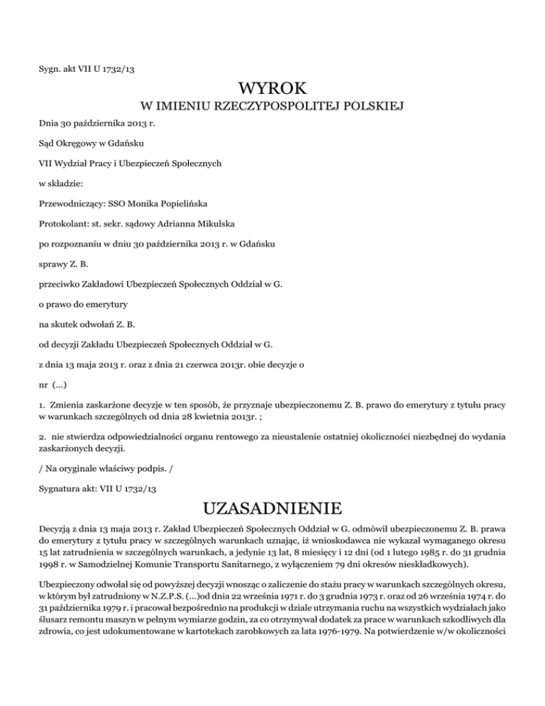 Sygn. akt VII U 1732/13 WYROK W IMIENIU RZECZYPOSPOLITEJ POLSKIEJ Dnia 30 października 2013 r. Sąd Okręgowy w Gdańsku VII Wydział Pracy i Ubezpieczeń Społecznych w składzie: Przewodniczący: SSO Monika Popielińska Protokolant: st. sekr. sądowy Adrianna Mikulska po rozpoznaniu w dniu 30 października 2013 r. w Gdańsku sprawy Z. B. przeciwko Zakładowi Ubezpieczeń Społecznych Oddział w G. o prawo do emerytury na skutek odwołań Z. B. od decyzji Zakładu Ubezpieczeń Społecznych Oddział w G. z dnia 13 maja 2013 r. oraz z dnia 21 czerwca 2013r. obie decyzje o nr (...) 1. Zmienia zaskarżone decyzje w ten sposób, że przyznaje ubezpieczonemu Z. B. prawo do emerytury z tytułu pracy w warunkach szczególnych od dnia 28 kwietnia 2013r. ; 2. nie stwierdza odpowiedzialności organu rentowego za nieustalenie ostatniej okoliczności niezbędnej do wydania zaskarżonych decyzji. / Na oryginale właściwy podpis. / Sygnatura akt: VII U 1732/13 UZASADNIENIE Decyzją z dnia 13 maja 2013 r. Zakład Ubezpieczeń Społecznych Oddział w G. odmówił ubezpieczonemu Z. B. prawa do emerytury z tytułu pracy w szczególnych warunkach uznając, iż wnioskodawca nie wykazał wymaganego okresu 15 lat zatrudnienia w szczególnych warunkach, a jedynie 13 lat, 8 miesięcy i 12 dni (od 1 lutego 1985 r. do 31 grudnia 1998 r. w Samodzielnej Komunie Transportu Sanitarnego, z wyłączeniem 79 dni okresów nieskładkowych). Ubezpieczony odwołał się od powyższej decyzji wnosząc o zaliczenie do stażu pracy w warunkach szczególnych okresu, w którym był zatrudniony w N.Z.P.S. (...)od dnia 22 września 1971 r. do 3 grudnia 1973 r. oraz od 26 września 1974 r. do 31 października 1979 r. i pracował bezpośrednio na produkcji w dziale utrzymania ruchu na wszystkich wydziałach jako ślusarz remontu maszyn w pełnym wymiarze godzin, za co otrzymywał dodatek za prace w warunkach szkodliwych dla zdrowia, co jest udokumentowane w kartotekach zarobkowych za lata 1976-1979. Na potwierdzenie w/w okoliczności ubezpieczony wniósł o przeprowadzenie dowodu z zeznań świadków C. B. oraz J. K. oraz z załączonych przez niego kserokopii dokumentacji z akt osobowych. Decyzją z dnia 21 czerwca 2013 r. Zakład Ubezpieczeń Społecznych Oddział w G. ponownie odmówił ubezpieczonemu Z. B. prawa do emerytury z tytułu pracy w szczególnych warunkach, powołując taką samą argumentację jak w decyzji z dnia 13 maja 2013 r. Nadto podał, że brak jest dowodu, na postawie którego można by stwierdzić, że praca wykonywana w okresie od 22 września 1971 r. do 3 grudnia 1973 r. oraz od 26 września 1974 r. do 31 października 1979 r. była pracą wykonywaną stale i w pełnym wymiarze czasu pracy w szczególnych warunkach, brak określenia charakteru pracy, a zajmowane stanowiska ślusarz, ślusarz remontu maszyn nie wnoszą dostatecznego wyjaśnienia w sprawie. Ubezpieczony odwołał od powyższej decyzji zaskarżając ją w całości oraz zarzucając jej nie wyjaśnienie wszystkich okoliczności faktycznych istotnych dla właściwego rozstrzygnięcia sprawy, a zwłaszcza wyjaśnienia, iż na podstawie przedłożonego materiału dowodowego (tj. świadectw pracy oraz dokumentacji z archiwum ZUS nie ustalił czy wykonywana przez ubezpieczonego praca w N.Z.P.S. (...) była pracą w szczególnych warunkach, wykonywaną stale i w pełnym wymiarze czasu. Na potwierdzenie tej okoliczności ubezpieczony wniósł o przeprowadzenie dowodu zeznań świadków C. B., R. W., S. K. oraz J. K.. Organ rentowy w odpowiedzi na powyższe odwołania wniósł o ich oddalenie, a w uzasadnieniu pisma powołał się na argumentację zawartą w treści zaskarżonych w niniejszym postępowaniu decyzji. Postanowieniem z dnia 22 sierpnia 2013 r. tut. Sąd na mocy art. 219 k.p.c. połączył powyższe sprawy do wspólnego rozpoznania i postanowił prowadzić dalej pod wspólną sygnaturą VII U 1732/13. Sąd Okręgowy ustalił następujący stan faktyczny: Z. B., urodzony dnia (...), w dniu 28 marca 2013 r. złożył w Zakładzie Ubezpieczeń Społecznych Oddział w G. wniosek o emeryturę z tytułu pracy w szczególnych warunkach. Na dzień złożenia wniosku o emeryturę ubezpieczony nie był członkiem OFE, a na dzień 1 stycznia 1999 r. wykazał łącznie 29 lat, 5 miesięcy i 22 dni okresów składkowych i nieskładkowych. W tym ZUS uwzględnił 13 lat, 8 miesięcy i 12 dni okresu wykonywania pracy w szczególnych warunkach od 1 lutego 1985 r. do 31 grudnia 1998 r. w Samodzielnej Komunie Transportu Sanitarnego, z wyłączeniem 79 dni okresów nieskładkowych. Niesporne, a nadto vide: wniosek – k. 1-2, świadectwo wykonywania prac w szczególnych warunkach – k. 17 plik III akt rentowych, Z powyższych względów, zaskarżonymi w niniejszym postępowaniu decyzjami z dnia 13 maja 2013 r. oraz z dnia 21 czerwca 2013 r. Zakład Ubezpieczeń Społecznych Oddział w G. odmówił ubezpieczonemu Z. B. prawa do emerytury, pomimo przedłożenia przez ubezpieczonego dodatkowych dokumentów . . Dowód : karta przebiegu zatrudnienia – k. 21, decyzja z dnia 13 maja 2013 r. – k. 20, dokumentacja osobowa – k. 23 plik III akt rentowych, odwołanie – k. 2 akt sprawy, karta przebiegu zatrudnienia – k. 34, decyzja z dnia 21 czerwca 2013 r. – k. 35 plik III akt rentowych Ubezpieczony był zatrudniony w (...) Zakładach (...) w S. G. (później: (...) Zakładach (...) w S. N.) w okresie od 22 września 1971 r. do 3 grudnia 1973 r. na stanowisku ślusarza, a w okresie od 26 września 1974 r. do 31 października 1979 r. na stanowisku ślusarz remontowy. W trakcie powyższego zatrudnienia ubezpieczony odbywał zasadniczą służbę wojskową, po zakończeniu której w dniu 25 października 1975 r. powrócił na dotychczas zajmowane stanowisko. dowód: świadectwo pracy z dnia 30 listopada 1973 r., świadectwo pracy z dnia 26 października 1979 r. angaż z dnia 2 listopada 1976 r. – w aktach osobowych – k. 31 (koperta) akt sprawy, Pracując 
