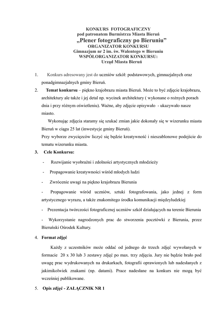 KONKURS FOTOGRAFICZNY pod patronatem Burmistrza Miasta Bieruń „Plener fotograficzny po Bieruniu” ORGANIZATOR KONKURSU Gimnazjum nr 2 im. św. Walentego w Bieruniu WSPÓŁORGANIZATOR KONKURSU: Urząd Miasta Bieruń 1. Konkurs adresowany jest do uczniów szkół: podstawowych, gimnazjalnych oraz ponadgimnazjalnych gminy Bieruń. 2. Temat konkursu – piękno krajobrazu miasta Bieruń. Może to być zdjęcie krajobrazu, architektury ale także i jej detal np. wycinek architektury ( wykonane o rożnych porach dnia i przy różnym oświetleniu). Ważne, aby zdjęcie opisywało - ukazywało nasze miasto. Wykonując zdjęcia staramy się szukać zmian jakie dokonały się w wizerunku miasta Bieruń w ciągu 25 lat (inwestycje gminy Bieruń). Przy wyborze zwycięzców liczyć się będzie kreatywność i nieszablonowe podejście do tematu wizerunku miasta. 3. Cele Konkursu: - Rozwijanie wyobraźni i zdolności artystycznych młodzieży - Propagowanie kreatywności wśród młodych ludzi - Zwrócenie uwagi na piękno krajobrazu Bierunia - Propagowanie wśród uczniów, sztuki fotografowania, jako jednej z form artystycznego wyrazu, a także znakomitego środka komunikacji międzyludzkiej - Prezentacja twórczości fotograficznej uczniów szkół działających na terenie Bierunia - Wykorzystanie nagrodzonych prac do stworzenia pocztówki z Bierunia, przez Bieruński Ośrodek Kultury. 4. Format zdjęć Każdy z uczestników może oddać od jednego do trzech zdjęć wywołanych w formacie 20 x 30 lub 3 zestawy zdjęć po max. trzy zdjęcia. Jury nie będzie brało pod uwagę prac wydrukowanych na drukarkach, fotografii oprawionych lub nadesłanych z jakimikolwiek znakami (np. datami). Prace nadesłane na konkurs nie mogą być wcześniej publikowane. 5. Opis zdjęć - ZAŁĄCZNIK NR 1 Każda praca powinna posiadać na odwrotnej stronie następujące dane: a) imię i nazwisko autora – wiek b) tytuł pracy, nr zdjęcia/zestaw c) nazwę szkoły z adresem, telefonem, e-mail szkoły d) imię i nazwisko nauczyciela/opiekuna, pod kierunkiem którego wykonano pracę 6. Termin i miejsce nadsyłania prac Prace na konkurs należy przesyłać lub dostarczyć osobiście do dnia 6 maja 2016 r. na adres: Gimnazjum nr 2 im. św. Walentego w Bieruniu ul. Licealna 17 a 43-150 Bieruń, z dopiskiem - Konkurs „Plener fotograficzny po Bieruniu” Prosimy o dołączenie zbiorczej listy uczestników. 7. Ocena prac Komisja, w skład której wejdą przedstawiciele organizatorów i zaproszonych gości, dokona oceny prac fotograficznych przyznając nagrody i kwalifikując prace na wystawę. 8. Ogłoszenie wyników: Podsumowanie konkursu, wręczenie nagród i dyplomów oraz prezentacja wystawy pokonkursowej odbędzie się w miesiącu maj - czerwiec 2016 r. 9. Organizatorzy konkursu zastrzegają sobie prawo publikowania i reprodukowania prac konkursowych bez wypłacania honorariów autorskich. Przesłane prace przechodzą na własność organizatorów. Nadesłanie prac jest równoznaczne z uznaniem warunków niniejszego konkursu i oświadczeniem iż fotografie złożone na konkurs zostały wykonane osobiście. 10. Wszelkich dodatkowych informacji o konkursie udziela Krystyna Bobak – nauczyciel plastyki w Gimnazjum nr 2 im. św. Walentego w Bieruniu, tel. (32) 216 53 63 lub e-mail: [email protected] (w temacie prosimy zaznaczyć: Konkurs „Plener fotograficzny po Bieruniu” ZAŁĄCZNIK NR 1 imię i nazwisko autora - wiek tytuł pracy, nr zdjęcia/seria nazwę szkoły z adresem telefonem e-mail szkoły imię i nazwisko nauczyciela/opiekuna