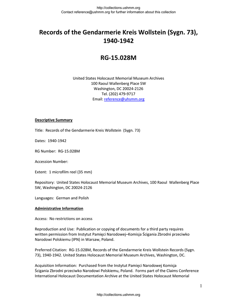 http://collections.ushmm.org Contact [email protected] for further information about this collection Records of the Gendarmerie Kreis Wollstein (Sygn. 73), 1940‐1942 RG‐15.028M United States Holocaust Memorial Museum Archives 100 Raoul Wallenberg Place SW Washington, DC 20024‐2126 Tel. (202) 479‐9717 Email: [email protected] Descriptive Summary Title: Records of the Gendarmerie Kreis Wollstein (Sygn. 73) Dates: 1940‐1942 RG Number: RG‐15.028M Accession Number: Extent: 1 microfilm reel (35 mm) Repository: United States Holocaust Memorial Museum Archives, 100 Raoul Wallenberg Place SW, Washington, DC 20024‐2126 Languages: German and Polish Administrative Information Access: No restrictions on access Reproduction and Use: Publication or copying of documents for a third party requires written permission from Instytut Pamięci Narodowej–Komisja Ścigania Zbrodni przeciwko Narodowi Polskiemu (IPN) in Warsaw, Poland. Preferred Citation: RG‐15.028M, Records of the Gendarmerie Kreis Wollstein Records (Sygn. 73), 1940‐1942. United States Holocaust Memorial Museum Archives, Washington, DC. Acquisition Information: Purchased from the Instytut Pamięci Narodowej Komisja Ścigania Zbrodni przeciwko Narodowi Polskiemu, Poland. Forms part of the Claims Conference International Holocaust Documentation Archive at the United States Holocaust Memorial 1 http://collections.ushmm.org http://collections.ushmm.org Contact [email protected] for further information about this collection Museum. This archive consists of documentation whose reproduction and/or acquisition was made possible with funding from the Conference on Jewish Material Claims against Germany. Accruals: Accruals may have been received since this collection was first processed, see the Archives catalog at collections.ushmm.org for further information. Custodial History Existence and Location of Originals: The original records are held by the Instytut Pamięci Narodowej Komisja Ścigania Zbrodni przeciwko Narodowi Polskiemu, ul. Towarowa 28, Warsaw, Poland 00‐839. Tel. 011 48 22 581 85 00. More information about this repository can be found at www.ipn.gov.pl. Processing History: Aleksandra B. Borecka Scope and Content of Collection Contains quarterly situation reports from 1940 to 1943 concerning political and economic atmosphere, population, criminal activity, German‐Polish relations, strength of the police force, and special occurrences in several towns of the Wolstein (Wolsztyn) district including Gro‐ Nelken, Kirchdorf, Deutsch‐Gabel, Wollstein, Teichrode, Weiberg, Kirchplatz, Rakwitz, Altkloster, and Klosterweise. Also contains regulations concerning confiscation, registration, operation and repair of motor vehicles (December 1939). System of Arrangement The system of arrangement of the source repository has been preserved in the microfilmed reel. This collection is arranged thematically. Indexing Terms World War, 1939‐1945‐‐Atrocities—Poland‐‐Wolsztyn. World War, 1939‐1945‐‐Confiscations and contributions‐‐Poland‐‐Wolsztyn. Jews‐‐Legal status, laws, etc.‐‐Poland‐‐20th century‐‐Registers. Polish people‐‐Legal status, laws, etc.‐‐Poland‐‐20th century‐‐Registers. Holocaust, Jewish (1939‐1945) Poland‐‐History‐‐Occupation, 1939‐1945. Wolsztyn (Poland) Reports. 2 http://collections.ushmm.org http://collections.ushmm.org Contact [email protected] for further information about this collection CONTAINER LIST Reel File 1 1 2 3 Description Reports about the activities of the police stations in the counties of the Wolsztyn (Wollstein) district (monthly and quarterly). 1941‐1942. Instructions and correspondence concerning mechanical vehicles used by the police in the Wolsztyn (Wollstein) district. 1940‐1941. Copy of Hitler's order about the duty of confidentiality. 1940‐1941. 3 http://collections.ushmm.org