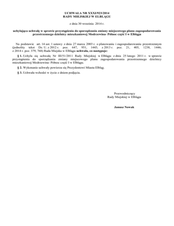 UCHWAŁA NR XXXI/923/2014 RADY MIEJSKIEJ W ELBLĄGU z dnia 30 września 2014 r. uchylająca uchwałę w sprawie przystąpienia do sporządzania zmiany miejscowego planu zagospodarowania przestrzennego dzielnicy mieszkaniowej Modrzewina- Północ część I w Elblągu Na podstawie art. 14 ust. 1 ustawy z dnia 27 marca 2003 r. o planowaniu i zagospodarowaniu przestrzennym (jednolity tekst Dz. U. z 2012 r. poz. 647, 951, 1445; z 2013 r. poz. 21, 405, 1238, 1446; z 2014 r. poz. 379, 768) Rada Miejska w Elblągu uchwala, co następuje: § 1. Uchyla się uchwałę Nr III/51/2011 Rady Miejskiej w Elblągu z dnia 25 lutego 2011 r. w sprawie przystąpienia do sporządzania zmiany miejscowego planu zagospodarowania przestrzennego dzielnicy mieszkaniowej Modrzewina- Północ część I w Elblągu. § 2. Wykonanie uchwały powierza się Prezydentowi Miasta Elbląg. § 3. Uchwała wchodzi w życie z dniem podjęcia. Przewodniczący Rady Miejskiej w Elblągu Janusz Nowak Uzasadnienie Uchylenie uchwały intencyjnej nr III/51/2011 Rady Miejskiej w Elblągu z dnia 25.02.2011 r. w sprawie przystąpienia do sporządzania zmiany miejscowego planu zagospodarowania przestrzennego dzielnicy mieszkaniowej Modrzewina – Północ część I w Elblągu ma na celu utrzymanie przepisów zawartych w miejscowym planie zagospodarowania przestrzennego, uchwalonym przez Radę Miejską w Elblągu uchwałą nr XII/211/2007 z dnia 20.12.2007 r. Powyższe wynika z potencjalnych negatywnych skutków ekonomicznych dla budżetu gminy – miasta Elbląg wynikających ze zmiany przepisów ww. obowiązującego planu miejscowego. Opracowane warianty zmiany planu mogą wygenerować dodatkowe koszty związane z budową sieci i obiektów infrastruktury technicznej oraz spowodować zmniejszenie dochodów ze sprzedaży i podatku od nieruchomości. Ewentualne zmiany obowiązującego planu nie mają również wpływu na atrakcyjność i podaż tych terenów. W związku z powyższym, dalsze procedowanie zmiany planu oraz jego realizacja nie są uzasadnione, co przemawia za uchyleniem uchwały intencyjnej w sprawie przystąpienia do sporządzania zmiany miejscowego planu zagospodarowania przestrzennego dzielnicy mieszkaniowej Modrzewina – Północ część I w Elblągu.