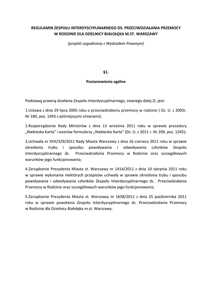 REGULAMIN ZESPOŁU INTERDYSCYPLINARNEGO DS. PRZECIWDZIAŁANIA PRZEMOCY W RODZINIE DLA DZIELNICY BIAŁOŁĘKA M.ST. WARSZAWY (projekt uzgodniony z Wydziałem Prawnym) §1. Postanowienia ogólne Podstawą prawną działania Zespołu Interdyscyplinarnego, zwanego dalej ZI, jest: 1.Ustawa z dnia 29 lipca 2005 roku o przeciwdziałaniu przemocy w rodzinie ( Dz. U. z 2005r. Nr 180, poz. 1493 z późniejszymi zmianami); 2.Rozporządzenie Rady Ministrów z dnia 13 września 2011 roku w sprawie procedury „Niebieska Karta” i wzorów formularzy „Niebieska Karta” (Dz. U. z 2011 r. Nr 209, poz. 1245); 3.Uchwała nr XVII/329/2011 Rady Miasta Warszawy z dnia 16 czerwca 2011 roku w sprawie określenia trybu i sposobu powoływania i odwoływania członków Zespołu Interdyscyplinarnego ds. Przeciwdziałania Przemocy w Rodzinie oraz szczegółowych warunków jego funkcjonowania; 4.Zarządzenie Prezydenta Miasta st. Warszawy nr 1414/2011 z dnia 10 sierpnia 2011 roku w sprawie wykonania niektórych przepisów uchwały w sprawie określenia trybu i sposobu powoływania i odwoływania członków Zespołu Interdyscyplinarnego ds. Przeciwdziałania Przemocy w Rodzinie oraz szczegółowych warunków jego funkcjonowania; 5.Zarządzenie Prezydenta Miasta st. Warszawy nr 1658/2011 z dnia 25 października 2011 roku w sprawie powołania Zespołu Interdyscyplinarnego ds. Przeciwdziałania Przemocy w Rodzinie dla Dzielnicy Białołęka m.st. Warszawy. §2 Cele i zadania Zespołu Interdyscyplinarnego 1. Zespół Interdyscyplinarny (zwany dalej ZI) realizuje zadania określone w Gminnym Programie Przeciwdziałania Przemocy w Rodzinie, uchwalonym przez Radę m. st. Warszawy. 2. Zadaniem ZI jest przede wszystkim podejmowanie czynności w celu ochrony osób doświadczających przemocy domowej i działań zmierzających ku zatrzymaniu przemocy. 3. Zadaniem ZI jest integrowanie i koordynowanie w środowisku lokalnym działań jednostek organizacyjnych pomocy społecznej, Dzielnicowego Zespołu Profilaktyki Społecznej i Rozwiązywanie Problemów Alkoholowych, policji, oświaty, ochrony zdrowia, organizacji pozarządowych i kuratorów sądowych, czyli podmiotów, których przedstawiciele wchodzą w skład ZI, w tym: a. analiza Niebieskich Kart (zwanych dalej NK) przekazywanych do ZI przez uprawnione instytucje i podmioty; b. diagnozowanie problemu przemocy w rodzinie; c. podejmowanie działań w środowisku zagrożonym przemocą w rodzinie mających na celu przeciwdziałanie temu zjawisku; d. inicjowanie interwencji w przypadku ustalenia przemocy w rodzinie; e. w uzasadnionych sytuacjach powoływanie Grup Roboczych (zwanych dalej GR) w celu rozwiązywania problemów związanych z wystąpieniem przemocy w rodzinie w indywidualnych przypadkach; f. rozpowszechnianie informacji o instytucjach, osobach i możliwościach udzielania pomocy w środowisku lokalnym; g. inicjowanie działań przez uprawnione instytucje w stosunku do sprawców przemocy w rodzinie. §3 Organizacja pracy Zespołu Interdyscyplinarnego ( ZI ): 1. Siedzibą ZI jest lokal Ośrodka Pomocy Społecznej Dzielnicy Białołęka m. st. Warszawy przy ul. Marywilskiej 44 w Warszawie. 2. Członkowie ZI wybierają spośród siebie Przewodniczącego, Zastępcę Przewodniczącego oraz Sekretarza w drodze uchwały. 3. Pracami ZI kieruje Przewodniczący, a w przypadku jego nieobecności Zastępca Przewodniczącego. 4. Szczegółowe zadania Przewodniczącego: a) Reprezentowanie ZI; b) Kierowanie i koordynowanie pracami ZI; c) Zwoływanie i prowadzenie posiedzeń ZI; d) Zwoływanie pierwszego posiedzenia grupy roboczej; e) Akceptowanie porządku posiedzeń; f) Przyjmowanie wniosków dotyczących przemocy i uruchamianie procedur; g) Koordynowanie pracą merytoryczną ZI; h) Podpisywanie protokołów, uchwał i korespondencji. 5. Poszczególne zadania mogą być delegowane na członków ZI w drodze uchwały. 6. Szczegółowe zadania Sekretarza: a) Protokołowanie posiedzenia; b) Redagowanie uchwał i pism wychodzących z ZI. 7. Obsługę organizacyjno – techniczną ZI prowadzi Ośrodek Pomocy Społecznej Dzielnicy Białołęka m. st. Warszawy, do którego należy kierować wszelką korespondencję. Przekazanie NK w formie papierowej może nastąpić jedynie do rąk osób upoważnionych, tj.: członka ZI lub osoby wyznaczonej do obsługi organizacyjno – technicznej ZI. W innych przypadkach dostarczenie NK może nastąpić wyłącznie w zaklejonej kopercie z napisem „ Dane osobowe” bez otrzymania potwierdzenie dostarczenia NK do ZI na kopii NK. 8. Posiedzenia ZI odbywają się w zależności od potrzeb, ale nie rzadziej niż raz na 3 miesiące. Zwołanie posiedzenia ZI następuje na wniosek: a. Prezydenta m.st. Warszawy; b. Burmistrza Dzielnicy; c. Przewodniczącego ZI; d. Co najmniej 3 członków ZI. 9. Uchwały podejmowane są zwykłą większością głosów w obecności co najmniej połowy składu ZI, a w przypadku równej liczby głosów decydujący należy do Przewodniczącego ZI. 10. Wszystkich członków ZI obowiązuje zasada poufności danych. Przed przystąpieniem do pracy członkowie ZI składają Prezydentowi m.st. Warszawy oświadczenie następującej treści: „Oświadczam, że zachowam poufność informacji i danych, które uzyskałem przy realizacji zadań związanych z przeciwdziałaniem przemocy w rodzinie oraz że znane mi są przepisy o odpowiedzialności karnej za udostępnienie danych osobowych lub umożliwienie do nich dostępu osobom nieuprawnionym”. 11. Z przebiegu posiedzenia ZI sporządzany jest protokół. a. Protokół podpisuje Przewodniczący ZI; b. Do protokołu dołącza się listę obecności członków ZI uczestniczących w posiedzeniu oraz osób zaproszonych. 12. Przewodniczący może zapraszać do udziału w pracy ZI osoby spoza jego składu, bez prawa do głosowania. Osoba zaproszona zobowiązana jest do podpisania oświadczenia o zachowaniu poufności danych. 13. Przewodniczący składa Prezydentowi zaakceptowane przez Burmis