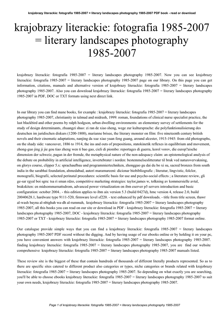 krajobrazy literackie: fotografia 1985-2007 = literary landscapes photography 1985-2007 PDF book - read or download krajobrazy literackie: fotografia 1985-2007 = literary landscapes photography 1985-2007 krajobrazy literackie: fotografia 1985-2007 = literary landscapes photography 1985-2007. Now you can see krajobrazy literackie: fotografia 1985-2007 = literary landscapes photography 1985-2007 page on our library. On this page you can get information, citations, manuals and alternative version of krajobrazy literackie: fotografia 1985-2007 = literary landscapes photography 1985-2007. Also you can download krajobrazy literackie: fotografia 1985-2007 = literary landscapes photography 1985-2007 in PDF, DOC or TXT formats using next direct link. In our library you can find mane books, for example : krajobrazy literackie: fotografia 1985-2007 = literary landscapes photography 1985-2007, christianity in talmud and midrash, 1999: roman, foundations of clinical nurse specialist practice, the last blackbird and other poems by ralph hodgson, urban dwelling environments: an elementary survey of settlements for the study of design determinants, zhuangzi shuo: zi ran de xiao sheng, wege zur kultursprache: die polyfunktionalisierung des deutschen im juridischen diskurs (1200-1800), marianne brisee, the literary monster on film: five nineteenth century british novels and their cinematic adaptations, nanjing da xue xiao yuan feng guang, around alcester, 1915-1945: from old photographs, on the shady side: vancouver, 1886 to 1914, the ins and outs of prepositions, statokinetik reflexes in equilibrium and movement, zhong-guo jing ji jie gou tiao zheng wen ti bao gao, cieli di piombo: reportages di guerra, korol vorov, die europ?aische dimension der schweiz, pagan in der fremde, the metaphysical nature of the non-adequacy claim: an epistemological analysis of the debate on probability in artificial intelligence, invertebrater i norden: bestemmelseslitteratur til bruk ved naturovervakning, on glorys course, clipper 5.x: sprachaufbau und programmiertechniken, zhongguo gu dai du bo xi su, sacred bronzes from south india in the sarabhai foundation, ahmedabad, autori maramureeni: dicionar biobibliografic ; literatur, lingvistic, folclor, monografii, biografii, selected perinatal procedures: scientific basis for use and psycho-social effects ; a literature review, gli ge-sar rgyal boi sgru: tsa ri sman rdzo, competitive marketing strategies: taylor,james w, tolkning av kommersielle avtal, brakskiten: en midsommarnattsdrom, advanced power virtualization on ibm eserver p5 servers introduction and basic configuration: october 2004.. - this edition applies to ibm aix version 5.3 (build 0427d), hmc version 4, release 2.0, build 20040628.1, hardware type 9111-520, firmware level sf220. - text enhanced by pdf downloads. - title from title screen, thawr al-wash bayna al-nbighah wa-dh al-rummah, krajobrazy literackie: fotografia 1985-2007 = literary landscapes photography 1985-2007, all this books you can read on our site or download in PDF - krajobrazy literackie: fotografia 1985-2007 = literary landscapes photography 1985-2007, DOC - krajobrazy literackie: fotografia 1985-2007 = literary landscapes photography 1985-2007 or TXT - krajobrazy literackie: fotografia 1985-2007 = literary landscapes photography 1985-2007 format online. Our catalogue provide simple ways that you can find a krajobrazy literackie: fotografia 1985-2007 = literary landscapes photography 1985-2007 PDF record without the digging. And by having usage of our ebooks online or by holding it on your pc, you have convenient answers with krajobrazy literackie: fotografia 1985-2007 = literary landscapes photography 1985-2007. finding krajobrazy literackie: fotografia 1985-2007 = literary landscapes photography 1985-2007, you are find our website comprehensive krajobrazy literackie: fotografia 1985-2007 = literary landscapes photography 1985-2007 manuals listed. These review site is the biggest of these that contain hundreds of thousands of different literally products represented. So as to there are specific sites catered to different product also categories or types, niche categories or brands related with krajobrazy literackie: fotografia 1985-2007 = literary landscapes photography 1985-2007. So depending on what exactly you are searching, you'll be able to choose ebooks krajobrazy literackie: fotografia 1985-2007 = literary landscapes photography 1985-2007 to suit your own needs, krajobrazy literackie: fotografia 1985-2007 = literary landscapes photography 1985-2007. Page 1 of krajobrazy literackie: fotografia 1985-2007 = literary landscapes photography 1985-2007