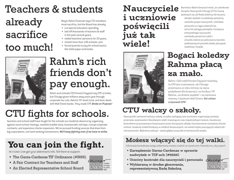 Teachers & students already sacrifice too much! Rahm’s rich friends don’t pay enough. Mayor Rahm Emanuel says CTU members must sacrifice, but the Board has already: • cut special education spending, • laid off thousands of teachers & staff in the past several years, • raided teachers’ pensions for 20 years, • closed more than 100 schools, and • forced parents to pay for school basics like toilet paper and books. Rahm and schools CEO Forrest Claypool say CPS is broke, but Chicago gives millions away each year through corporate tax cuts, Rahm’s TIF slush fund, and toxic deals with Wall Street banks. They made CPS Broke on Purpose! CTU fights for schools. Teachers and school staff have fought for the schools our students deserve by organizing against racist school closings, wasteful bubble tests, bureaucratic red tape, corrupt corporate contracts, and expensive charter expansion. We’ve pursued funding sources that draw from big corporations, not hard-working homeowners. We’ll keep fighting even if we have to strike. You can join the fight. At ctunet.com get your alderman’s info. Tell them to support: The Garza-Cardenas TIF Ordinance (#5666) A Fair Contract for Teachers and Staff TEACHERS Created in-house UNION bystaffunion An Elected Representative School Board Nauczyciele i uczniowie poświęcili już tak wiele! Burmistrz Rahm Emanuel mówi, że członkowie Związku Nauczycieli Chicago (CTU) muszą poświęcić się, ale Rada Szkół już do tej pory: • obcięła wydatki na edukację specjalną, • zwolniła tysiące nauczycieli i członków personelu w ciągu ostatnich lat, • od 20 lat odciąga pieniądze z funduszu emerytalnego nauczycieli, • zamknęła ponad 100 szkół, i • zmusiła rodzice po pokrywania kosztów podstawowych potrzeb szkoły, jak papier toaletowy i książki. Bogaci koledzy Rahma płacą za mało. Rahm i CEO szkół Forrest Claypool twierdzą, że CPS jest zrujnowane, ale Chicago przeznacza co roku miliony na cięcia podatkowe dla korporacji, na fundusz TIF Rahma „na drobne wydatki” i na szemrane interesy z bankami Wall Street. Oni celowo zrujnowali CPS! CTU walczy o szkoły. Nauczyciele i personel walczą o szkoły, na jakie zasługują nasi uczniowie, organizując protesty przeciwko rasistowskim likwidacjom szkół, trwoniącym czas niepotrzebnym testom, biurokracji, kontraktom przyznawanym korporacjom przez korupcyjne układy i kosztownemu rozwijaniu charter schools. Szukamy źródeł funduszy w wielkich korporacjach, nie wśród ciężko pracujących właścicieli nieruchomości. Będziemy walczyć - nawet gdyby oznaczało to konieczność strajku. Możesz włączyć się do tej walki. Informacje kontaktowe swego aldermana możesz znaleźć na ctunet.com. Powiedz mu, aby poparł: Zarządzenie Garza-Cardenas w sprawie nadwyżek w TIF-ach (#5666) Uczciwy kontrakt dla nauczycieli i personelu Wybieraną w drodze głosowania, reprezentatywną Radę Szkolną TEACHERS Created in-house UNION by union staff