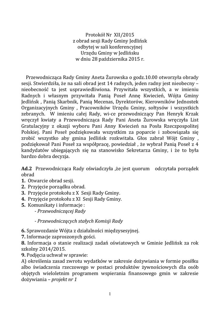 Protokół Nr XII/2015 z obrad sesji Rady Gminy Jedlińsk odbytej w sali konferencyjnej Urzędu Gminy w Jedlińsku w dniu 28 października 2015 r. Przewodnicząca Rady Gminy Aneta Żurowska o godz.10.00 otworzyła obrady sesji. Stwierdziła, że na sali obrad jest 14 radnych, jeden radny jest nieobecny – nieobecność ta jest usprawiedliwiona. Przywitała wszystkich, a w imieniu Radnych i własnym przywitała Panią Poseł Annę Kwiecień, Wójta Gminy Jedlińsk , Panią Skarbnik, Panią Mecenas, Dyrektorów, Kierowników Jednostek Organizacyjnych Gminy , Pracowników Urzędu Gminy, sołtysów i wszystkich zebranych. W imieniu całej Rady, wi-ce przewodniczący Pan Henryk Krzak wręczył kwiaty a Przewodnicząca Rady Pani Aneta Żurowska wręczyła List Gratulacyjny z okazji wyboru Pani Anny Kwiecień na Posła Rzeczpospolitej Polskiej. Pani Poseł podziękowała wszystkim za poparcie i zobowiązała się zrobić wszystko aby gmina Jedlińsk rozkwitała. Głos zabrał Wójt Gminy , podziękował Pani Poseł za współpracę, powiedział , że wybrał Panią Poseł z 4 kandydatów ubiegających się na stanowisko Sekretarza Gminy, i że to była bardzo dobra decyzja. Ad.2 Przewodnicząca Rady oświadczyła ,że jest quorum odczytała porządek obrad 1. Otwarcie obrad sesji. 2. Przyjęcie porządku obrad. 3. Przyjęcie protokołu z X Sesji Rady Gminy. 4. Przyjęcie protokołu z XI Sesji Rady Gminy. 5. Komunikaty i informacje : - Przewodniczącej Rady - Przewodniczących stałych Komisji Rady 6. Sprawozdanie Wójta z działalności międzysesyjnej. 7. Informacje zaproszonych gości. 8. Informacja o stanie realizacji zadań oświatowych w Gminie Jedlińsk za rok szkolny 2014/2015. 9. Podjęcia uchwał w sprawie: A) określenia zasad zwrotu wydatków w zakresie dożywiania w formie posiłku albo świadczenia rzeczowego w postaci produktów żywnościowych dla osób objętych wieloletnim programem wspierania finansowego gmin w zakresie dożywiania – projekt nr 1 1 B) powołania Komisji Inwentaryzacyjnej mienia komunalnego – projekt nr 2 C) określenia zasad i trybu przeprowadzania konsultacji społecznych z mieszkańcami Gminy Jedlińsk – projekt nr 3 D) przyjęcia Regulaminu w sprawie określenia wysokości i szczegółowych warunków przyznawania nauczycielom dodatków: za wysługę lat, motywacyjnego, funkcyjnego oraz niektórych innych składników wynagrodzenia, a także wysokości oraz szczegółowych zasad przyznawania i wypłacania dodatku mieszkaniowego – projekt nr 4 E) uchwalenia Programu współpracy Gminy Jedlińsk z organizacjami pozarządowymi oraz podmiotami prowadzącymi działalność pożytku publicznego na lata 2016-2020 –projekt nr 5 F) nadania nazwy ulicy – projekt nr 6 G) wyboru ławników na kadencję 2016-2019 – projekt nr 7 H) nadania Statutu Samodzielnemu Publicznemu Zakładowi Opieki Zdrowotnej w Jedlińsku- projekt nr 8 I) stwierdzenia pozostawienia zgłoszenia kandydata na ławnika bez dalszego biegu – projekt nr 9 J) Wieloletniej Prognozy Finansowej Gminy Jedlińsk na lata 2015 -2019 – projekt nr 10 K) wprowadzenie zmian w budżecie gminy na 2015 rok – projekt nr 11 L) określenia stawek podatku od nieruchomości – projekt nr 12 Ł) obniżenia średniej ceny skupu żyta dla celów wymiaru podatku rolnego na 2016 rok– projekt nr 13 M) określenia wysokości stawek podatku od środków transportowych – projekt nr 14 N) wyrażenia woli przystąpienia do opracowania i wdrażania Planu gospodarki niskoemisyjnej dla Gminy Jedlińsk na lata 2016-2020 – projekt nr 15 10. Zapytania , interpelacje i wnioski radnych. 11. Odpowiedzi Wójta na zapytania , interpelacje i wnioski. 12. Sprawy różne. 13. Zamknięcie XII Sesji Rady Gminy Jedlińsk. Głos zabrała skarbnik Gminy Pani Ilona Starzyńska , poprosiła o wprowadzenie do porządku obrad dwóch projektów Uchwał: - określenia wysokości stawek podatku od środków transportowych – projekt nr 14 - wyrażenia woli przystąpienia do opracowania i wdrażania Planu gospodarki niskoemisyjnej dla Gminy Jedlińsk na lata 2016-2020 – projekt nr 15 Głos zabrała Przewodnicząca Komisji Polityki Społecznej Pani Ewa Ofiara i złożyła wniosek o zdjęcie z porządku obrad projektu uchwały nr 4 tj. przyjęcia 2 regulaminu w sprawie określenia wysokości i szczegółowych warunków przyznawania nauczycielom dodatków: za wysługę lat, motywacyjnego, funkcyjnego oraz niektórych innych składników wynagrodzenia, a także wysokości oraz szczegółowych zasad przyznawania i wypłacania dodatku mieszkaniowego. Komisja chciałaby bardziej wnikliwie rozpatrzeć tę Uchwałę, ponieważ nie mamy jeszcze wytycznych jakie środki finansowe będą potrzebne. Przystąpiono do przegłosowania wniosku o zdjęcie z porządku obrad projektu nr.4. Rada w obecności 14 radnych – 14 głosami za przegłosowała zdjęcie z porządku obrad projektu Uchwały nr 4. Następnie Rada przystąpiła do głosowania o wprowadzenia do porządku obrad projektu Uchwały o określenia wysokości stawek podatku od środków transportowych – projekt nr 14 Radni w obecności 14 radnych – 14 głosami za przyjęła wniosek o wprowadzenie do porządku obrad projektu nr 14. Przystąpiono do głosowania o wprowadzenie do porządku obrad projektu Uchwały o wyrażenia woli przystąpienia do opracowania i wdrażania Planu gospodarki niskoemisyjnej dla Gminy Jedlińsk na lata 2016-2020 – projekt nr 15. Rada Gminy w obecności 14 radnych – 14 głosami za przyjęła wniosek o wprowadzenie do porządku obrad projektu Uchwały nr 15. Przewodnicząca Pani Aneta Żurowska przystąpiła do głosowania nad porządkiem obrad po wprowadzonych zmianach. Rada Gminy w obecności 14 radnych – 14 głosami za przyjęła porządek obrad. Ad 3. Przystąpiono do przyjęcia protokołu z X sesji. Rada Gminy w obecności 14 radnych – 12 głosami za i 2 wstrzymującymi się przyjęła protokół z X sesji. Ad. 4 Przystąpiono do przyjęcia prot