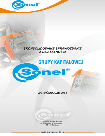 SKONSOLIDOWANE SPRAWOZDANIE Z DZIAŁALNOŚCI ZA I PÓŁROCZE 2013 SONEL Spółka Akcyjna ul. Stanisława Wokulskiego 11 58-100 Świdnica Świdnica, sierpień 2013 SKONSOLIDOWANE SPRAWOZDANIE Z DZIAŁALNOŚCI GRUPY KAPITAŁOWEJ SONEL ZA I PÓŁROCZE 2013 I. WSTĘP Niniejsze skonsolidowane sprawozdanie z działalności Grupy Kapitałowej SONEL sporządzone jest przez jednostkę dominującą - SONEL SA. Struktura grupy kapitałowej wygląda następująco: GRUPA KAPITAŁOWA SONEL SONEL SPÓŁKA AKCYJNA Polska, Świdnica 90% UDZIAŁOW OBJĘTYCH W DNIU 25-02-2013 SONEL INSTRUMENTS INDIA PRIVATE LIMITED Indie, Tamil Nadu Podstawowe dane o jednostce dominującej. Nazwa Firmy: SONEL Spółka Akcyjna Siedziba: 58-100 Świdnica ul. Wokulskiego 11, Organ Rejestrowy: Krajowy Rejestr Sądowy Numer wpisu do KRS: 0000090121 z dnia 14-02-2002 Podstawowy przedmiot działalności to: działalność produkcyjna w branży elektronicznej i elektrotechnicznej. W szczególności w spółce odbywa się produkcja przyrządów pomiarowych oraz usługowy montaż elementów elektronicznych. Podmiot zależny Nazwa Firmy: SONEL INSTRUMENTS INDIA PRIVATE LIMITED. Siedziba: Chennai (Madras), Tamil Nadu, Indie Corporate Identity Number : U74900TN2013FTC089751 Podstawowy przedmiot działalności to: zakup, sprzedaż, import, eksport, produkcja, oferowanie i handel przyrządami pomiarowymi. Czas trwania Grupy: nieoznaczony. Okresy, za które prezentowane jest sprawozdanie finansowe i porównywalne dane finansowe. Sprawozdanie finansowe sporządzono za okres: od 01-01-2013 do 30-06-2013 Dane porównywalne prezentowane są: za okres od 01-01-2012 do 30-06-2012 w zakresie rachunku zysków i strat wg stanu na dzień 30-06-2012 i 31-12-2012 w zakresie sytuacji bilansowej przedsiębiorstwa. II. OPIS ISTOTNYCH CZYNNIKÓW RYZYKA I ZAGROŻEŃ ZWIĄZANYCH Z POZOSTAŁYMI MIESIĄCAMI ROKU OBROTOWEGO Aktualne główne czynniki ryzyka oraz możliwe zagrożenia bezpośrednio związane z funkcjonowaniem najbliższych miesiącach dotyczą głownie podmiotu dominującego i są następujące: Grupy w • Ryzyko związane z utworzeniem w Indiach Spółki Zależnej. Ryzyku to wiąże się ze możliwością utraty kwoty około 100 000 euro kapitału zaangażowanego. Ryzyko wynika z braku doświadczeń na odległych rynkach, utrudnionego nadzoru i z trudności w nawiązaniu sprawnych relacji handlowych w Indiach. Wstępne analizy rynku wskazują, że w Indiach powinien istnieć popyt na produkty jednostki dominującej. • Ryzyko kryzysu gospodarczego. Z tym zjawiskiem powiązanych jest szereg niekorzystnych elementów. Najważniejsze z nich to utrata rynków zbytu, ryzyko powstania przeterminowanych (nieściągalnych) należności handlowych, ryzyko niezrealizowania przychodów ze sprzedaży, utrata kluczowych klientów, utrata nadwyżek finansowych powodująca zahamowanie rozwoju Spółki. Obniżenie skali działalności, w tym skali produkcji, w konsekwencji prowadzi do zmniejszenia rentowności prowadzonej działalności. Pogarsza się ocena rynku krajowego, przy poprawiających się danych zagranicznych. Gospodarka przestała liczyć na interwencję Państwa. Szacuje się, że kolejne półrocze nie wniesie żadnego elementu ożywienia. Jednocześnie w Spółce II półrocze powinno, jak co roku, skutkować zwiększoną sprzedażą i lepszymi wynikami. Strona 2 / 7 SKONSOLIDOWANE SPRAWOZDANIE Z DZIAŁALNOŚCI GRUPY KAPITAŁOWEJ SONEL ZA I PÓŁROCZE 2013 • Ryzyko znacznego spadku wartości euro. W razie spadku wartości euro Spółka SONEL będzie realizować przychody z tytułu sprzedaży zagranicznej na niższym poziomie. W chwili obecnej, w krótkim terminie ryzyko to występuje. Aktualnie kursy walut obcych odbiegają w górę od teoretycznego kursu równowagi. W dłuższej perspektywie spadek wartości euro może oznaczać spadek rentowności sprzedaży zagranicznej. Jednak próg rentowności dla sprzedaży denominowanej w euro wydaje się na tyle znaczący, że to ryzyko jest niewielkie. Aktualnie ekspozycja na ryzyko walutowe sięga do 20 % wolumenu i wydaje się mało istotna. • Ryzyko wzrostu wartości walut obcych w tym euro. Wzrost wartości euro powoduje, że drożeje cześć zakupów uzależnionych od wartości waluty euro (dotyczy to większości zakupów realizowanych poza granicą kraju oraz części dostaw realizowanych w Polsce). Jednak straty te skompensowane będą sprzedażą i wpływami uzyskiwanymi w walutach euro i dolar. Wobec nieznacznego wolumenu ekspozycji walutowej ryzyko to uznaje się za znikome. • Ryzyko przedłużania się prac wdrożeniowych w SONEL SA. Wystąpienie ryzyka spowoduje zmniejszenie sprzedaży (brak wyrobów ujętych w planie) i zwiększenie kosztów opracowania, a więc spadek rentowności wdrażanego produktu. Ograniczanie ryzyka następuje przez modyfikację procesu projektowana na bazie doświadczeń z dotychczasowych projektów. • Ryzyko dotyczące zobowiązań gwarancyjnych. Jest to normalne ryzyko producenta i nie ma szczególnych przesłanek do jego wzrostu. • Ryzyko związane z zapasami magazynowymi. Jednostka dominująca posiada znaczącą ilość i wartość zapasów materiałowych, półproduktów i wyrobów gotowych. Wynika to z rosnącej oferty przedsiębiorstwa. Z zapasami wiąże się szereg zagrożeń. Ryzyko nadmiernego zaangażowania środków, ryzyko przeterminowania części zapasów, ryzyko zestarzenia się technologicznego. Spółka na bieżąco monitoruje stan zapasów nierotujących. Co pół roku dokonuje aktualizacji wartości stanów magazynowych o wartość zapasów zbędnych. Podjęto interwencyjne działania zapobiegania powstawaniu zapasów magazynowych, opracowano odpowiednie procedury, których wprowadzenie minimalizuje narastanie zapasów trudnych. • Ryzyko wystąpienia wady seryjnej produktu. Jest to normalne ryzyko producenta. Emitent stale wdraża nowe modele wyrobów, co w opinii Zarządu zwiększa możliwość wystąpienia seryjnych wad wyrob