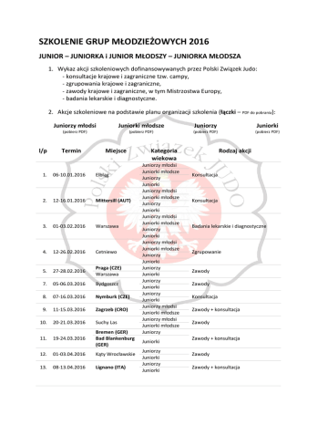 SZKOLENIE GRUP MŁODZIEŻOWYCH 2016 JUNIOR – JUNIORKA i JUNIOR MŁODSZY – JUNIORKA MŁODSZA 1. Wykaz akcji szkoleniowych dofinansowywanych przez Polski Związek Judo: - konsultacje krajowe i zagraniczne tzw. campy, - zgrupowania krajowe i zagraniczne, - zawody krajowe i zagraniczne, w tym Mistrzostwa Europy, - badania lekarskie i diagnostyczne. 2. Akcje szkoleniowe na podstawie planu organizacji szkolenia (łączki – PDF do pobrania): l/p Juniorzy młodsi Juniorki młodsze Juniorzy Juniorki (pobierz PDF) (pobierz PDF) (pobierz PDF) (pobierz PDF) Termin Miejsce 1. 06-10.01.2016 Elbląg 2. 12-16.01.2016 Mittersill (AUT) 3. 01-03.02.2016 Warszawa 4. 12-26.02.2016 Cetniewo 5. 27-28.02.2016 Praga (CZE) Warszawa 7. 05-06.03.2016 Bydgoszcz 8. 07-16.03.2016 Nymburk (CZE) 9. 11-15.03.2016 Zagrzeb (CRO) 10. 20-21.03.2016 Suchy Las 11. 19-24.03.2016 Bremen (GER) Bad Blankenburg (GER) 12. 01-03.04.2016 Kąty Wrocławskie 13. 08-13.04.2016 Lignano (ITA) Kategoria wiekowa Juniorzy młodsi Juniorki młodsze Juniorzy Juniorki Juniorzy młodsi Juniorki młodsze Juniorzy Juniorki Juniorzy młodsi Juniorki młodsze Juniorzy Juniorki Juniorzy młodsi Juniorki młodsze Juniorzy Juniorki Juniorzy Juniorki Juniorzy Juniorki Juniorzy Juniorki Juniorzy młodsi Juniorki młodsze Juniorzy młodsi Juniorki młodsze Juniorzy Juniorki Juniorzy Juniorki Juniorzy Juniorki Rodzaj akcji Konsultacja Konsultacja Badania lekarskie i diagnostyczne Zgrupowanie Zawody Zawody Konsultacja Zawody + konsultacja Zawody Zawody + konsultacja Zawody Zawody + konsultacja 14. 08-10.03.2016 Piła 15. 15-19.04.2016 Teplice (CZE) 16. 29.04-03.05.2016 Berlin (GER) 17. 06-8.05.2016 Kowno (LTU) 18. 11-15.05.2016 Elbląg 19. 20-25.05.2016 Bielsko-Biała 20. 22-25.05.2016 Bielsko-Biała 21. 27.05-01.06.2016 Leibnitz (AUT) 22. 04-08.06.2016 Opole 23. 10-20.06.2016 (ISR) 24. 16-29.06.2016 Giżycko 25. 18-24.06.2016 Porec (SLO) 26. 23.06-09.07.2016 Giżycko 27. 01-04.07.2016 Vantaa (FIN) 28. 11-30.07.2016 Cetniewo 29. 15-21.07.2016 Gdynia 30. 22-28.07.2016 Praga/Nymburg (CZE) 31. 29.07-03.08.2016 Berlin (GER) 32. 30.07-07.08.2016 (GEO) 33. 04-12.08.2016 Zakopane 34. 14-30.08.2016 Cetniewo Juniorzy młodsi Juniorki młodsze Juniorzy młodsi Juniorki młodsze Juniorzy młodsi Juniorki młodsze Juniorzy Juniorki Juniorzy młodsi Juniorki młodsze Juniorzy młodsi Juniorki młodsze Juniorzy Juniorki Juniorzy Juniorki Juniorzy młodsi Juniorki młodsze Juniorzy Juniorki Juniorzy młodsi Juniorki młodsze Juniorzy Juniorki Juniorzy młodsi Juniorki młodsze Juniorzy Juniorki Juniorzy Juniorki Juniorzy młodsi Juniorki młodsze Juniorzy młodsi Juniorki młodsze Juniorzy Juniorki Juniorzy młodsi Juniorki młodsze Juniorzy Juniorki Juniorzy Juniorki Juniorzy Juniorki Juniorzy młodsi Juniorzy Juniorzy młodsi Juniorki młodsze Juniorzy Juniorki Juniorzy młodsi Juniorki młodsze Juniorzy Juniorki Zawody Zawody + konsultacja Zawody + konsultacja Zawody Zawody Zawody + konsultacja Konsultacja Zawody + konsultacja Zawody + konsultacja Zgrupowanie Zgrupowanie Zgrupowanie Zgrupowanie Zawody Zgrupowanie Zawody + konsultacja Zawody + konsultacja Zawody + konsultacja Konsultacja Zgrupowanie Zgrupowanie 35. 2-3.09.2016 Sochaczew 36. 04-14.09.2016 Zakopane Esslingen (GER) 37. 15-18.09.2016 Malaga (ESP) 38. 23-27.09.2016 Warszawa 39. 14-23.10.2016 Oleśnica 40. 29-30.10.2016 Luboń 41. 01-08.11.2016 Hanower (GER) 42. 04-05.11.2016 Bytom 43. 04-09.11.2016 Tyumen (RUS) 44. 10-12.11.2016 Tel Awiw (ISR) 45. 11-12.11.2016 Suchy Las 46. 19-20.11.2016 Gdynia 47. 28-30.11.2016 Warszawa 48. 01-17.12.2016 Tokio (JPN) 49. 01-15.12.2016 Zakopane Juniorzy Juniorki Juniorzy młodsi Juniorki młodsze Juniorzy Juniorki Juniorzy Juniorki Juniorzy młodsi Juniorki młodsze Juniorzy Juniorki Juniorzy młodsi Juniorki młodsze Juniorzy Juniorki Juniorzy młodsi Juniorki młodsze Juniorzy młodsi Juniorki młodsze Juniorzy Juniorki Juniorzy młodsi Juniorki młodsze Juniorzy młodsi Juniorki młodsze Juniorzy Juniorki Juniorzy młodsi Juniorki młodsze Juniorzy młodsi Juniorki młodsze Juniorzy młodsi Juniorki młodsze Juniorzy Juniorki Juniorzy młodsi Juniorki młodsze Juniorzy Juniorki Juniorzy młodsi Juniorki młodsze Juniorzy Juniorki Zawody Zgrupowanie Zawody Zawody + konsultacja Zawody + konsultacja Zawody Zgrupowanie Zawody Zawody + konsultacja Zawody Zawody Zawody Badania lekarskie i diagnostyczne Zgrupowanie Zgrupowanie System kwalifikacji do imprez mistrzowskich Mistrzostwa Europy Juniorów młodszych Mistrzostwa Europy Juniorów 1. Wykaz zawodów kwalifikacyjnych: a) Kategoria wiekowa junior - juniorka: Turniej Międzynarodowy (juniorzy) Turniej Międzynarodowy (juniorki) Junior European Judo Cup Junior European Judo Cup Junior European Judo Cup Junior European Judo Cup Junior European Judo Cup Junior European Judo Cup 01-03.07.2016 16-18.09.2016 Vantaa / FIN Malaga / ESP Bremen / GER Bad Blankenburg / GER Lignano / ITA Kowno / LTU Leibnitz / AUT Gdynia / POL Praga / CZE Berlin / GER b) Kategoria wiekowa junior młodszy – juniorka młodsza: Cadet European Judo Cup Zagrzeb / CRO Cadet European Judo Cup Teplice / CZE Cadet European Judo Cup Berlin / GER Cadet European Judo Cup Bielsko-Biała / POL 2. Kryteria uczestnictwa w rywalizacji międzynarodowej: a) członkostwo w kadrze narodowej; b) udział w obowiązkowych konsultacjach, zgrupowaniach i zawodach PZJudo; c) udział w obowiązkowych badaniach lekarskich i diagnostycznych; d) posiadanie EKUZ (Europejska Karta Ubezpieczenia Zdrowotnego); (link do strony) e) oświadczenie rodziców lub opiekunów prawnych osób niepełnoletnich, wyrażające zgodę na udział w konsultacjach, zgrupowaniach lub zawodach; f) osoby, nie spełniające ww. kryteriów, mogą ubiegać się o uzyskanie tzw. DZIKIEJ KARTY (decyzja Koordynatora Grup Młodzieżowych). Minima kwalifikacyjne do imprez mistrzowskich 1. Zdobycie min.96 pkt. rankingowych w zawodach kwalifikacyjnych: a) zawody kwalifikacyjne juniorów i juniorek (Wykaz zawodó