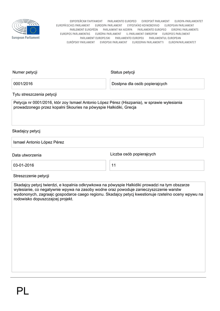 Numer petycji Status petycji 0001/2016 Dostpna dla osób popierajcych Tytu streszczenia petycji Petycja nr 0001/2016, któr zoy Ismael Antonio López Pérez (Hiszpania), w sprawie wylesiania prowadzonego przez kopalni Skouries na pówyspie Halkidiki, Grecja Skadajcy petycj Ismael Antonio López Pérez Data utworzenia Liczba osób popierajcych 03-01-2016 11 Streszczenie petycji Skadajcy petycj twierdzi, e kopalnia odkrywkowa na pówyspie Halkidiki prowadzi na tym obszarze wylesianie, co negatywnie wpywa na zasoby wodne oraz powoduje zanieczyszczenie warstw wodononych, zagraajc gospodarce caego regionu. Skadajcy petycj kwestionuje rzetelno oceny wpywu na rodowisko dopuszczajcej projekt. PL
