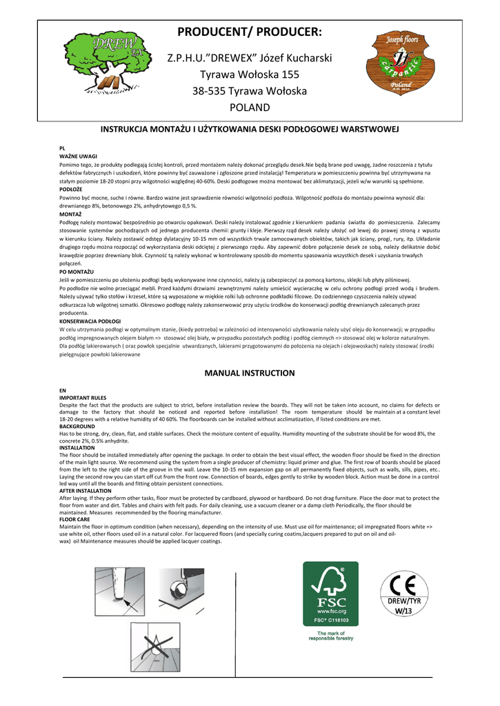 PRODUCENT/ PRODUCER: Z.P.H.U.”DREWEX” Józef Kucharski Tyrawa Wołoska 155 38-535 Tyrawa Wołoska POLAND INSTRUKCJA MONTAŻU I UŻYTKOWANIA DESKI PODŁOGOWEJ WARSTWOWEJ PL WAŻNE UWAGI Pomimo tego, że produkty podlegają ścisłej kontroli, przed montażem należy dokonać przeglądu desek.Nie będą brane pod uwagę, żadne roszczenia z tytułu defektów fabrycznych i uszkodzeń, które powinny być zauważone i zgłoszone przed instalacją! Temperatura w pomieszczeniu powinna być utrzymywana na stałym poziomie 18-20 stopni przy wilgotności względnej 40-60%. Deski podłogowe można montować bez aklimatyzacji, jeżeli w/w warunki są spełnione. PODŁOŻE Powinno być mocne, suche i równe. Bardzo ważne jest sprawdzenie równości wilgotności podłoża. Wilgotność podłoża do montażu powinna wynosić dla: drewnianego 8%, betonowego 2%, anhydrytowego 0,5 %. MONTAŻ Podłogę należy montować bezpośrednio po otwarciu opakowań. Deski należy instalować zgodnie z kierunkiem padania światła do pomieszczenia. Zalecamy stosowanie systemów pochodzących od jednego producenta chemii: grunty i kleje. Pierwszy rząd desek należy ułożyć od lewej do prawej stroną z wpustu w kierunku ściany. Należy zostawić odstęp dylatacyjny 10-15 mm od wszystkich trwale zamocowanych obiektów, takich jak ściany, progi, rury, itp. Układanie drugiego rzędu można rozpocząć od wykorzystania deski odciętej z pierwszego rzędu. Aby zapewnić dobre połączenie desek ze sobą, należy delikatnie dobić krawędzie poprzez drewniany blok. Czynność tą należy wykonać w kontrolowany sposób do momentu spasowania wszystkich desek i uzyskania trwałych połączeń. PO MONTAŻU Jeśli w pomieszczeniu po ułożeniu podłogi będą wykonywane inne czynności, należy ją zabezpieczyć za pomocą kartonu, sklejki lub płyty pilśniowej. Po podłodze nie wolno przeciągać mebli. Przed każdymi drzwiami zewnętrznymi należy umieścić wycieraczkę w celu ochrony podłogi przed wodą i brudem. Należy używać tylko stołów i krzeseł, które są wyposażone w miękkie rolki lub ochronne podkładki filcowe. Do codziennego czyszczenia należy używać odkurzacza lub wilgotnej szmatki. Okresowo podłogę należy zakonserwować przy użyciu środków do konserwacji podłóg drewnianych zalecanych przez producenta. KONSERWACJA PODŁOGI W celu utrzymania podłogi w optymalnym stanie, (kiedy potrzeba) w zależności od intensywności użytkowania należy użyć oleju do konserwacji; w przypadku podłóg impregnowanych olejem białym => stosować olej biały, w przypadku pozostałych podłóg i podłóg ciemnych => stosować olej w kolorze naturalnym. Dla podłóg lakierowanych ( oraz powłok specjalnie utwardzanych, lakierami przygotowanymi do położenia na olejach i olejowoskach) należy stosować środki pielęgnujące powłoki lakierowane MANUAL INSTRUCTION EN IMPORTANT RULES Despite the fact that the products are subject to strict, before installation review the boards. They will not be taken into account, no claims for defects or damage to the factory that should be noticed and reported before installation! The room temperature should be maintain at a constant level 18-20 degrees with a relative humidity of 40 60%. The floorboards can be installed without acclimatization, if listed conditions are met. BACKGROUND Has to be strong, dry, clean, flat, and stable surfaces. Check the moisture content of equality. Humidity mounting of the substrate should be for wood 8%, the concrete 2%, 0.5% anhydrite. INSTALLATION The floor should be installed immediately after opening the package. In order to obtain the best visual effect, the wooden floor should be fixed in the direction of the main light source. We recommend using the system from a single producer of chemistry: liquid primer and glue. The first row of boards should be placed from the left to the right side of the groove in the wall. Leave the 10-15 mm expansion gap on all permanently fixed objects, such as walls, sills, pipes, etc.. Laying the second row you can start off cut from the front row. Connection of boards, edges gently to strike by wooden block. Action must be done in a control led way until all the boards and fitting obtain persistent connections. AFTER INSTALLATION After laying. If they perform other tasks, floor must be protected by cardboard, plywood or hardboard. Do not drag furniture. Place the door mat to protect the floor from water and dirt. Tables and chairs with felt pads. For daily cleaning, use a vacuum cleaner or a damp cloth Periodically, the floor should be maintained. Measures recommended by the flooring manufacturer. FLOOR CARE Maintain the floor in optimum condition (when necessary), depending on the intensity of use. Must use oil for maintenance; oil impregnated floors white => use white oil, other floors used oil in a natural color. For lacquered floors (and specially curing coatins,lacquers prepared to put on oil and oilwax) oil Maintenance measures should be applied lacquer coatings.
