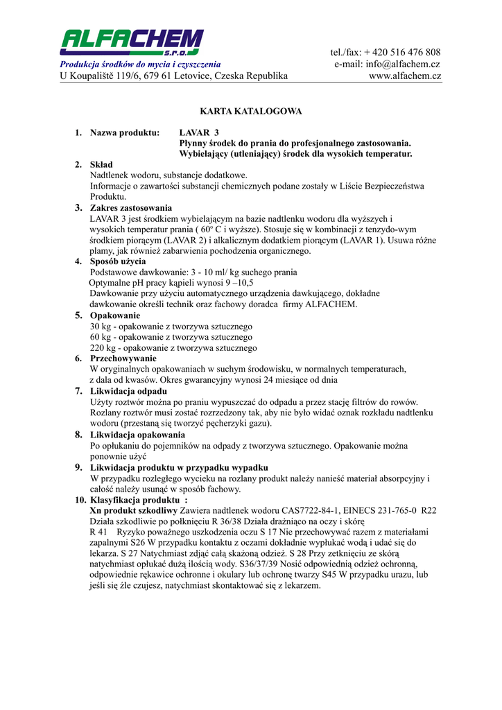 Produkcja środków do mycia i czyszczenia U Koupaliště 119/6, 679 61 Letovice, Czeska Republika tel./fax: + 420 516 476 808 e-mail: [email protected] www.alfachem.cz KARTA KATALOGOWA 1. Nazwa produktu: LAVAR 3 Płynny środek do prania do profesjonalnego zastosowania. Wybielający (utleniający) środek dla wysokich temperatur. 2. Skład Nadtlenek wodoru, substancje dodatkowe. Informacje o zawartości substancji chemicznych podane zostały w Liście Bezpieczeństwa Produktu. 3. Zakres zastosowania LAVAR 3 jest środkiem wybielającym na bazie nadtlenku wodoru dla wyższych i wysokich temperatur prania ( 60o C i wyższe). Stosuje się w kombinacji z tenzydo-wym środkiem piorącym (LAVAR 2) i alkalicznym dodatkiem piorącym (LAVAR 1). Usuwa różne plamy, jak również zabarwienia pochodzenia organicznego. 4. Sposób użycia Podstawowe dawkowanie: 3 - 10 ml/ kg suchego prania Optymalne pH pracy kąpieli wynosi 9 –10,5 Dawkowanie przy użyciu automatycznego urządzenia dawkującego, dokładne dawkowanie określi technik oraz fachowy doradca firmy ALFACHEM. 5. Opakowanie 30 kg - opakowanie z tworzywa sztucznego 60 kg - opakowanie z tworzywa sztucznego 220 kg - opakowanie z tworzywa sztucznego 6. Przechowywanie W oryginalnych opakowaniach w suchym środowisku, w normalnych temperaturach, z dala od kwasów. Okres gwarancyjny wynosi 24 miesiące od dnia 7. Likwidacja odpadu Użyty roztwór można po praniu wypuszczać do odpadu a przez stację filtrów do rowów. Rozlany roztwór musi zostać rozrzedzony tak, aby nie było widać oznak rozkładu nadtlenku wodoru (przestaną się tworzyć pęcherzyki gazu). 8. Likwidacja opakowania Po opłukaniu do pojemników na odpady z tworzywa sztucznego. Opakowanie można ponownie użyć 9. Likwidacja produktu w przypadku wypadku W przypadku rozległego wycieku na rozlany produkt należy nanieść materiał absorpcyjny i całość należy usunąć w sposób fachowy. 10. Klasyfikacja produktu : Xn produkt szkodliwy Zawiera nadtlenek wodoru CAS7722-84-1, EINECS 231-765-0 R22 Działa szkodliwie po połknięciu R 36/38 Działa drażniąco na oczy i skórę R 41 Ryzyko poważnego uszkodzenia oczu S 17 Nie przechowywać razem z materiałami zapalnymi S26 W przypadku kontaktu z oczami dokładnie wypłukać wodą i udać się do lekarza. S 27 Natychmiast zdjąć całą skażoną odzież. S 28 Przy zetknięciu ze skórą natychmiast opłukać dużą ilością wody. S36/37/39 Nosić odpowiednią odzież ochronną, odpowiednie rękawice ochronne i okulary lub ochronę twarzy S45 W przypadku urazu, lub jeśli się źle czujesz, natychmiast skontaktować się z lekarzem.