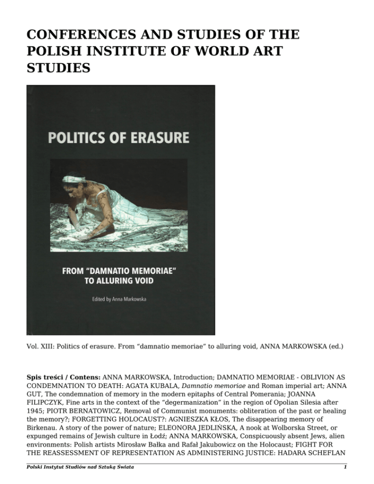 CONFERENCES AND STUDIES OF THE POLISH INSTITUTE OF WORLD ART STUDIES Vol. XIII: Politics of erasure. From “damnatio memoriae” to alluring void, ANNA MARKOWSKA (ed.) Spis treści / Contens: ANNA MARKOWSKA, Introduction; DAMNATIO MEMORIAE - OBLIVION AS CONDEMNATION TO DEATH: AGATA KUBALA, Damnatio memoriae and Roman imperial art; ANNA GUT, The condemnation of memory in the modern epitaphs of Central Pomerania; JOANNA FILIPCZYK, Fine arts in the context of the “degermanization” in the region of Opolian Silesia after 1945; PIOTR BERNATOWICZ, Removal of Communist monuments: obliteration of the past or healing the memory?; FORGETTING HOLOCAUST?: AGNIESZKA KŁOS, The disappearing memory of Birkenau. A story of the power of nature; ELEONORA JEDLIŃSKA, A nook at Wolborska Street, or expunged remains of Jewish culture in Łodź; ANNA MARKOWSKA, Conspicuously absent Jews, alien environments: Polish artists Mirosław Bałka and Rafał Jakubowicz on the Holocaust; FIGHT FOR THE REASSESSMENT OF REPRESENTATION AS ADMINISTERING JUSTICE: HADARA SCHEFLAN Polski Instytut Studiów nad Sztuką Świata 1 KATZAV, Re-representation – critical art and the return of the repressed; ANNA ZIĘBIŃSKA-WITEK, Historical museums: between representation and illusion; XANTHI TSIFTSI, Void, the art of erasure. Representing absence in the Jewish Museum Berlin; MARTA SMOLIŃSKA, Jan Berdyszak. Between paradigms of modernity or nowhere? Subjective remarks across the post-war history of art in Poland; LUCIA POPA, Removing Romania: the Western art world colonized by the “East”; AGNĖ NARUŠYTĖ, Memory of erased time in The Soldier’s Diary by Lithuanian artist Gintaras Zinkevičius; ANDRZEJ JAROSZ, The absent ones – placing the post-war Wrocław painting in the context of Polish art; AGATA SOCZYŃSKA, Marek Oberlander – a painter undesired by the time; ALICJA PALĘCKA, Visualizing the other: ethnographic film as thick description; JED SPEARE,Washing up memories: some strategies of Milan Kohout’s performance activism; TYRANNY OF THE VISIBLE AND THE TYRANNY OF THE IDEA: CAMELIA GRADINARU, Visual tyranny as autopoiesis; RAFAŁ EYSYMONTT, The town as a palimpsest. Erasing and recovering the medieval town; MICHAŁ ZAWADA, Imaging iconoclasm; JAKUB ZARZYCKI, Polish history painting in the second half of the nineteenth century as a “quasi-metanarrative”. Visible tyranny of Idea?; ZUZANNA ILNICKA, Gerhard Richter’s failing memory. The October 18, 1977 and the need to allow doubt; MAŁGORZATA KSENIA KRZYŻANOWSKA, „Nothing is getting as old as modernity” – i.e. why the trend for Nine Graphic Artists Group has passed; AGNIESZKA SINICKA,Wilhem Sasnal’s photophobia; ANNA STEC, Anish Kapoor, Memory; ANNA SIKORA-SABAT, Romantic creation and socialist erasure: representation of Vincent van Gogh in the printed media of the People’s Republic of Poland; ETHOS OF DEPRIVATION OR IRREVOCABLE AMBIVALENCE: MAGDALENA ZIĘBA, Authenticity (aura) recycled. Erasing originality in appropriation art; RAFAŁ ILNICKI, Digital Lethe of transhumanism: weak mind uploading as erasure of individual and collective memory; AGNIESZKA BANDURA, Politics of replacing in New Romanticism; KATARZYNA BOJARSKA, Spectrality and the possibility of seeing (loss). Photography against the referentiality of history; BARBARA SZCZEPANIAK, Strategy of erasing, manipulation and destruction in photography – interpretation Aneta Grzeszykowska’s Album; ALICJA KLIMCZAK-DOBRZANIECKA, PATRYCJA SIKORA, Erasure. Memory Exercises. Polish Institute of World Art Studies & Tako Publishing House, Warsaw–Torun 2014 978–83–62737–66–6 (179 pp.) Polski Instytut Studiów nad Sztuką Świata IS BN 2