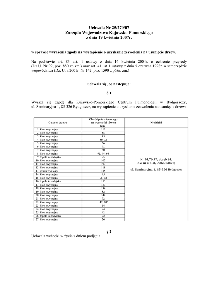 Uchwała Nr 25/270/07 Zarządu Województwa Kujawsko-Pomorskiego z dnia 19 kwietnia 2007r. w sprawie wyrażenia zgody na wystąpienie o uzyskanie zezwolenia na usunięcie drzew. Na podstawie art. 83 ust. 1 ustawy z dnia 16 kwietnia 2004r. o ochronie przyrody (Dz.U. Nr 92, poz. 880 ze zm.) oraz art. 41 ust 1 ustawy z dnia 5 czerwca 1998r. o samorządzie województwa (Dz. U. z 2001r. Nr 142, poz. 1590 z późn. zm.) uchwala się, co następuje: §1 Wyraża się zgodę dla Kujawsko-Pomorskiego Centrum Pulmonologii w Bydgoszczy, ul. Seminaryjna 1, 85-326 Bydgoszcz, na wystąpienie o uzyskanie zezwolenia na usunięcie drzew: Gatunek drzewa 1. klon zwyczajny 2. klon zwyczajny 3. klon zwyczajny 4. klon zwyczajny 5. klon zwyczajny 6. klon zwyczajny 7. klon zwyczajny 8. klon zwyczajny 9. topola kanadyjska 10. klon zwyczajny 11. klon zwyczajny 12. klon zwyczajny 13. jesion wyniosły 14. klon zwyczajny 15. klon zwyczajny 16. topola kanadyjska 17. klon zwyczajny 18. klon zwyczajny 19. klon zwyczajny 20. klon zwyczajny 21. klon zwyczajny 22. klon zwyczajny 23. klon zwyczajny 24. klon zwyczajny 25. klon zwyczajny 26. topola kanadyjska 27. klon zwyczajny Obwód pnia mierzonego na wysokości 130 cm (cm ) 112 58 45 50, 72 36 48 60 95, 44, 66 95 107 197 118 135 45 95, 92 153 133 194 82 144 72 142, 106 54 74 42 72 26 §2 Uchwała wchodzi w życie z dniem podjęcia. Nr działki Nr 74,76,77, obręb 84, KW nr BY1B/00029538/6) ul. Seminaryjna 1, 85-326 Bydgoszcz