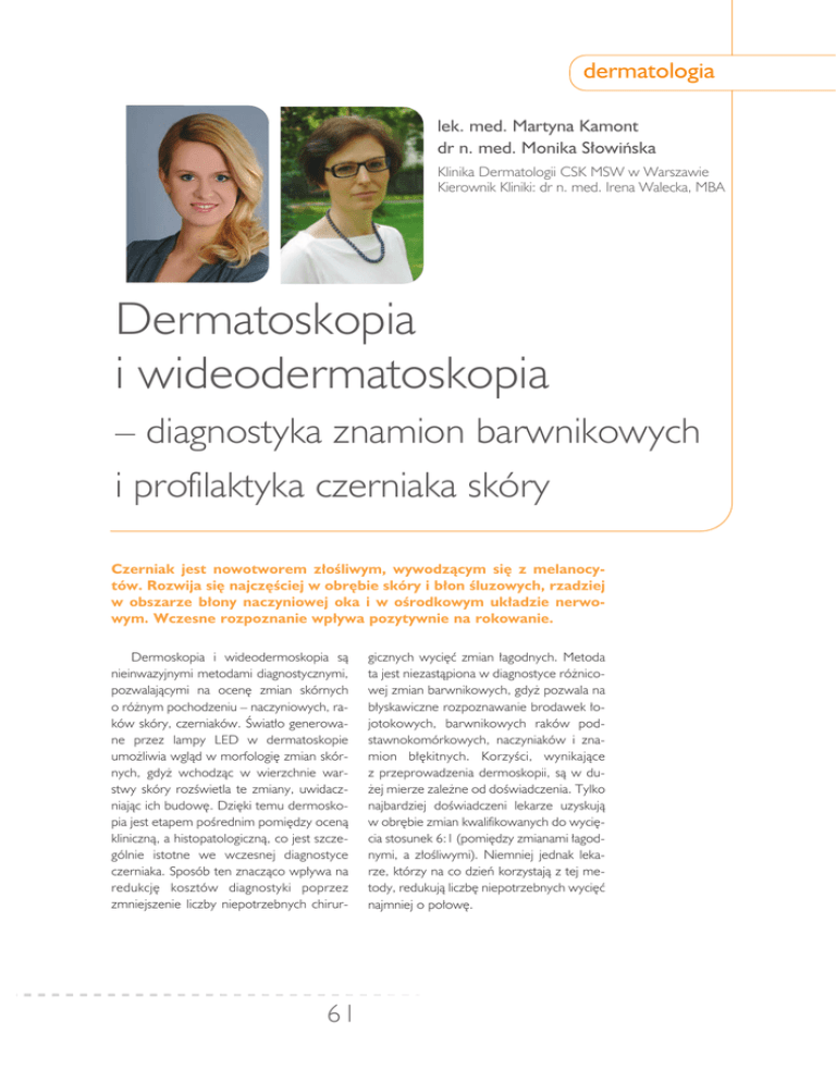 dermatologia lek. med. Martyna Kamont dr n. med. Monika Słowińska Klinika Dermatologii CSK MSW w Warszawie Kierownik Kliniki: dr n. med. Irena Walecka, MBA Dermatoskopia i wideodermatoskopia – diagnostyka znamion barwnikowych i profilaktyka czerniaka skóry Czerniak jest nowotworem złośliwym, wywodzącym się z melanocytów. Rozwija się najczęściej w obrębie skóry i błon śluzowych, rzadziej w obszarze błony naczyniowej oka i w ośrodkowym układzie nerwowym. Wczesne rozpoznanie wpływa pozytywnie na rokowanie. Dermoskopia i wideodermoskopia są nieinwazyjnymi metodami diagnostycznymi, pozwalającymi na ocenę zmian skórnych o różnym pochodzeniu – naczyniowych, raków skóry, czerniaków. Światło generowane przez lampy LED w dermatoskopie umożliwia wgląd w morfologię zmian skórnych, gdyż wchodząc w wierzchnie warstwy skóry rozświetla te zmiany, uwidaczniając ich budowę. Dzięki temu dermoskopia jest etapem pośrednim pomiędzy oceną kliniczną, a histopatologiczną, co jest szczególnie istotne we wczesnej diagnostyce czerniaka. Sposób ten znacząco wpływa na re duk cję ko sztów dia gno sty ki po przez zmniejszenie liczby niepotrzebnych chirur- 61 gicznych wycięć zmian łagodnych. Metoda ta jest niezastąpiona w diagnostyce różnicowej zmian barwnikowych, gdyż pozwala na błyskawiczne rozpoznawanie brodawek łojotokowych, barwnikowych raków podstawnokomórkowych, naczyniaków i znamion błę kit nych. Ko rzy ści, wy ni ka ją ce z przeprowadzenia dermoskopii, są w dużej mierze zależne od doświadczenia. Tylko najbardziej doświadczeni lekarze uzyskują w obrębie zmian kwalifikowanych do wycięcia stosunek 6:1 (pomiędzy zmianami łagodnymi, a złośliwymi). Niemniej jednak lekarze, którzy na co dzień korzystają z tej metody, redukują liczbę niepotrzebnych wycięć najmniej o połowę. Tab. 1. Porównanie dermoskopii niepolaryzacyjnej i polaryzacyjnej. Kolory i struktury Dermoskopia niepolaryzacyjna Dermoskopia polaryzacyjna kolory melanina + ++ czerwony/różowy + +++ niebiesko-biały (regresja) +++ ++ ziarna pieprzu +++ ++ struktury krystaliczne lub bliznowacenie +/- +++ naczynia + +++ struktury prosakopodobne +++ +/- struktury Wyróżnia się dwa rodzaje dermoskopów: niepolaryzacyjne i polaryzacyjne. W dermoskopach źródłem światła są diody LED, różnią się natężeniem (intensywnością), barwą światła, współczynnikiem odwzorowania barw. Niezależnie od źródła światła, dermatoskopy posiadają filtr polaryzacyjny lub nie. W klasycznej dermoskopii powierzchnię badanej skóry pokrywa się alkoholem, wodą, olejem mineralnym, olejkiem immersyjnym lub żelem, które minimalizują rozproszenia światła na powierzchni i sprawiają, że warstwa rogowa naskórka staje się bardziej przejrzysta. Pozwala to uwidocznić głębiej położone kolory i struktury. W demoskopii polaryzacyjnej badanie przeprowadza się bezimersyjnie w kontakcie ze skórą lub bez. W najnowszych dermatoskopach polaryzacyjnych stosuje się również korekcję barwy światła pomarańczowymi diodami. Oba typy dermoskopów dostarczają często uzupełniających się informacji. Dlatego ciekawym rozwiązaniem są dermoskopy, które mają funkcję przełączania trybu polaryzacyjnego na tryb niepolaryzacyjny. Istnieją również systemy fotograficzne, które umożliwiają archiwizację obrazów dermatoskopowych za pomocą dermatoskopów ręcznych, połączonych z aparatem cyfrowym, smartfonem lub tabletem lub też specjalnie dedykowanych rozwiązań, takich jak Dermlite CAM lub Foto 2 Pro. Wideodermoskopia umożliwia bardziej dokładną analizę znamion barwnikowych, dzięki możliwości powiększania obrazu nawet 120 razy. Systemy komputerowe, które przeznaczone są do obsługi wideodermoskopów, umożliwiają również wygodne porównanie znamion barwnikowych w czasie. Umożliwia to ocenę zakresu zmian, zachodzących w badanym obiekcie. Wśród systemów tych wymienia się najbardziej znane: MicroDerm, Fotofinder, Molemax, DermoGenius, oraz MoleMate, Solarscan, DB-Dermo Mips. Istnieje wiele algorytmów, służących do oceny dermoskopowej. Dwustopniowy algorytm diagnostyczny stanowi podstawę oceny dermoskopowej zmian skórnych. W pierwszym etapie należy rozstrzygnąć, czy zmiana jest melanocytowa, a następnie – czy jest czerniakiem bądź zmianą łagodną. 3-punktowa lista kontrolna obejmuje ocenę obecności asymetrii koloru i struktury, atypowej siatki barwnikowej oraz regresji. Obecność dwóch z powyższych kryteriów kwalifikuje daną zmianę do wycięcia. Inne algorytmy oceny zmian barwnikowych to: analiza wzoru zmiany, reguła ABCD, metoda Menziesa, 7-punktowa lista kontrolna Argenziano i algorytm CASH. 62 Analiza wzoru zmiany obejmuje ocenę wzoru ogólnego z połączeniem lokalnych kryteriów specyficznych dla czerniaka. 10 łagodnych wzorów dermoskopowych to wzór siateczkowaty w różnych jego odmianach: 1. jednorodny, 2. rozmieszczony wyspowo, 3. z homogennym odbarwieniem, 4. z homogennym zabarwieniem, 5. obwodowa siatka z centralnie położonymi globulami, 6. obwodowe globule z centralnie położoną siatką barwnikową lub obszarem homogennym lub wzór wybuchu gwiazdy, 7. globularny, 8. homogenny, 9. dwuskładnikowy, 10. symetryczny wieloskładnikowy. Struktury specyficzne dla czerniaka złośliwego obejmują: atypową siatkę barwnikową, nieregularne smugi i pseudopodia, negatywną siatkę barwnikową, struktury krystaliczne, atypowe kropki i globule, nieregularne plamy barwnika, struktury w kolorze niebieskobiałym, atypowe struktury naczyniowe, obwodowe brązowe bezpostaciowe obszary. Reguła ABCD ocenia asymetrię zmiany, jej brzeg, kolor oraz obecność następujących struktur dermoskpowych: siatki barwnikowej, obszarów bezstrukturalnych, smug promienistych, kropek i globul. Każda cecha jest oddzielnie punktowana. Gdy suma przekracza 4,75 zmiana jest oceniana jako podejrzana, natomiast punktacja powyżej 5,45 sugeruje r