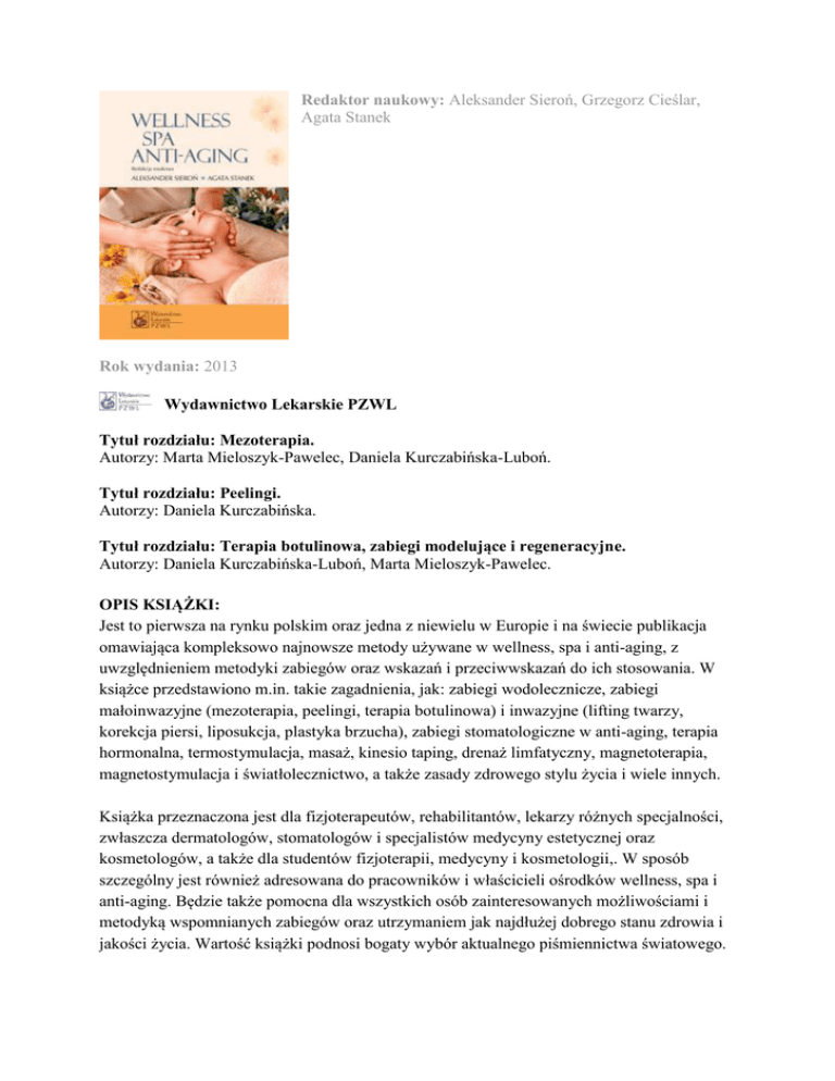 Redaktor naukowy: Aleksander Sieroń, Grzegorz Cieślar, Agata Stanek Rok wydania: 2013 Wydawnictwo Lekarskie PZWL Tytuł rozdziału: Mezoterapia. Autorzy: Marta Mieloszyk-Pawelec, Daniela Kurczabińska-Luboń. Tytuł rozdziału: Peelingi. Autorzy: Daniela Kurczabińska. Tytuł rozdziału: Terapia botulinowa, zabiegi modelujące i regeneracyjne. Autorzy: Daniela Kurczabińska-Luboń, Marta Mieloszyk-Pawelec. OPIS KSIĄŻKI: Jest to pierwsza na rynku polskim oraz jedna z niewielu w Europie i na świecie publikacja omawiająca kompleksowo najnowsze metody używane w wellness, spa i anti-aging, z uwzględnieniem metodyki zabiegów oraz wskazań i przeciwwskazań do ich stosowania. W książce przedstawiono m.in. takie zagadnienia, jak: zabiegi wodolecznicze, zabiegi małoinwazyjne (mezoterapia, peelingi, terapia botulinowa) i inwazyjne (lifting twarzy, korekcja piersi, liposukcja, plastyka brzucha), zabiegi stomatologiczne w anti-aging, terapia hormonalna, termostymulacja, masaż, kinesio taping, drenaż limfatyczny, magnetoterapia, magnetostymulacja i światłolecznictwo, a także zasady zdrowego stylu życia i wiele innych. Książka przeznaczona jest dla fizjoterapeutów, rehabilitantów, lekarzy różnych specjalności, zwłaszcza dermatologów, stomatologów i specjalistów medycyny estetycznej oraz kosmetologów, a także dla studentów fizjoterapii, medycyny i kosmetologii,. W sposób szczególny jest również adresowana do pracowników i właścicieli ośrodków wellness, spa i anti-aging. Będzie także pomocna dla wszystkich osób zainteresowanych możliwościami i metodyką wspomnianych zabiegów oraz utrzymaniem jak najdłużej dobrego stanu zdrowia i jakości życia. Wartość książki podnosi bogaty wybór aktualnego piśmiennictwa światowego.