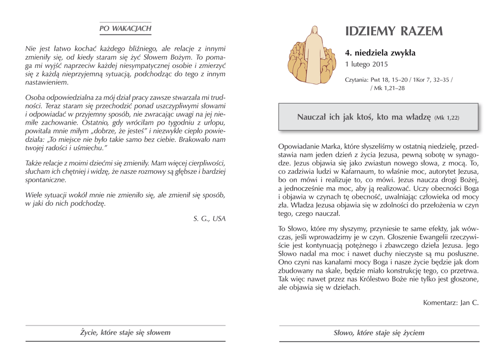 Idziemy razem Po wakacjach Nie jest łatwo kochać każdego bliźniego, ale relacje z innymi zmieniły się, od kiedy staram się żyć Słowem Bożym. To pomaga mi wyjść naprzeciw każdej niesympatycznej osobie i zmierzyć się z każdą nieprzyjemną sytuacją, podchodząc do tego z innym nastawieniem. Osoba odpowiedzialna za mój dział pracy zawsze stwarzała mi trudności. Teraz staram się przechodzić ponad uszczypliwymi słowami i odpowiadać w przyjemny sposób, nie zwracając uwagi na jej niemiłe zachowanie. Ostatnio, gdy wróciłam po tygodniu z urlopu, powitała mnie miłym „dobrze, że jesteś” i niezwykle ciepło powiedziała: „To miejsce nie było takie samo bez ciebie. Brakowało nam twojej radości i uśmiechu.” Także relacje z moimi dziećmi się zmieniły. Mam więcej cierpliwości, słucham ich chętniej i widzę, że nasze rozmowy są głębsze i bardziej spontaniczne. Wiele sytuacji wokół mnie nie zmieniło się, ale zmienił się sposób, w jaki do nich podchodzę. S. G., USA 4. niedziela zwykła 1 lutego 2015 Czytania: P wt 18, 15–20 / 1Kor 7, 32–35 / / Mk 1,21–28 Nauczał ich jak ktoś, kto ma władzę (Mk 1,22) Opowiadanie Marka, które słyszeliśmy w ostatnią niedzielę, przedstawia nam jeden dzień z życia Jezusa, pewną sobotę w synagodze. Jezus objawia się jako zwiastun nowego słowa, z mocą. To, co zadziwia ludzi w Kafarnaum, to właśnie moc, autorytet Jezusa, bo on mówi i realizuje to, co mówi. Jezus naucza drogi Bożej, a jednocześnie ma moc, aby ją realizować. Uczy obecności Boga i objawia w czynach tę obecność, uwalniając człowieka od mocy zła. Władza Jezusa objawia się w zdolności do przełożenia w czyn tego, czego nauczał. To Słowo, które my słyszymy, przyniesie te same efekty, jak wówczas, jeśli wprowadzimy je w czyn. Głoszenie Ewangelii rzeczywiście jest kontynuacją potężnego i zbawczego dzieła Jezusa. Jego Słowo nadal ma moc i nawet duchy nieczyste są mu posłuszne. Ono czyni nas kanałami mocy Boga i nasze życie będzie jak dom zbudowany na skale, będzie miało konstrukcję tego, co przetrwa. Tak więc nawet przez nas Królestwo Boże nie tylko jest głoszone, ale objawia się w dziełach. Komentarz: Jan C. Życie, które staje się słowem Słowo, które staje się życiem