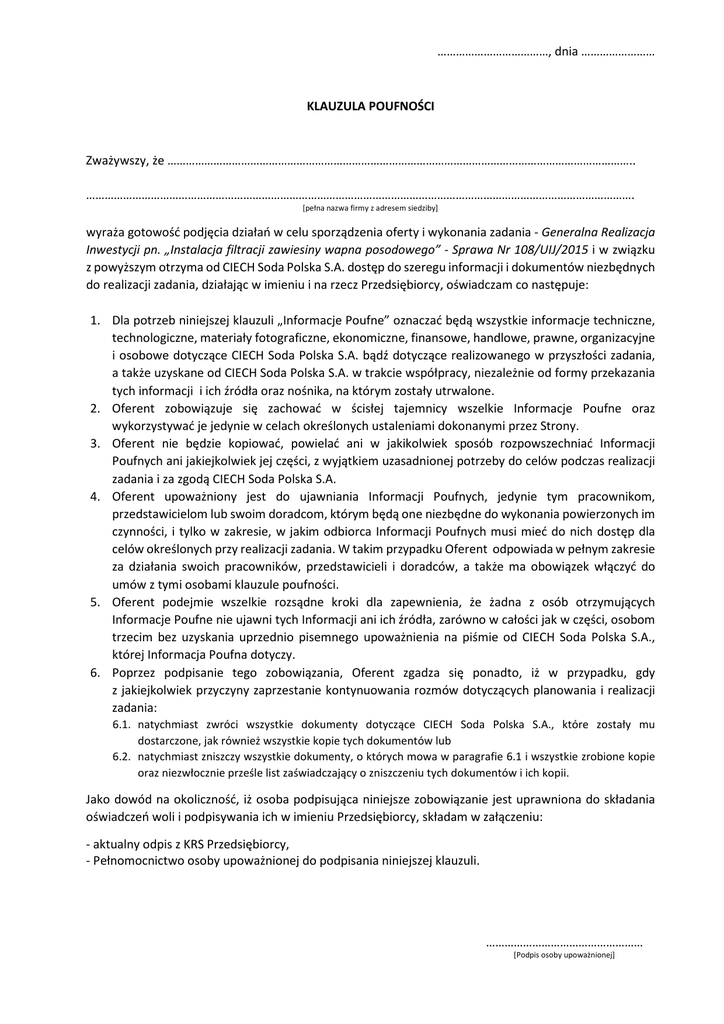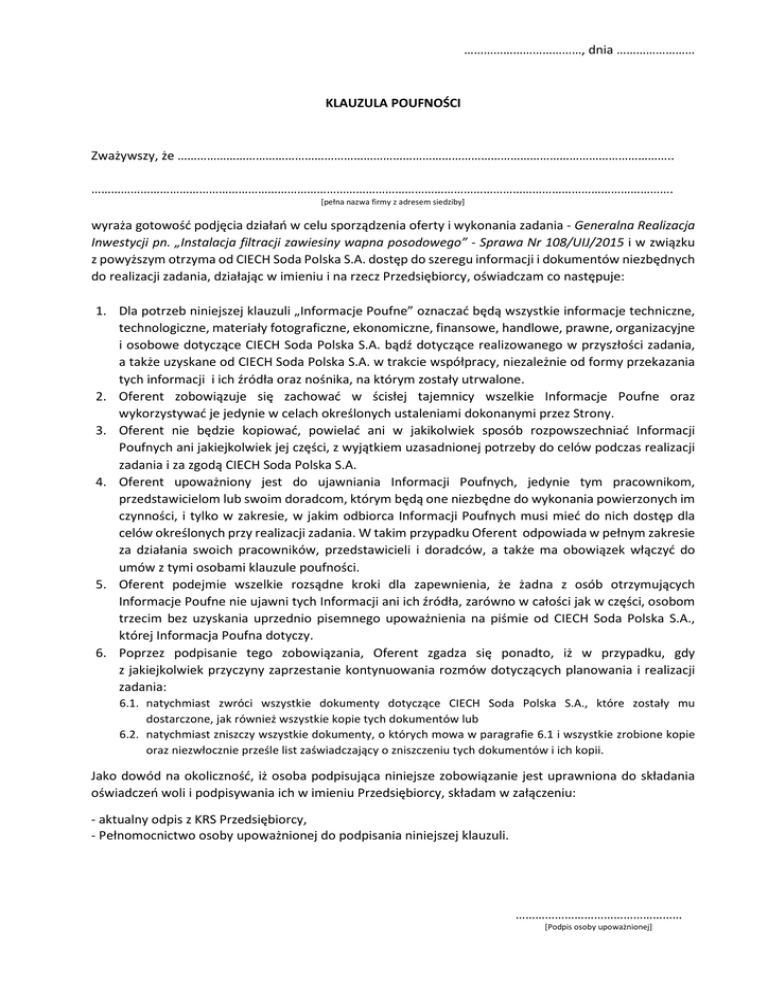 ………………………………, dnia …………………… KLAUZULA POUFNOŚCI Zważywszy, że …………………………………………………………………………………………………………………………………….. ……………………………………………………………………………………………………………………………………………………………. [pełna nazwa firmy z adresem siedziby] wyraża gotowość podjęcia działań w celu sporządzenia oferty i wykonania zadania - Generalna Realizacja Inwestycji pn. „Instalacja filtracji zawiesiny wapna posodowego” - Sprawa Nr 108/UIJ/2015 i w związku z powyższym otrzyma od CIECH Soda Polska S.A. dostęp do szeregu informacji i dokumentów niezbędnych do realizacji zadania, działając w imieniu i na rzecz Przedsiębiorcy, oświadczam co następuje: 1. Dla potrzeb niniejszej klauzuli „Informacje Poufne” oznaczać będą wszystkie informacje techniczne, technologiczne, materiały fotograficzne, ekonomiczne, finansowe, handlowe, prawne, organizacyjne i osobowe dotyczące CIECH Soda Polska S.A. bądź dotyczące realizowanego w przyszłości zadania, a także uzyskane od CIECH Soda Polska S.A. w trakcie współpracy, niezależnie od formy przekazania tych informacji i ich źródła oraz nośnika, na którym zostały utrwalone. 2. Oferent zobowiązuje się zachować w ścisłej tajemnicy wszelkie Informacje Poufne oraz wykorzystywać je jedynie w celach określonych ustaleniami dokonanymi przez Strony. 3. Oferent nie będzie kopiować, powielać ani w jakikolwiek sposób rozpowszechniać Informacji Poufnych ani jakiejkolwiek jej części, z wyjątkiem uzasadnionej potrzeby do celów podczas realizacji zadania i za zgodą CIECH Soda Polska S.A. 4. Oferent upoważniony jest do ujawniania Informacji Poufnych, jedynie tym pracownikom, przedstawicielom lub swoim doradcom, którym będą one niezbędne do wykonania powierzonych im czynności, i tylko w zakresie, w jakim odbiorca Informacji Poufnych musi mieć do nich dostęp dla celów określonych przy realizacji zadania. W takim przypadku Oferent odpowiada w pełnym zakresie za działania swoich pracowników, przedstawicieli i doradców, a także ma obowiązek włączyć do umów z tymi osobami klauzule poufności. 5. Oferent podejmie wszelkie rozsądne kroki dla zapewnienia, że żadna z osób otrzymujących Informacje Poufne nie ujawni tych Informacji ani ich źródła, zarówno w całości jak w części, osobom trzecim bez uzyskania uprzednio pisemnego upoważnienia na piśmie od CIECH Soda Polska S.A., której Informacja Poufna dotyczy. 6. Poprzez podpisanie tego zobowiązania, Oferent zgadza się ponadto, iż w przypadku, gdy z jakiejkolwiek przyczyny zaprzestanie kontynuowania rozmów dotyczących planowania i realizacji zadania: 6.1. natychmiast zwróci wszystkie dokumenty dotyczące CIECH Soda Polska S.A., które zostały mu dostarczone, jak również wszystkie kopie tych dokumentów lub 6.2. natychmiast zniszczy wszystkie dokumenty, o których mowa w paragrafie 6.1 i wszystkie zrobione kopie oraz niezwłocznie prześle list zaświadczający o zniszczeniu tych dokumentów i ich kopii. Jako dowód na okoliczność, iż osoba podpisująca niniejsze zobowiązanie jest uprawniona do składania oświadczeń woli i podpisywania ich w imieniu Przedsiębiorcy, składam w załączeniu: - aktualny odpis z KRS Przedsiębiorcy, - Pełnomocnictwo osoby upoważnionej do podpisania niniejszej klauzuli. …………………………………………… [Podpis osoby upoważnionej]
