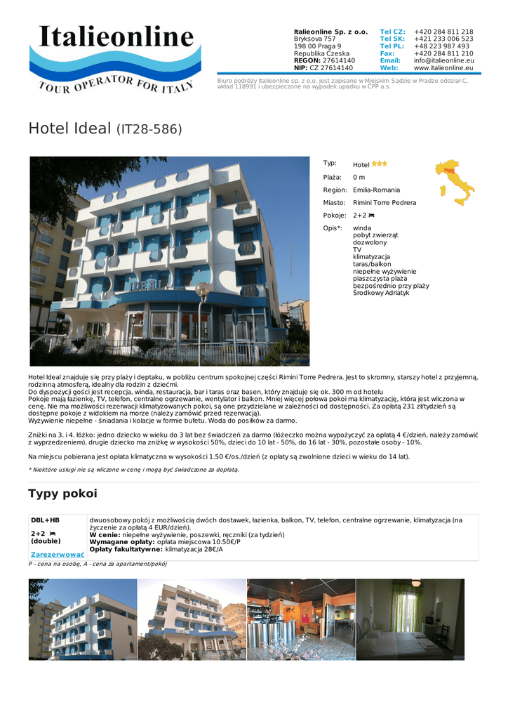 Italieonline Sp. z o.o. Bryksova 757 198 00 Praga 9 Republika Czeska REGON: 27614140 NIP: CZ 27614140 Tel CZ: Tel SK: Tel PL: Fax: Email: Web: +420 284 811 218 +421 233 006 523 +48 223 987 493 +420 284 811 210 [email protected] www.italieonline.eu Biuro podróży Italieonline sp. z o.o. jest zapisane w Miejskim Sądzie w Pradze oddział C, wkład 118991 i ubezpieczone na wypadek upadku w ČPP a.s. Hotel Ideal (IT28-586) Typ: Hotel Plaża: 0m Region: Emilia-Romania Miasto: Rimini Torre Pedrera Pokoje: 2+2 Opis*: winda pobyt zwierząt dozwolony TV klimatyzacja taras/balkon niepełne wyżywienie piaszczysta plaża bezpośrednio przy plaży Środkowy Adriatyk Hotel Ideal znajduje się przy plaży i deptaku, w pobliżu centrum spokojnej części Rimini Torre Pedrera. Jest to skromny, starszy hotel z przyjemną, rodzinną atmosferą, idealny dla rodzin z dziećmi. Do dyspozycji gości jest recepcja, winda, restauracja, bar i taras oraz basen, który znajduje się ok. 300 m od hotelu Pokoje mają łazienkę, TV, telefon, centralne ogrzewanie, wentylator i balkon. Mniej więcej połowa pokoi ma klimatyzację, która jest wliczona w cenę. Nie ma możliwości rezerwacji klimatyzowanych pokoi, są one przydzielane w zależności od dostępności. Za opłatą 231 zł/tydzień są dostępne pokoje z widokiem na morze (należy zamówić przed rezerwacją). Wyżywienie niepełne - śniadania i kolacje w formie bufetu. Woda do posiłków za darmo. Zniżki na 3. i 4. łóżko: jedno dziecko w wieku do 3 lat bez świadczeń za darmo (łóżeczko można wypożyczyć za opłatą 4 €/dzień, należy zamówić z wyprzedzeniem), drugie dziecko ma zniżkę w wysokości 50%, dzieci do 10 lat - 50%, do 16 lat - 30%, pozostałe osoby - 10%. Na miejscu pobierana jest opłata klimatyczna w wysokości 1.50 €/os./dzień (z opłaty są zwolnione dzieci w wieku do 14 lat). * Niektóre usługi nie są wliczone w cenę i mogą być świadczone za dopłatą. Typy pokoi DBL+HB 2+2 (double) Zarezerwować dwuosobowy pokój z możliwością dwóch dostawek, łazienka, balkon, TV, telefon, centralne ogrzewanie, klimatyzacja (na życzenie za opłatą 4 EUR/dzień). W cenie: niepełne wyżywienie, poszewki, ręczniki (za tydzień) Wymagane opłaty: opłata miejscowa 10.50€/P Opłaty fakultatywne: klimatyzacja 28€/A P - cena na osobę, A - cena za apartament/pokój Prezentowane zdjęcia są przykładowe. DBL+HB 2+2 Sezon (double) Terminy Cena za noc / P Początek pobytu Koniec pobytu Min. ilość nocy A 22.04. - 26.05.2017 110 zł Sob, Ndz Pon, Wt, Śr, Czw, Pt, Sob, Ndz 3 B 27.05. - 23.06.2017 135 zł Sob, Ndz Pon, Wt, Śr, Czw, Pt, Sob, Ndz 3 C 24.06. - 04.08.2017 173 zł Sob, Ndz Pon, Wt, Śr, Czw, Pt, Sob, Ndz 3 D 05.08. - 18.08.2017 217 zł Sob, Ndz Sob, Ndz 7 E 19.08. - 25.08.2017 171 zł Sob, Ndz Sob, Ndz 7 F 26.08. - 01.09.2017 135 zł Sob, Ndz Pon, Wt, Śr, Czw, Pt, Sob, Ndz 3 G 02.09. - 23.09.2017 110 zł Sob, Ndz Pon, Wt, Śr, Czw, Pt, Sob, Ndz 3 https://www.italieonline.eu/pl/rimini/hotel-ideal-586.html www.ITALIEONLINE.eu TOUR OPERATOR FOR ITALY