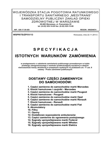 WOJEWÓDZKA STACJA POGOTOWIA RATUNKOWEGO I TRANSPORTU SANITARNEGO „MEDITRANS“ SAMODZIELNY PUBLICZNY ZAKŁAD OPIEKI ZDROWOTNEJ W WARSZAWIE 00-685 Warszawa, ul. Poznańska 22 tel: (0-22) 525-14-05 fax: (0-22) 525-13-80 NIP: 526-17-36-429 WSPRiTS/ZP/51/13 REGON: 000294674 Warszawa, dnia 22.11.2013 r. SPECYFIKACJA ISTOTNYCH WARUNKÓW ZAMÓWIENIA w postępowaniu o udzielenie zamówienia publicznego prowadzonym w trybie przetargu nieograniczonego o wartości przekraczającej wyraŜoną w złotych równowartość kwoty określonej w przepisach wydanych na podstawie art. 11 ust. 8 ustawy - Prawo zamówień publicznych: DOSTAWY CZĘŚCI ZAMIENNYCH DO SAMOCHODÓW: 1. Części zamienne do samochodów marki Mercedes 2. Klocki hamulcowe i czujniki - Mercedes 3. Części zamienne do samochodów marki Peugeot 4. Klocki hamulcowe - Peugeot 5. Części zamienne do samochodów marki Opel 6. Części zamienne do samochodów marki Renault 7. Klocki hamulcowe - Renault 8. Części zamienne do samochodów marki Fiat 9. Akumulatory 10. Filtry 11. Opony 12. Dodatkowe wyposaŜenie ambulansów 13. Części zamienne do ogrzewania postojowego 14. Sygnały uprzywilejowane marki Federal 15. Sygnały uprzywilejowane marki Whelen 16. Sygnały uprzywilejowane marki Elektra WOJEWÓDZKA STACJA POGOTOWIA RATUNKOWEGO I TRANSPORTU SANITARNEGO „MEDITRANS” 00-685 Warszawa, ul. Poznańska 22 tel: (0-22) 525-14-05 fax: (0-22) 525-13-80 Rozdział I INFORMACJE OGÓLNE I. INFORMACJA O ZAMAWIAJĄCYM Zamawiającym jest Wojewódzka Stacja Pogotowia Ratunkowego i Transportu Sanitarnego „MEDITRANS” Samodzielny Publiczny Zakład Opieki Zdrowotnej, z siedzibą w Warszawie ul. Poznańska 22, 00-685 Warszawa. Tel: / 0-22/ 525-14-05 Fax: / 0-22/ 525-13-80 www.meditrans.waw.pl II. TRYB UDZIELENIA ZAMÓWIENIA I WARTOŚĆ ZAMÓWIENIA Niniejsze postępowanie o udzielenie zamówienia publicznego - dalej zwane „Postępowaniem” prowadzone jest w trybie przetargu nieograniczonego o wartości przekraczającej wyraŜoną w złotych równowartość kwoty określonej w przepisach wydanych na podstawie art. 11 ust. 8 ustawy z dnia 29 stycznia 2004 r. – Prawo zamówień publicznych (Dz. U. z 2010 r. Nr 113, poz. 759 z późn. zm.) – zwanej dalej „ustawą Pzp”. Postępowanie, którego dotyczy niniejszy dokument oznaczone jest znakiem: WSPRiTS/ZP/51/13. Wykonawcy zobowiązani są do powoływania się na wyŜej podane oznaczenie we wszelkich kontaktach z Zamawiającym. Niniejsza Specyfikacja istotnych warunków zamówienia dalej będzie zwana „SIWZ”. III. OFERTY CZĘŚCIOWE, WARIANTOWE, RÓWNOWAśNE, UZUPEŁNIAJĄCE 1. KaŜdy wykonawca ma prawo złoŜyć tylko jedną ofertę. 2. Zamawiający dopuszcza moŜliwość składania ofert częściowych. Wykonawca moŜe złoŜyć ofertę zarówno na pojedyncze zadanie, jak i na kilka zadań lub na całość przedmiotu zamówienia. 3. Zamawiający nie dopuszcza moŜliwości składania ofert wariantowych w rozumieniu art.2 pkt 7 ustawy Pzp. 4. Zamawiający nie przewiduje zamówień uzupełniających lub zawarcia umowy ramowej. 5. Zamawiający nie wymaga wniesienia zabezpieczenia naleŜytego wykonania umowy. 6. Zamawiający nie przewiduje zwrotu kosztów udziału w postępowaniu. IV. FORMA PRZEKAZYWANIA POSTĘPOWANIU INFORMACJI, OŚWIADCZEŃ I DOKUMENTÓW W 1. Zamawiający prowadzi Postępowanie w języku polskim. 2. Oświadczenia, wnioski, zawiadomienia oraz informacje Zamawiający i wykonawcy przekazują pisemnie lub faksem z zastrzeŜeniem pkt. 3. 3. Forma pisemna pod rygorem niewaŜności zastrzeŜona jest dla złoŜenia oferty wraz z załącznikami, w tym oświadczeń i dokumentów potwierdzających spełnianie warunków udziału w postępowaniu oraz oświadczeń i dokumentów potwierdzających spełnianie przez oferowany przedmiot zamówienia wymagań określonych przez Zamawiającego, a takŜe zmiany lub wycofania oferty. 4. Wykonawca potwierdza niezwłocznie fakt otrzymania faksem oświadczenia, wniosku, zawiadomienia lub informacji poprzez podpisanie pierwszej strony dokumentu i jej odesłanie na faks Zamawiającego. 5. W przypadku, gdy Wykonawca nie prześle potwierdzenia otrzymania ww. dokumentu, pismo pozostanie w aktach Postępowania z mocą doręczenia. 6. Wykonawca moŜe zwrócić się do Zamawiającego o wyjaśnienie treści SIWZ. Zamawiający odpowie niezwłocznie, nie później niŜ na 6 dni przed upływem terminu składania ofert, pod warunkiem, Ŝe wniosek o wyjaśnienie treści SIWZ wpłynie do Zamawiającego nie później niŜ do końca dnia, w którym upływa połowa wyznaczonego terminu składania ofert. Wnioski, które wpłyną po wyŜej określonym terminie Zamawiający moŜe pozostawić bez rozpoznania. 7. Zamawiający nie przewiduje zwołania zebrania wykonawców w celu wyjaśnienia wątpliwości dotyczących treści SIWZ. WOJEWÓDZKA STACJA POGOTOWIA RATUNKOWEGO I TRANSPORTU SANITARNEGO „MEDITRANS” 00-685 Warszawa, ul. Poznańska 22 tel: (0-22) 525-14-05 fax: (0-22) 525-13-80 8. W uzasadnionych przypadkach Zamawiający moŜe przed upływem terminu składania ofert zmienić treść niniejszej SIWZ. W przypadku gdy w wyniku zmiany treści SIWZ niezbędny będzie dodatkowy czas na wprowadzenie zmian w ofertach, Zamawiający przedłuŜy termin składania ofert. V. OSOBY UPRAWNIONE DO KONTAKTÓW Z WYKONAWCAMI Osobą uprawnioną do kontaktu z Wykonawcami jest: imię i nazwisko: Agnieszka Sztorc Godziny pracy Działu Zamówień Publicznych: 8.00 – 15.00 tel.: 0 22 52 – 51 – 293 fax: 0 22 52 – 51 – 279 e-mail: [email protected] Zamawiający udziela odpowiedzi elektroniczną bądź listownie. wyłącznie na pytania przesłane faxem, pocztą VI. PODWYKONAWCY Zamawiający nie dopuszcza powierzenia wykonania zamówienia podwykonawcom. Rozdział II OPIS PRZEDMIOTU ZAMÓWIENIA I TERMIN WYKONANIA I. PRZEDMIOT ZAMÓWIENIA Przedmiotem zamówienia są dostawy części zamiennych do samochodów, szczegółowo opisanych w opisie przedmiotu zamówienia zawartym w załąc