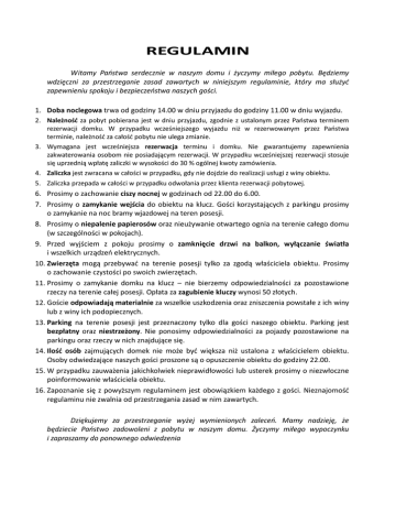 REGULAMIN Witamy Państwa serdecznie w naszym domu i życzymy miłego pobytu. Będziemy wdzięczni za przestrzeganie zasad zawartych w niniejszym regulaminie, który ma służyć zapewnieniu spokoju i bezpieczeństwa naszych gości. 1. Doba noclegowa trwa od godziny 14.00 w dniu przyjazdu do godziny 11.00 w dniu wyjazdu. 2. Należność za pobyt pobierana jest w dniu przyjazdu, zgodnie z ustalonym przez Państwa terminem rezerwacji domku. W przypadku wcześniejszego wyjazdu niż w rezerwowanym przez Państwa terminie, należność za całość pobytu nie ulega zmianie. 3. Wymagana jest wcześniejsza rezerwacja terminu i domku. Nie gwarantujemy zapewnienia zakwaterowania osobom nie posiadającym rezerwacji. W przypadku wcześniejszej rezerwacji stosuje się uprzednią wpłatę zaliczki w wysokości do 30 % ogólnej kwoty zamówienia. 4. Zaliczka jest zwracana w całości w przypadku, gdy nie dojdzie do realizacji usługi z winy obiektu. 5. Zaliczka przepada w całości w przypadku odwołania przez klienta rezerwacji pobytowej. 6. Prosimy o zachowanie ciszy nocnej w godzinach od 22.00 do 6.00. 7. Prosimy o zamykanie wejścia do obiektu na klucz. Gości korzystających z parkingu prosimy o zamykanie na noc bramy wjazdowej na teren posesji. 8. Prosimy o niepalenie papierosów oraz nieużywanie otwartego ognia na terenie całego domu (w szczególności w pokojach). 9. Przed wyjściem z pokoju prosimy o zamknięcie drzwi na balkon, wyłączanie światła i wszelkich urządzeń elektrycznych. 10. Zwierzęta mogą przebywać na terenie posesji tylko za zgodą właściciela obiektu. Prosimy o zachowanie czystości po swoich zwierzętach. 11. Prosimy o zamykanie domku na klucz – nie bierzemy odpowiedzialności za pozostawione rzeczy na terenie całej posesji. Opłata za zagubienie kluczy wynosi 50 złotych. 12. Goście odpowiadają materialnie za wszelkie uszkodzenia oraz zniszczenia powstałe z ich winy lub z winy ich podopiecznych. 13. Parking na terenie posesji jest przeznaczony tylko dla gości naszego obiektu. Parking jest bezpłatny oraz niestrzeżony. Nie ponosimy odpowiedzialności za pojazdy pozostawione na parkingu oraz rzeczy w nich znajdujące się. 14. Ilość osób zajmujących domek nie może być większa niż ustalona z właścicielem obiektu. Osoby odwiedzające naszych gości proszone są o opuszczenie obiektu do godziny 22.00. 15. W przypadku zauważenia jakichkolwiek nieprawidłowości lub usterek prosimy o niezwłoczne poinformowanie właściciela obiektu. 16. Zapoznanie się z powyższym regulaminem jest obowiązkiem każdego z gości. Nieznajomość regulaminu nie zwalnia od przestrzegania zasad w nim zawartych. Dziękujemy za przestrzeganie wyżej wymienionych zaleceń. Mamy nadzieję, że będziecie Państwo zadowoleni z pobytu w naszym domu. Życzymy miłego wypoczynku i zapraszamy do ponownego odwiedzenia