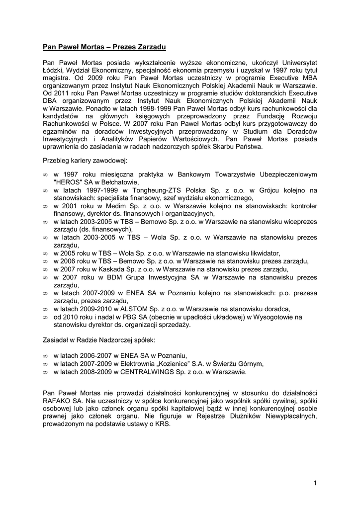 Pan Paweł Mortas – Prezes Zarządu Pan Paweł Mortas posiada wykształcenie wyŜsze ekonomiczne, ukończył Uniwersytet Łódzki, Wydział Ekonomiczny, specjalność ekonomia przemysłu i uzyskał w 1997 roku tytuł magistra. Od 2009 roku Pan Paweł Mortas uczestniczy w programie Executive MBA organizowanym przez Instytut Nauk Ekonomicznych Polskiej Akademii Nauk w Warszawie. Od 2011 roku Pan Paweł Mortas uczestniczy w programie studiów doktoranckich Executive DBA organizowanym przez Instytut Nauk Ekonomicznych Polskiej Akademii Nauk w Warszawie. Ponadto w latach 1998-1999 Pan Paweł Mortas odbył kurs rachunkowości dla kandydatów na głównych księgowych przeprowadzony przez Fundację Rozwoju Rachunkowości w Polsce. W 2007 roku Pan Paweł Mortas odbył kurs przygotowawczy do egzaminów na doradców inwestycyjnych przeprowadzony w Studium dla Doradców Inwestycyjnych i Analityków Papierów Wartościowych. Pan Paweł Mortas posiada uprawnienia do zasiadania w radach nadzorczych spółek Skarbu Państwa. Przebieg kariery zawodowej: • • • • • • • • • • • • w 1997 roku miesięczna praktyka w Bankowym Towarzystwie Ubezpieczeniowym "HEROS" SA w Bełchatowie, w latach 1997-1999 w Tongheung-ZTS Polska Sp. z o.o. w Grójcu kolejno na stanowiskach: specjalista finansowy, szef wydziału ekonomicznego, w 2001 roku w Medim Sp. z o.o. w Warszawie kolejno na stanowiskach: kontroler finansowy, dyrektor ds. finansowych i organizacyjnych, w latach 2003-2005 w TBS – Bemowo Sp. z o.o. w Warszawie na stanowisku wiceprezes zarządu (ds. finansowych), w latach 2003-2005 w TBS – Wola Sp. z o.o. w Warszawie na stanowisku prezes zarządu, w 2005 roku w TBS – Wola Sp. z o.o. w Warszawie na stanowisku likwidator, w 2006 roku w TBS – Bemowo Sp. z o.o. w Warszawie na stanowisku prezes zarządu, w 2007 roku w Kaskada Sp. z o.o. w Warszawie na stanowisku prezes zarządu, w 2007 roku w BDM Grupa Inwestycyjna SA w Warszawie na stanowisku prezes zarządu, w latach 2007-2009 w ENEA SA w Poznaniu kolejno na stanowiskach: p.o. prezesa zarządu, prezes zarządu, w latach 2009-2010 w ALSTOM Sp. z o.o. w Warszawie na stanowisku doradca, od 2010 roku i nadal w PBG SA (obecnie w upadłości układowej) w Wysogotowie na stanowisku dyrektor ds. organizacji sprzedaŜy. Zasiadał w Radzie Nadzorczej spółek: • • • w latach 2006-2007 w ENEA SA w Poznaniu, w latach 2007-2009 w Elektrownia „Kozienice” S.A. w ŚwierŜu Górnym, w latach 2008-2009 w CENTRALWINGS Sp. z o.o. w Warszawie. Pan Paweł Mortas nie prowadzi działalności konkurencyjnej w stosunku do działalności RAFAKO SA. Nie uczestniczy w spółce konkurencyjnej jako wspólnik spółki cywilnej, spółki osobowej lub jako członek organu spółki kapitałowej bądź w innej konkurencyjnej osobie prawnej jako członek organu. Nie figuruje w Rejestrze DłuŜników Niewypłacalnych, prowadzonym na podstawie ustawy o KRS. 1