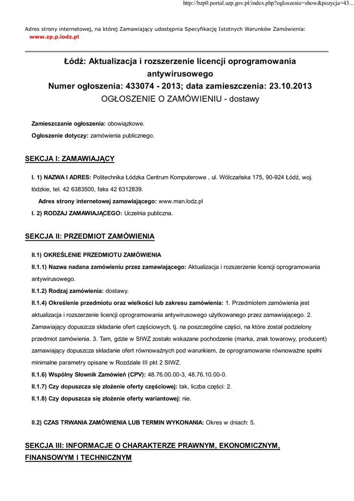 http://bzp0.portal.uzp.gov.pl/index.php?ogloszenie=show&pozycja=43... Adres strony internetowej, na której Zamawiający udostępnia Specyfikację Istotnych Warunków Zamówienia: www.zp.p.lodz.pl Łódź: Aktualizacja i rozszerzenie licencji oprogramowania antywirusowego Numer ogłoszenia: 433074 - 2013; data zamieszczenia: 23.10.2013 OGŁOSZENIE O ZAMÓWIENIU - dostawy Zamieszczanie ogłoszenia: obowiązkowe. Ogłoszenie dotyczy: zamówienia publicznego. SEKCJA I: ZAMAWIAJĄCY I. 1) NAZWA I ADRES: Politechnika Łódzka Centrum Komputerowe , ul. Wólczańska 175, 90-924 Łódź, woj. łódzkie, tel. 42 6383500, faks 42 6312839. Adres strony internetowej zamawiającego: www.man.lodz.pl I. 2) RODZAJ ZAMAWIAJĄCEGO: Uczelnia publiczna. SEKCJA II: PRZEDMIOT ZAMÓWIENIA II.1) OKREŚLENIE PRZEDMIOTU ZAMÓWIENIA II.1.1) Nazwa nadana zamówieniu przez zamawiającego: Aktualizacja i rozszerzenie licencji oprogramowania antywirusowego. II.1.2) Rodzaj zamówienia: dostawy. II.1.4) Określenie przedmiotu oraz wielkości lub zakresu zamówienia: 1. Przedmiotem zamówienia jest aktualizacja i rozszerzenie licencji oprogramowania antywirusowego użytkowanego przez zamawiającego. 2. Zamawiający dopuszcza składanie ofert częściowych, tj. na poszczególne części, na które został podzielony przedmiot zamówienia. 3. Tam, gdzie w SIWZ zostało wskazane pochodzenie (marka, znak towarowy, producent) zamawiający dopuszcza składanie ofert równoważnych pod warunkiem, że oprogramowanie równoważne spełni minimalne parametry opisane w Rozdziale III pkt 2 SIWZ. II.1.6) Wspólny Słownik Zamówień (CPV): 48.76.00.00-3, 48.76.10.00-0. II.1.7) Czy dopuszcza się złożenie oferty częściowej: tak, liczba części: 2. II.1.8) Czy dopuszcza się złożenie oferty wariantowej: nie. II.2) CZAS TRWANIA ZAMÓWIENIA LUB TERMIN WYKONANIA: Okres w dniach: 5. SEKCJA III: INFORMACJE O CHARAKTERZE PRAWNYM, EKONOMICZNYM, FINANSOWYM I TECHNICZNYM http://bzp0.portal.uzp.gov.pl/index.php?ogloszenie=show&pozycja=43... III.1) WADIUM Informacja na temat wadium: Zamawiający nie żąda wniesienia wadium III.2) ZALICZKI III.3) WARUNKI UDZIAŁU W POSTĘPOWANIU ORAZ OPIS SPOSOBU DOKONYWANIA OCENY SPEŁNIANIA TYCH WARUNKÓW III. 3.1) Uprawnienia do wykonywania określonej działalności lub czynności, jeżeli przepisy prawa nakładają obowiązek ich posiadania Opis sposobu dokonywania oceny spełniania tego warunku Działalność prowadzona na potrzeby wykonania przedmiotu zamówienia nie wymaga posiadania specjalnych uprawnień. Zamawiający nie wprowadza szczegółowych wymagań w tym zakresie. Ocena spełnienia warunku nastąpi zgodnie z zasadą spełnia/nie spełnia, na podstawie złożonego przez Wykonawcę wraz z ofertą oświadczenia o spełnieniu warunków udziału w postępowaniu. III.3.2) Wiedza i doświadczenie Opis sposobu dokonywania oceny spełniania tego warunku Zamawiający nie wprowadza szczegółowych wymagań w tym zakresie. Ocena spełnienia warunku nastąpi zgodnie z zasadą spełnia/nie spełnia, na podstawie złożonego przez Wykonawcę wraz z ofertą oświadczenia o spełnieniu warunków udziału w postępowaniu. III.3.3) Potencjał techniczny Opis sposobu dokonywania oceny spełniania tego warunku Zamawiający nie wprowadza szczegółowych wymagań w tym zakresie. Ocena spełnienia warunku nastąpi zgodnie z zasadą spełnia/nie spełnia, na podstawie złożonego przez Wykonawcę wraz z ofertą oświadczenia o spełnieniu warunków udziału w postępowaniu. III.3.4) Osoby zdolne do wykonania zamówienia Opis sposobu dokonywania oceny spełniania tego warunku Zamawiający nie wprowadza szczegółowych wymagań w tym zakresie. Ocena spełnienia warunku nastąpi zgodnie z zasadą spełnia/nie spełnia, na podstawie złożonego przez Wykonawcę wraz z ofertą oświadczenia o spełnieniu warunków udziału w postępowaniu. III.3.5) Sytuacja ekonomiczna i finansowa Opis sposobu dokonywania oceny spełniania tego warunku Zamawiający nie wprowadza szczegółowych wymagań w tym zakresie. Ocena spełnienia warunku nastąpi zgodnie z zasadą spełnia/nie spełnia, na podstawie złożonego przez Wykonawcę wraz z ofertą oświadczenia o spełnieniu warunków udziału w postępowaniu. III.4) INFORMACJA O OŚWIADCZENIACH LUB DOKUMENTACH, JAKIE MAJĄ DOSTARCZYĆ WYKONAWCY W CELU POTWIERDZENIA SPEŁNIANIA WARUNKÓW UDZIAŁU W POSTĘPOWANIU ORAZ NIEPODLEGANIA WYKLUCZENIU NA PODSTAWIE ART. 24 UST. 1 USTAWY III.4.1) W zakresie wykazania spełniania przez wykonawcę warunków, o których mowa w art. 22 ust. 1 ustawy, oprócz oświadczenia o spełnianiu warunków udziału w postępowaniu należy przedłożyć: III.4.2) W zakresie potwierdzenia niepodlegania wykluczeniu na podstawie art. 24 ust. 1 ustawy, należy http://bzp0.portal.uzp.gov.pl/index.php?ogloszenie=show&pozycja=43... przedłożyć: oświadczenie o braku podstaw do wykluczenia; aktualny odpis z właściwego rejestru lub z centralnej ewidencji i informacji o działalności gospodarczej, jeżeli odrębne przepisy wymagają wpisu do rejestru lub ewidencji, w celu wykazania braku podstaw do wykluczenia w oparciu o art. 24 ust. 1 pkt 2 ustawy, wystawiony nie wcześniej niż 6 miesięcy przed upływem terminu składania wniosków o dopuszczenie do udziału w postępowaniu o udzielenie zamówienia albo składania ofert; III.4.3) Dokumenty podmiotów zagranicznych Jeżeli wykonawca ma siedzibę lub miejsce zamieszkania poza terytorium Rzeczypospolitej Polskiej, przedkłada: III.4.3.1) dokument wystawiony w kraju, w którym ma siedzibę lub miejsce zamieszkania potwierdzający, że: nie otwarto jego likwidacji ani nie ogłoszono upadłości - wystawiony nie wcześniej niż 6 miesięcy przed upływem terminu składania wniosków o dopuszczenie do udziału w postępowaniu o udzielenie zamówienia albo składania ofert; III.4.4) Dokumenty dotyczące przynależności do tej samej grupy kapitałowej lista podmiotów należących do tej samej grupy kapitałowej w roz
