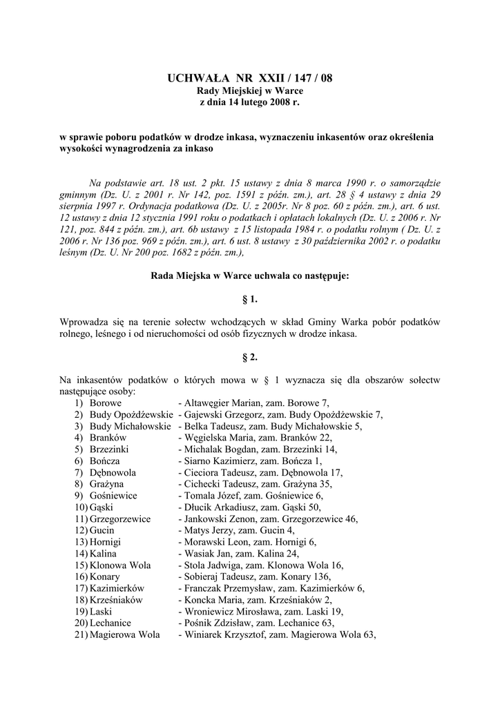 UCHWAŁA NR XXII / 147 / 08 Rady Miejskiej w Warce z dnia 14 lutego 2008 r. w sprawie poboru podatków w drodze inkasa, wyznaczeniu inkasentów oraz określenia wysokości wynagrodzenia za inkaso Na podstawie art. 18 ust. 2 pkt. 15 ustawy z dnia 8 marca 1990 r. o samorządzie gminnym (Dz. U. z 2001 r. Nr 142, poz. 1591 z późn. zm.), art. 28 § 4 ustawy z dnia 29 sierpnia 1997 r. Ordynacja podatkowa (Dz. U. z 2005r. Nr 8 poz. 60 z późn. zm.), art. 6 ust. 12 ustawy z dnia 12 stycznia 1991 roku o podatkach i opłatach lokalnych (Dz. U. z 2006 r. Nr 121, poz. 844 z późn. zm.), art. 6b ustawy z 15 listopada 1984 r. o podatku rolnym ( Dz. U. z 2006 r. Nr 136 poz. 969 z późn. zm.), art. 6 ust. 8 ustawy z 30 października 2002 r. o podatku leśnym (Dz. U. Nr 200 poz. 1682 z późn. zm.), Rada Miejska w Warce uchwala co następuje: § 1. Wprowadza się na terenie sołectw wchodzących w skład Gminy Warka pobór podatków rolnego, leśnego i od nieruchomości od osób fizycznych w drodze inkasa. § 2. Na inkasentów podatków o których mowa w § 1 wyznacza się dla obszarów sołectw następujące osoby: 1) Borowe - Altawęgier Marian, zam. Borowe 7, 2) Budy OpoŜdźewskie - Gajewski Grzegorz, zam. Budy OpoŜdŜewskie 7, 3) Budy Michałowskie - Belka Tadeusz, zam. Budy Michałowskie 5, 4) Branków - Węgielska Maria, zam. Branków 22, 5) Brzezinki - Michalak Bogdan, zam. Brzezinki 14, 6) Bończa - Siarno Kazimierz, zam. Bończa 1, 7) Dębnowola - Cieciora Tadeusz, zam. Dębnowola 17, 8) GraŜyna - Cichecki Tadeusz, zam. GraŜyna 35, 9) Gośniewice - Tomala Józef, zam. Gośniewice 6, 10) Gąski - Dłucik Arkadiusz, zam. Gąski 50, 11) Grzegorzewice - Jankowski Zenon, zam. Grzegorzewice 46, 12) Gucin - Matys Jerzy, zam. Gucin 4, 13) Hornigi - Morawski Leon, zam. Hornigi 6, 14) Kalina - Wasiak Jan, zam. Kalina 24, 15) Klonowa Wola - Stola Jadwiga, zam. Klonowa Wola 16, 16) Konary - Sobieraj Tadeusz, zam. Konary 136, 17) Kazimierków - Franczak Przemysław, zam. Kazimierków 6, 18) Krześniaków - Koncka Maria, zam. Krześniaków 2, 19) Laski - Wroniewicz Mirosława, zam. Laski 19, 20) Lechanice - Pośnik Zdzisław, zam. Lechanice 63, 21) Magierowa Wola - Winiarek Krzysztof, zam. Magierowa Wola 63, 22) Murowanka 23) Michalczew 24) Michałów Parcela 25) Michałów Górny 26) Michałów Dolny 27) Niwy Ostrołęckie 28) Nowa Wieś 29) Nowe Biskupice 30) Ostrówek 31) OpoŜdŜew 32) Ostrołęka 33) Pilica 34) Podgórzyce 35) Przylot 36) Prusy 37) Piaseczno 38) Palczew Parcela 39) Palczew 40) Stara Warka 41) Stare Biskupice 42) Wichradz 43) Winiary 44) Wola Palczewska 45) Wrociszew 46) ZastruŜe - Jagiełło Wiesława, zam. Murowanka 31, - Fudecki Kazimierz, zam. Michalczew 17, - Siadkowski Janusz, zam. Michałów Parcela 14, - Baczyńska Jolanta, zam. Michałów Górny 16, - Kamiński Marian, zam. Michałów Dolny 6, - Wargocki Andrzej, zam. Niwy Ostrołęckie 4, - Dywan Tadeusz, zam. Nowa Wieś 1, - Szczepaniak Jerzy, zam. Nowe Biskupice 9, - Młynarczyk Zbigniew, zam. Ostrówek 12, - Kiwak Dariusz, zam. OpoŜdŜew 10, - Anyszkiewicz Stanisław, zam. Ostrołęka 23, - Kociszewski Marek, zam. Pilica 50A, - Szlązak Jacek, zam. Podgórzyce 34, - Mroziak Krzysztof, zam. Przylot 49, - Gwardys Andrzej, zam. Prusy 21, - JeŜewski Józef, zam. Piaseczno 13, - Drózd Sławomir, zam. Palczew Parcela 48, - Pacholczak Marian, zam. Palczew 50, - Przybylski Ryszard, zam. Stara Warka 30, - Sulik Zbigniew, zam. Stare Biskupice 43, - Dobosz Robert, zam. Wichradz 23, - Janusik Jerzy, zam. ul. Turystyczna 59, Warka, - Piekarniak Sławomir, zam. Wola Palczewska 4, - Ścisłowski Piotr, zam. Wrociszew 30, - Bernacki Jerzy, zam. ZastruŜe 39. § 3. 1. Pobór podatku w drodze inkasa nie wyklucza uiszczania naleŜności przez podatników bezpośrednio w kasie lub na właściwy rachunek bankowy Urzędu Miejskiego w Warce. 2. Wpłaty dokonane przez podatnika bezpośrednio w kasie Urzędu Miejskiego w Warce są wolne od obciąŜeń. § 4. 1. Inkasenci pobierają naleŜności z tytułu podatków wymierzanych przez Gminę Warka od dnia poboru druków kwitariuszy z Urzędu Miejskiego w Warce do dnia terminu płatności podatków włącznie; jeŜeli dzień ten przypada na dzień wolny od pracy – do pierwszego dnia roboczego po tym dniu włącznie. 2. Inkasenci maja obowiązek wydania pokwitowania kaŜdej wpłacającej osobie. § 5. 1. Inkasenci dokonują wpłaty zebranych podatków na rachunek budŜetu gminy w kolejnym dniu roboczym po dniu, o którym mowa w § 4 ust. 1. 2. Inkasenci rozliczają się z pobranych podatków w ciągu 5 dni roboczych po dniu, o którym mowa w § 4 ust. 1. § 6. 1. Inkasenci otrzymują wynagrodzenie prowizyjne za inkaso. 2. Ustala się prowizję za inkaso podatków w wysokości iloczynu stawki prowizji i sumy zebranych przez sołtysa, terminowo wpłaconych na rachunek budŜetu Gminy Warka i rozliczonych podatków. 3. Stawki prowizji za inkaso podatków zawarte są w załączniku do niniejszej uchwały. 4. Kwotę wynagrodzenia, o którym mowa w ust. 1 zaokrągla się do pełnych złotych. 5. Urząd Miejski w Warce jest zobowiązany postawić do dyspozycji wynagrodzenie inkasentów w ciągu 30 dni od rozliczenia, o którym mowa w § 5 ust. 2. 6. Wypłata wynagrodzenia za inkaso dokonywana jest w kasie Urzędu Miejskiego w Warce lub na rachunek bankowy wskazany przez inkasenta w ciągu 14 dni od terminu, o którym mowa w ust. 5. 7. Wynagrodzenie dla inkasentów, którzy nie odebrali prowizji w terminie określonym w ust. 6, Urząd Miejski w Warce przesyła przekazem pocztowym po potrąceniu opłaty za przesyłkę. 8. Na pisemny wniosek inkasenta prowizja moŜe być wypłacana w ratach. § 7. Środki finansowe na wynagrodzenie za inkaso ustala się corocznie w budŜecie Gminy Warka. § 8. Traci moc Uchwała Nr XXXVII/145/97 Rady Miejskiej w Warce z dnia 8 maja 1997 roku w sprawie inkasa łącznego zobowiązania pienięŜnego oraz podatków i opłat lokalnych. § 9. Wykonanie uchwały powierza si