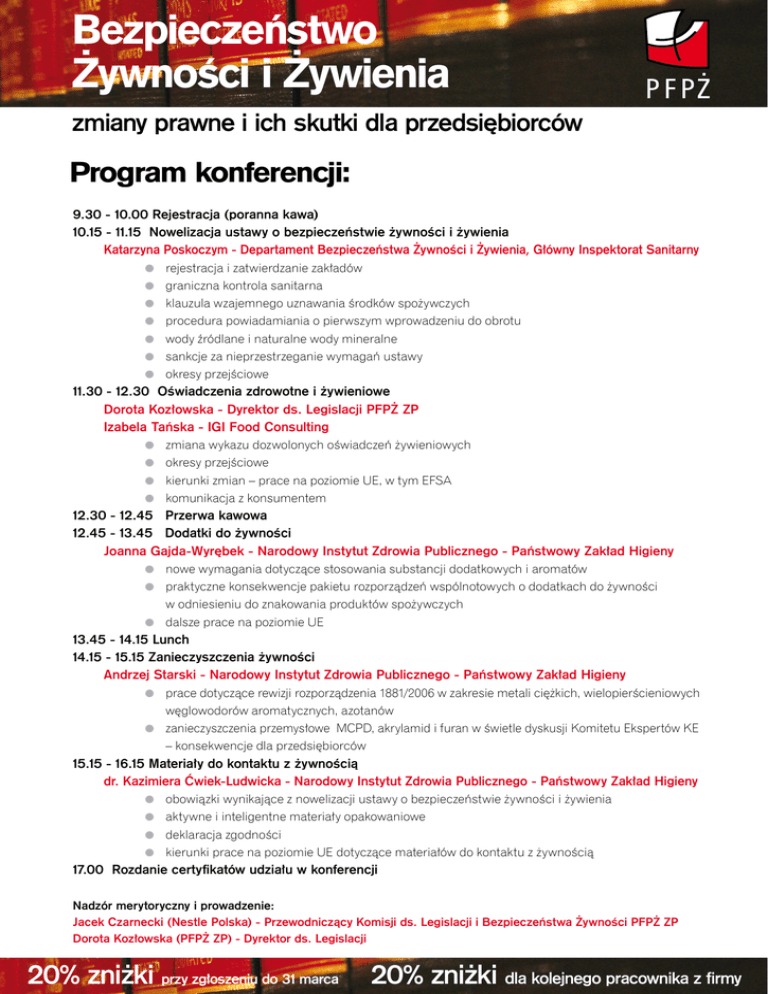 Bezpieczeństwo Żywności i Żywienia zmiany prawne i ich skutki dla przedsiębiorców Program konferencji: 9.30 - 10.00 Rejestracja (poranna kawa) 10.15 - 11.15 Nowelizacja ustawy o bezpieczeństwie żywności i żywienia Katarzyna Poskoczym - Departament Bezpieczeństwa Żywności i Żywienia, Główny Inspektorat Sanitarny l rejestracja i zatwierdzanie zakładów l graniczna kontrola sanitarna l klauzula wzajemnego uznawania środków spożywczych l procedura powiadamiania o pierwszym wprowadzeniu do obrotu l wody źródlane i naturalne wody mineralne l sankcje za nieprzestrzeganie wymagań ustawy l okresy przejściowe 11.30 - 12.30 Oświadczenia zdrowotne i żywieniowe Dorota Kozłowska - Dyrektor ds. Legislacji PFPŻ ZP Izabela Tańska - IGI Food Consulting l zmiana wykazu dozwolonych oświadczeń żywieniowych l okresy przejściowe l kierunki zmian – prace na poziomie UE, w tym EFSA l komunikacja z konsumentem 12.30 - 12.45 Przerwa kawowa 12.45 - 13.45 Dodatki do żywności Joanna Gajda-Wyrębek - Narodowy Instytut Zdrowia Publicznego - Państwowy Zakład Higieny l nowe wymagania dotyczące stosowania substancji dodatkowych i aromatów l praktyczne konsekwencje pakietu rozporządzeń wspólnotowych o dodatkach do żywności w odniesieniu do znakowania produktów spożywczych l dalsze prace na poziomie UE 13.45 - 14.15 Lunch 14.15 - 15.15 Zanieczyszczenia żywności Andrzej Starski - Narodowy Instytut Zdrowia Publicznego - Państwowy Zakład Higieny l prace dotyczące rewizji rozporządzenia 1881/2006 w zakresie metali ciężkich, wielopierścieniowych węglowodorów aromatycznych, azotanów l zanieczyszczenia przemysłowe MCPD, akrylamid i furan w świetle dyskusji Komitetu Ekspertów KE – konsekwencje dla przedsiębiorców 15.15 - 16.15 Materiały do kontaktu z żywnością dr. Kazimiera Ćwiek-Ludwicka - Narodowy Instytut Zdrowia Publicznego - Państwowy Zakład Higieny l obowiązki wynikające z nowelizacji ustawy o bezpieczeństwie żywności i żywienia l aktywne i inteligentne materiały opakowaniowe l deklaracja zgodności l kierunki prace na poziomie UE dotyczące materiałów do kontaktu z żywnością 17.00 Rozdanie certyfikatów udziału w konferencji Nadzór merytoryczny i prowadzenie: Jacek Czarnecki (Nestle Polska) - Przewodniczący Komisji ds. Legislacji i Bezpieczeństwa Żywności PFPŻ ZP Dorota Kozłowska (PFPŻ ZP) - Dyrektor ds. Legislacji 20% zniżki przy zgłoszeniu do 31 marca 20% zniżki dla kolejnego pracownika z firmy