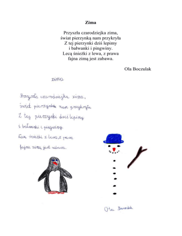 Zima Przyszła czarodziejka zima, świat pierzynką nam przykryła Z tej pierzynki dziś lepimy i bałwanki i pingwiny. Lecą śnieżki z lewa, z prawa fajna zimą jest zabawa. Ola Boczulak Zima – Czarodziejka Zima to czarodziejka Potrafi zmienić wodę w lód i w śnieg. Dzieci uwielbiają zimę, ponieważ lepią bałwana, jeżdżą na sankach i rzucają się kulkami śniegu. Roksana Gago Zima Czarodziejka Nasza zima czarodziejka białą ma sukienkę, szczypie w uszy mrozi nosy, bawi z nami się od rana. Lubi łyżwy, narty, sanki zjeżdża z górki na pazurki. Rzuca z nami się śnieżkami i my wszyscy ją kochamy. Weronika Kulesza Przyszła zima śnieżnobiała Przez dzieci jest lubiana Zimą można zjeżdżać z górki i nawzajem rzucać kulki My się zimy nie boimy z niej drwiny nie robimy Ubieramy szalik, czapkę, rękawiczki w paski, w kratkę. Zima mroźna, zima zła. Gdy zmarźniemy, nas do domu gna. Eryk Rykała Zima – czarodziejka Zima jest wspaniała i bardzo kochana Na szybach maluje piękne obrazy A drzewa wyglądają jak śnieżne bałwany Nikola Serafin Pani Zima Gdy nadchodzi sroga zima, ciepła w nas nie ma. Zima czarodziejka co wokół nas zerka. Czarodziejską różdżkę ma, więc zasypie nas raz dwa Śniegiem sypie tu i tam przekonałem się już sam Kacper Szczerba Zima Czarodziejka zima zaczaruje świat. Każdy na to czekał, już od wielu lat. Zima jest wesoła pora szybko wstać, bo za oknem pełno śniegu i na sanki można gnać. Remek Wilemski