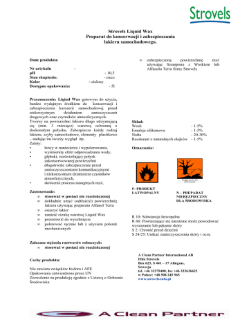 Strovels Liquid Wax Preparat do konserwacji i zabezpieczania lakieru samochodowego. • Dane produktu: Nr artykułu pH Stan skupienia: Kolor Dostępne opakowania: zabezpieczoną powierzchnię myć używając Szamponu z Woskiem lub Alfanolu Terra firmy Strovels - 10,5 - ciecz - zielony - 5l Przeznaczenie: Liqiud Wax gotowym do użycia, bardzo wydajnym środkiem do konserwacji i zabezpieczenia karoserii samochodowej przed niekorzystnym działaniem zanieczyszczeń drogowych oraz czynników atmosferycznych. Tworzy na powierzchni lakieru długo utrzymującą się (min. 3 miesiące) warstwę ochronną o doskonałym połysku. Zabezpiecza każdy rodzaj lakieru, szyby samochodowe, elementy plastikowe – nadając im świeży wygląd itp. Zalety: • łatwy w naniesienia i wypolerowania, • wyśmienity efekt odprowadzania wody, • głęboki, rozświetlający połysk zakonserwowanej powierzchni • długotrwałe zabezpieczenie przed zanieczyszczeniami komunikacyjnymi i niekorzystnym działaniem czynników atmosferycznych, • skrócenie procesu następnych myć, Zastosowanie: • stosować w postaci nie rozcieńczonej • dokładnie umyć (odtłuścić) powierzchnię lakieru używając preparatu Alfanol Terra • osuszyć lakier • nanieść cienką warstwę Liquid Wax • pozostawić do wyschnięcia • polerować ręcznie lub z użyciem polerek mechanicznych Skład: Wosk Emulsja silikonowa Nafta Reodorant z naturalnych olejków - 1-5% - 1-5% - 20-30% - 1-5% Oznaczenie: F- PRODUKT ŁATWOPALNY N – PREPARAT NIEBEZPIECZNY DLA ŚRODOWISKA R 10: Substancja łatwopalna R 66: Powtarzające się narażenie może powodować wysuszanie lub pękanie skóry S 2: Chronić przed dziećmi S 24/25: Unikać zanieczyszczenia skóry i oczu Zalecane stężenia roztworów roboczych: • stosować w postaci nie rozcieńczonej Cechy produktu: Nie zawiera związków fosforu i AFE Opakowania zatwierdzone przez UN Zezwolenie na produkcję zgodnie z Ustawą o Ochronie Środowiska A Clean Partner International AB Filia Strovels Box 623, S 441 – 17 Alingsas, Szwecja tel. +46 32279400, fax +46 322636622 w Polsce: +48 508 245 565 www.strovels.info.pl
