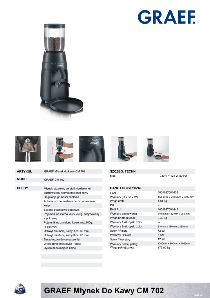 ARTYKUŁ GRAEF Młynek do kawy CM 702 MODEL GRAEF CM 702 SZCZEG. TECHN. Moc CECHY · Młynek stożkowy ze stali nierdzewnej, zachowujący aromat mielonej kawy · Regulacja grubości mielenia · Automatyczne mielenie po przystawieniu kolby · Solidna plastikowa obudowa · Pojemnik na ziarna kawy 250g, zdejmowany z pokrywą · Pojemnik na zmieloną kawę, max100g. z pokrywą · Uchwyt dla małej kolbyØ ca. 60 mm · Uchwyt dla dużej kolbyØ ca. 70 mm · Szczoteczka do czyszczenia · Wyciągana podstawka - tacka · Dysza napełniająca kolbę 230 V ~ 128 W 50 Hz DANE LOGISTYCZNE EAN Wymiary (D x Sz x W) Waga netto PU EAN PU Wymiary opakowania Waga brutto (z opak.) Wymiary 1szt. opak. zbior. Wymiary 2szt. opak. zbior. Sztuk / Paleta Warstwy / Paleta Sztuk / Warstwy Wymiary pełnej palety Waga pełnej palety 4001627001438 154 mm x 260 mm x 375 mm 1,84 kg 2 4001627001445 310 mm x 182 mm x 284 mm 2,30 kg --310mm x 180mm x 290mm 72 szt 6 szt 12 szt 1200mm x 800mm x 1965mm 177,00 kg GRAEF Młynek Do Kawy CM 702 Created at 24/04/2014 Time: 12:47 04/2014