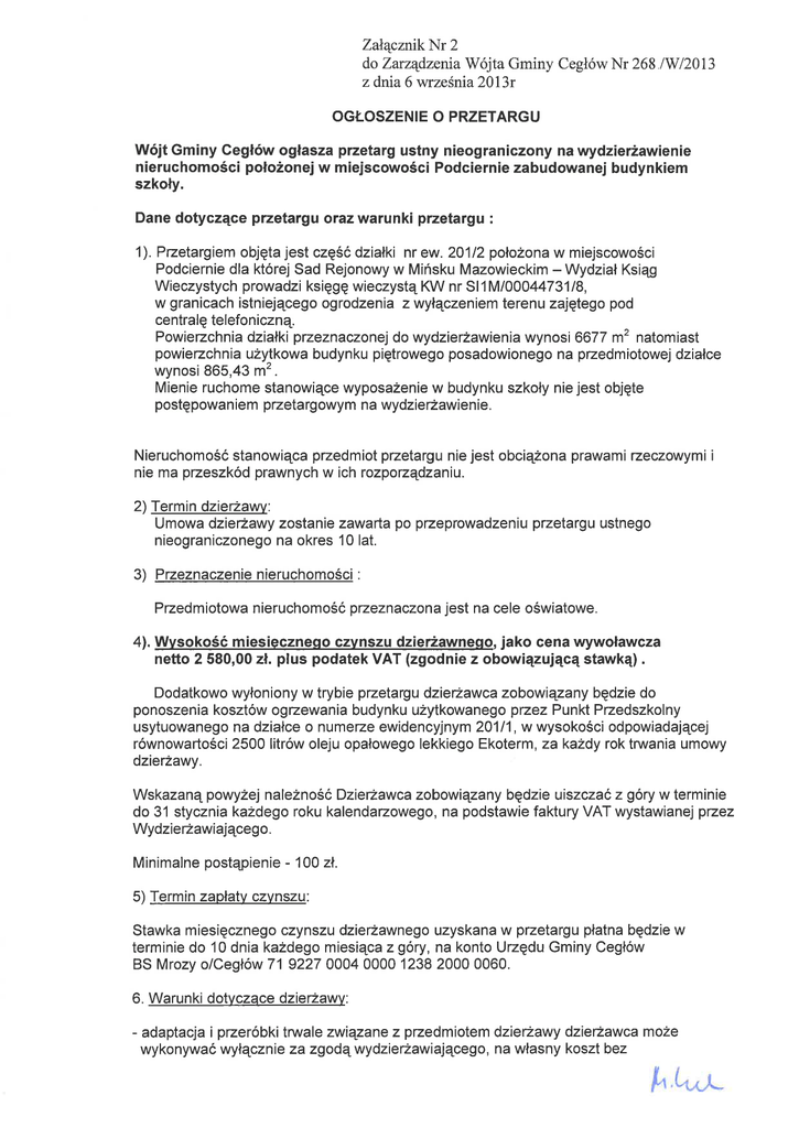 ZałącznikNr 2 đoZarząđzenia Wójta Gminy z dnia 6 v'"rześnia}}l3r CegłówNr 268 lwl20l3 oGŁoszENIE o PRZETARGU Wójt Gminy Gegłów ogłasza przetarg ustny nleograniczony na wydzieľżawienie n ieruchomości położonej w m lejscowoścl Podclern ie zabudowanej budyn kiem szkoły. Dane dotyczące przetargu oraz warunki przetargu : 1). Pzetargiem objęta jest częśó działki nr eW. 20112 położonaw miejscowości Podciernie dla której Sad Rejonowy w Mĺńsku Mazowieckim - Wydział Ksiąg Wieczystych prowadzi księgę wieczystą l(lV nr sl1M/0004473118, w granicach istniejącego ogrodzenia z wyłączeniem terenu zajętego pod centralę telefoniczną. Powierzchnia działki przeznaczonej do wydzierŻawienia wynosi 6677 m2 natomiast powierzchnia użytkowa budynku piętrowego posadowionego na pzedmiotowej działce wynosi 865,43 m2. Mienie ruchome stanowiące wyposażenie w budynku szkoły nie jest objęte postę powa n ie m przeta rg owym na wy dzieżawi en ĺe. Nieruchomośi stanowiąca przedmiot pzetargu nie jest obciążona prawami rzeczowymi nie ma przeszkÓd prawnych w ich rozpoządzaniu' i 2)Termin dzieżavw'' Umowa dzieżawy zostanie zawarta po pzeprowadzeniu przetargu ustnego nieograniczonego na okres 10 lat. 3) Przeznaczenie nieruchomości : Pzedmiotowa nieruchomość przeznaczona jest na cele oświatowe. 4). Wvsokośémiesieczneqo czvnszu dzieżawneqo, jako cena wywoławcza netto 2 580'00 zł. plus podatek VAT (zgodnle z obowlązującą stawką) . Dodatkowo wyłoniony w trybie pzetargu dzieżawcazobowiązany będzie do ponoszenia kosztów ogzewania budynku użytkowanego przez Punkt Pzedszkolny usytuowanego na działce o numerze ewidencyjnym 20111, w wysokości odpowiadającej równowartości 2500 litrów oleju opałowego lekkiego Ekoterm, zakaŻdy rok tnľania umowy dzieżawy' Wskazaną powyżej naleŻnośóDzieżawca zobowiązany będzie uiszczać z góry w terminie do 31 stycznia kazdego roku kalendatzowego, na podstawie faktury VAT wystawianej przez \Nydzieżawĺającego. Minimalne postąpienie - 100 zł. 5) Termin zapłatv czvnszu: Stawka miesięcznego czynszu dzieżawnego uzyskana w przetargu płatna będzie w terminie do 10 dnia każdego miesiącazgóry, na konto Urzędu Gminy Cegłów BS Mrozy o/Cegłów 71 9227 0004 0000 1238 2000 0060. 6. Warunki dotvczace dzieżawv: - adaptacja i przeróbki tnľale związane zpzedmiotem dzieżawy dzieżawca może wykonywać wyłącznie za zgodąwydzierŻawiającego, na własny koszt bez o bowi ązku zwrotu pon ies o nych n a kład ów przez wydz ie żawi aj ące g o, - dzierŻawca jest zobowiązany utrzymai przedmiot dzierŻawy oraz teren pzyległy w należytym porządku i czystości, i - dzierŻawcazobowiązany jest do uiszczenia podatków olaz innych ciężarów związany ch z pos ad a n iem p rzed m iotu dzie żawy, i dzieżawca nie może pzelewai w całościlub części uprawnień wynikających z umowy dzieżawy na rzecz osób tzecich, - bezzgody właściciela, dzieżawca nie może prowadzić działalnościna działce o numerze 2o1l2, która uniemożliwiłaby funkcjonowanie punktu pzedszkolnego, znajdującego się na działce sąsiedniej o numerze 201ĺ1, - - dzieżawca uprawniony będzie do bezpłatnego korzystania przez okres 2latze Ąazdu zlokalizowanego na działce nr eW. 2o1l1 z zastrzeŻenĺem, że w terminie 2latzobowiązany będzie do wybudowania na własny kosztĄazdu z dzieżawionej działki nr eW' 20112, - dzieżawca będzie miał możliwośćkorzystaniaze zbiornika na nieczystości ciekłe znajdującego się na działce nr ew. 20111 przez okres 2 lat w trakcie których będzie zobowiązany do wybudowania własnego zbiornika na nieczystoŚci cĺekłe' Dzieżawcazobowiązany będzie do regulowania należnościz tytułu odbioru nĺeczystości ciekłych, na podstawie refaktur otrzymanych od Wydzieżawiającego' Przetarg odbędzie się w dniu í 1 października 20í3 r. o godzlnie 1í00 w siedzibie Urzędu Gminy Cegłów ul. Kościuszki 4,05-3ĺ9 Gegłów (sa!a konferencyjna). Warunkiem przystąpienia do pzetargu jest wnieslone wadium w wysokości 2580,00 zł., na konto Uzędu Gminy Gegłów BS Mrozy o/Gegłów 71 9227 0004 0000 1238 2000 0060, w terminle do dnia 7 października 20í3 r. Wadium wpłacone przez uczestnika, który pzetarg Wygra zaliczone zostanie na poczet czynszu dzieżawnego, a W przypadku uchylenia się pzez te osobę od zawarcia umowy dzieżawy, wad u m p rze pad a na rzecz Wydzie zaw aj ąceg o. i i Pozostałym uczestnikom wadium zwraca się w ciągu 3 dni po zamknięciu pzetargu lub jego odwołaniu. Jeżeli osoba ustalona jako dzierŻawca nĺeruchomościnie stawi się bez usprawiedliwienia w miejscu i terminie podanym w zawiadomieniu, o którym mowa w art. 41 ust. 2 ustawy z dnia 21 sierpnia 1997 roku o gospodarce nieruchomościami_ organizator przetargu może odstąpić od zawarcia umowy , a wpłacone wadium nie podlega zwrotowi. Wójt Gminy Cegłów zastzega sobie prawo odwołania pzetargu. Tryb przygotowania, organizacja i przeprowadzenia przetargu na dzieżawę nieruchomości nr 201ĺ2 stanowiącej własnośóGminy Cegłów określa Regulamin przetargu. Dodatkowe informacje o przetargu moŻna uzyskaÓ w Urzędzie Gminy Cegłów w pokoju nr 00 do 15.oo ( od poniedziałku do piątku) lub telefonicznie pod 5, w godzinach od 8 nr 25759 59 39.