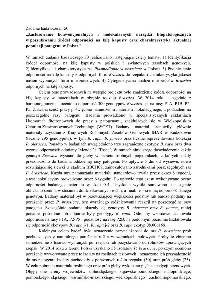 Zadanie badawcze nr 50 „Zastosowanie konwencjonalnych i molekularnych narzędzi fitopatologicznych w poszukiwaniu źródeł odporności na kiłę kapusty oraz charakterystyka aktualnej populacji patogenu w Polsce” W ramach zadania badawczego 50 realizowano następujące cztery tematy: 1) Identyfikacja źródeł odporności na kiłę kapusty w polskich i światowych zasobach genowych. 2) Identyfikacja i charakterystyka ras Plasmodiophora brassicae w Polsce. 3) Przeniesienie odporności na kiłę kapusty z odpornych form Brassica do rzepaku i charakterystyka jakości nasion wybranych form mieszańcowych. 4) Cytogenetyczna analiza mieszańców Brassica odpornych na kiłę kapusty. Celem prac prowadzonych na wstępie projektu było znalezienie źródła odporności na kiłę kapusty w materiałach w obrębie rodzaju Brassica. W 2014 roku – zgodnie z harmonogramem – oceniono odporność 300 genotypów Brassica sp. na rasy P1A, P1B, P2P5. Znaczną część pracy poświęcono namnożeniu materiału inokulacyjnego, z podziałem na poszczególne rasy patogenu. Badania prowadzono w specjalistycznych szklarniach i komorach fitotronowych do pracy z patogenami, znajdujących się w Wielkopolskim Centrum Zaawansowanych Technologii (WCZT). Badany materiał stanowiły głównie materiały uzyskane z Krajowych Roślinnych Zasobów Genowych IHAR w Radzikowie (łącznie 295 genotypów), w tym B. rapa, B. juncea oraz licznie reprezentowana kolekcja B. oleracea. Ponadto w badaniach uwzględniono trzy zagraniczne ekotypy B. rapa oraz dwa wzorce odporności: odmiany ‘Mendel’ i ‘Tosca’. W ramach niniejszego doświadczenia każdy genotyp Brassica wysiano do gleby w sześciu osobnych pojemnikach, z których każdy przeznaczono do badania oddzielnej rasy patogenu. Po upływie 5 dni od wysiewu, nowo rozwijające się siewki w stadium BBCH09, zainokulowano zarodnikami poszczególnych ras P. brassicae. Każda tura namnażania materiału standardowo trwała przez okres 8 tygodni, a test inokulacyjny prowadzono przez 6 tygodni. Po upływie tego czasu wykonywano ocenę odporności badanego materiału w skali 0-4. Uzyskane wyniki sumowano a następnie obliczano średnią w stosunku do skiełkowanych roślin, a finalnie – średnią odporność danego genotypu. Badany materiał był w przeważającej większości podatny lub bardzo podatny na porażenie przez P. brassicae, bez wyraźnego zróżnicowania reakcji na poszczególne rasy patogenu. Szczególnie podatne okazały się genotypy B. oleracea oraz B. juncea, mniej podatne, pośrednie lub odporne były genotypy B. rapa. Odmiany wzorcowe cechowała odporność na rasy P1A, P2-P5 i podatność na rasę P2B. na podobnym poziomie kształtowała się odporność ekotypów B. rapa j-1, B. rapa j-2 oraz B. rapa ekotyp 08.006169. Kolejnym celem badań było oznaczenie przynależności do ras P. brassicae prób pochodzących z naturalnego porażenia roślin w warunkach polowych. Próby te zbierano samodzielnie z losowo wybranych pól rzepaki lub pozyskiwano od rolników uprawiających rzepak. W 2014 roku z terenu Polski uzyskano 55 izolatów P. brassicae, po czym oceniono porażenie wywoływane przez te izolaty na roślinach testowych i oznaczono ich przynależność do ras patogenu. Izolaty pochodziły z porażonych roślin rzepaku (30) oraz prób gleby (25). W celu pobrania materiału roślinnego oraz prób gleby wykonano pięć ekspedycji terenowych. Objęły one tereny województw: dolnośląskiego, kujawsko-pomorskiego, małopolskiego, pomorskiego, śląskiego, warmińsko-mazurskiego, wielkopolskiego i zachodniopomorskiego. Pobrany materiał roślinny zastosowano do inokulacji na podatnych roślinach testowych. Rasy patogenu identyfikowano wyłącznie z izolatów uzyskanych z pojedynczych wyrośli korzeniowych. Badania te prowadzono na standardowych genotypach testowych, w tym 15 genotypach ECD, 3 genotypach wzorcowych INRA, 2 genotypach wzorcowych z Niemiec oraz 10 odmianach rzepaku. W wyniku procedury badawczej polegającej na namnażaniu badanego materiału wyłącznie z niewielkich fragmentów pojedynczych wyrośli na korzeniach rzepaku uzyskano izolaty reprezentujące poszczególne rasy patogenu. Ich przynależność do poszczególnych ras kształtowała się następująco: rasa P1 – 29 izolatów (52,7%) , P2 – 2 (3,6%), P3 – 20 (36,4%), P5 – 4 izolaty (7,3%). W 2014 roku zespół badawczy z IGR PAN opanował także metodę ilościowego PCR zgodnie z opisem podanym przez Wallenhammar i in. (2012). Metodą tą oceniono 50 prób gleby, w tym 35 prób pochodzących z różnych lokalizacji w Polsce oraz 15 prób zawierających różne stężenia zarodników patogenu, które posłużyły do wyznaczenia krzywej wzorcowej. Przy zastosowaniu metody qPCR oceniono 50 prób gleby, w tym 35 prób pochodzących z różnych lokalizacji w Polsce oraz 15 prób zawierających różne stężenia zarodników patogenu, które posłużyły do wyznaczenia krzywej wzorcowej. Na podstawie uzyskanych wyników ustalono rekomendacje dla poszczególnych typów gleb, zgodnie z metodą skandynawską. Większość testowanych gleb pochodzących głównie z południa Polski była bezpieczna dla uprawy odmian rzepaku cechujących się odpornością na kiłę kapusty. Na 9,7% gleb przy uprawie odmian podatnych ryzyko strat plonu przewyższało 10%. W przypadku 3,2% gleb zalecono rezygnację z uprawy rzepaku ze względu na bardzo wysokie stężenie zarodników patogenu. Na podstawie metodyki własnej przy współpracy z firmą Novazym, która dysponuje specjalistyczną aparaturą oraz programem do projektowania starterów, opracowano unikalną metodę detekcji zarodników P. brassicae, przy zastosowaniu amplifikacji DNA w warunkach izotermicznych z wykorzystaniem starterów zapętlających (LAMP). Celem badań było opracowanie szybkiego, taniego i niezawodnego sposobu wykrywania patogenu w materiale roślinnym, glebie i wodzie. Do detekcji wykorzystano polimerazę GspSSD, wyo