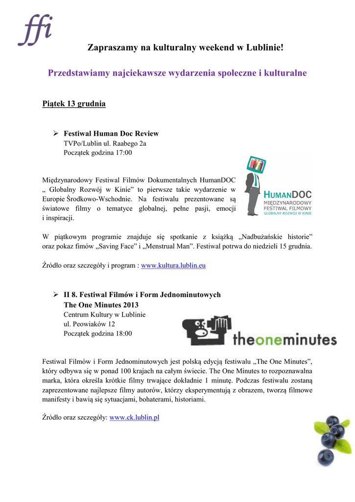 Zapraszamy na kulturalny weekend w Lublinie! Przedstawiamy najciekawsze wydarzenia społeczne i kulturalne Piątek 13 grudnia Festiwal Human Doc Review TVPo/Lublin ul. Raabego 2a Początek godzina 17:00 Międzynarodowy Festiwal Filmów Dokumentalnych HumanDOC „ Globalny Rozwój w Kinie” to pierwsze takie wydarzenie w Europie Środkowo-Wschodnie. Na festiwalu prezentowane są światowe filmy o tematyce globalnej, pełne pasji, emocji i inspiracji. W piątkowym programie znajduje się spotkanie z książką „Nadbużańskie historie” oraz pokaz fimów „Saving Face” i „Menstrual Man”. Festiwal potrwa do niedzieli 15 grudnia. Źródło oraz szczegóły i program : www.kultura.lublin.eu II 8. Festiwal Filmów i Form Jednominutowych The One Minutes 2013 Centrum Kultury w Lublinie ul. Peowiaków 12 Początek godzina 18:00 Festiwal Filmów i Form Jednominutowych jest polską edycją festiwalu „The One Minutes”, który odbywa się w ponad 100 krajach na całym świecie. The One Minutes to rozpoznawalna marka, która określa krótkie filmy trwające dokładnie 1 minutę. Podczas festiwalu zostaną zaprezentowane najlepsze filmy autorów, którzy eksperymentują z obrazem, tworzą filmowe manifesty i bawią się sytuacjami, bohaterami, historiami. Źródło oraz szczegóły: www.ck.lublin.pl Sobota 14 grudnia Maraton Pisania Listów Amnesty International TVPo/Lublin Początek godzina 12:00 W dniach 14-15 grudnia w całej Polsce odbywa się XIV Maraton Pisania Listów Amnesty International. W trakcie maratonu uczestnicy przez 24 godziny piszą ręcznie listy w obronie konkretnych osób więźniów sumienia i tych narażonych na łamanie praw człowieka. Akcja odbywa się zawsze w okolicach 10 grudnia, kiedy świętujemy Międzynarodowy Dzień Praw Człowieka. Opis sylwetek, w sprawie których będzie można pisać listy znajduje się na stronie: www.amnesty.org.pl Źródło oraz szczegóły: www.ailublin.wordpress.com/ V MAAT Festival Centrum Kultury w Lublinie ul. Peowiaków 12 Początek godzina 18:00 W dniach 14 – 17 grudnia w Centrum Kultury w Lublinie będzie odbywać się finał V MAAT Festival – „border line”. Przez cały rok w Centrum Kultury obyło się 8 rezydencji artystów i tancerzy, a ich praca została udokumentowana. Podczas festiwalu będą miały miejsce prezentacje tegorocznych rezydentów, a także zostaną przedstawione pokazy dokumentów o ich procesie twórzczym, Źródło oraz szczegóły: www.dziennikwschodni.pl Polsko-czeski pejzaż kulturowy - spotkanie w Lublinie Klubokawiarnia Spółdzielnia ul. Peowiaków 11, Lublin Początek godzina 16:00 Stowarzyszenie Panorama Kultur zaprasza na spotkanie z cyklu "Polsko-czeski pejzaż kulturowy" W programie: Prezentacja "Třebíč. Miasto z historią". O swoim mieście opowie Jan Dvořák, odbywający w Lublinie roczny wolontariat EVS Dyskusja o krajobrazie kulturowym Czech i Polski oraz prezentacja serwisu internetowego plcz.panoramakultur.eu Prowadzenie: Katarzyna Szewczyk. Projekcja filmu " Śmierć pięknych saren" (1986, reż Karel Kachyňa) Projekt "Polsko-czeski pejzaż kulturowy" uzyskał dofinansowanie Ministerstwa Spraw Zagranicznych RP w ramach programu Forum Polsko-Czeskie: wspieranie rozwoju stosunków polsko-czeskich 2013 r Źródło oraz szczegóły: www.facebook.com Niedziela 15 grudnia Koncert: Zumbaland Teatr Stary, ul. Jezuicka 18 Początek godzina 18:00 Zumbaland to jeden z najpopularniejszych zespołów w Gruzji. Łączy takie gatunki muzyki jak jazz, fusion, folk, funk, rock. Ich twórczość wyróżnia się żywiołowością, pasją i rozmaitością brzmień i ukazuje prawdziwą kaukaską duszę. Zespół jest laureatem dwóch bardzo ważnych festiwali gruzińskich: „Hands” i „Margarita”. Koncert jest częścią Festiwalu Jazz Bez 2013. Źródło oraz szczegóły: www.lublin.kultura.eu Spotkanie wigilijne „Z chłopskiej chaty i ziemiańskiego dworu” Muzeum Wsi Lubelskiej, al.Warszawska Początek godzina 09:00 W niedzielę 15 grudnia o godzinie 9:00 w Skansenie odbędzie się spotkanie wigilijne. Uczestnicy będą mogli dowiedzieć się jak wyglądała wigilia u naszych przodków. Pracownicy muzeum odpowiedzą między innymi na pytania: jakie potrawy wigilijne przygotowali nasi przodkowie? Jak zdobili izbę? Kiedy pojawiała się choinka? Będzie można również spróbować tradycyjnych wigilijnych potraw. Źródło oraz szczegóły: www.mmlublin.pl