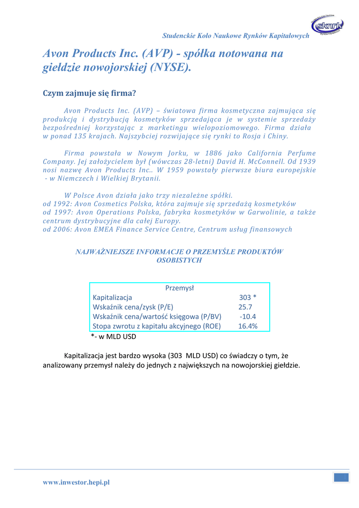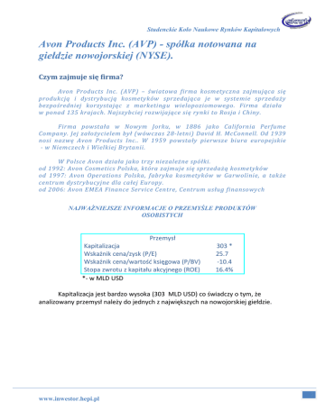 Studenckie Koło Naukowe Rynków Kapitałowych Avon Products Inc. (AVP) - spółka notowana na giełdzie nowojorskiej (NYSE). Czym zajmuje się firma? Avon Products Inc. (AVP) – światowa firma kosmetyczna zajmująca się produkcją i dystrybucją kosmetyków sprzedająca je w systemie sprzedaży bezpośredniej korzystając z marketingu wielopoziomowego. Firma działa w ponad 135 krajach. Najszybciej rozwijające się rynki to Rosja i Chiny. Firma powstała w Nowym Jorku, w 1886 jako California Perfume Company. Jej założycielem był (wówczas 28-letni) David H. McConnell. Od 1939 nosi nazwę Avon Products Inc.. W 1959 powstały pierwsze biura europejskie - w Niemczech i Wielkiej Brytanii. W Polsce Avon działa jako trzy niezależne spółki. od 1992: Avon Cosmetics Polska, która zajmuje się sprzedażą kosmetyków od 1997: Avon Operations Polska, fabryka kosmetyków w Garwolinie, a także centrum dystrybucyjne dla całej Europy. od 2006: Avon EMEA Finance Service Centre, Centrum usług finansowych NAJWAŻNIEJSZE INFORMACJE O PRZEMYŚLE PRODUKTÓW OSOBISTYCH Przemysł Kapitalizacja Wskaźnik cena/zysk (P/E) Wskaźnik cena/wartość księgowa (P/BV) Stopa zwrotu z kapitału akcyjnego (ROE) *- w MLD USD 303 * 25.7 -10.4 16.4% Kapitalizacja jest bardzo wysoka (303 MLD USD) co świadczy o tym, że analizowany przemysł należy do jednych z największych na nowojorskiej giełdzie. www.inwestor.hepi.pl 1 Studenckie Koło Naukowe Rynków Kapitałowych NAJWAŻNIEJSZE INFORMACJE O SPÓŁCE Okres 2006 2005 2004 Przychody* Zysk brutto* Zysk netto** Zysk na akcję EPS 8,763.9 8,149.6 7,747.8 5,242.7 4,931.5 4,723.7 477.6 847.6 846.1 1.06 1.81 1.77 2006 rok Kapitalizacja* 16.97 Wskaźnik cena/zysk (P/E) 36.18 Stopa zwrotu z aktywów (ROA) 13.50% Stopa zwrotu z kapitału akcyjnego (ROE) 60.28% Dochód na akcje 19.589 Kwartalny wzrost przychodów (YOY) 9.40% EBIDA 5.33 Kwartalny wzrost zysku (YOY) 1.24 Wskaźnik Beta 0.59 Roczna stopa zwrotu 1.90% Stopa dywidendy 1.80% Data wypłaty dywidendy 01.03.07 *- w MLD USD Spółka Avon jest w dobrej kondycji finansowej, co potwierdza wypracowany przez spółkę zysk netto w wysokości 477.6 MLN USD (stan na 2006 rok). Wzrost zysku netto spółki wykazuje tendencje wzrostową co jest informacją korzystną dla inwestorów. Wskaźnik cena/zysk jaki odnotowała spółka (36.18) jest wyższy w porównaniu z średnią dla pozostałych spółek (25.7) co jest informacją bardzo pozytywną. Wartość wskaźnika ROE dla Avon (60.28%) jest ponad trzykrotnie większa niż średnia wartość dla analizowanego przemysłu (16.4%) co oznacza, że spółka osiągnęła trzykrotnie wyższą stopę zwrotu z kapitału własnego niż średnia dla całego przemysłu co jest informacją bardzo pozytywną. Następną ważną informacją na którą trzeba zwrócić uwagę jest wartość wskaźnika Beta (0.59), którego akcje wykazują mniejszą zmienność w porównaniu z indeksem S&P 100 co oznacza, że Avon jest walorem defensywnym dla inwestorów długoterminowych. Jeżeli indeks S&P 100 wzrośnie o 1% to analizowana spółka wzrośnie o 0.59%. Natomiast w sytuacji, gdy indeks spadnie o 1% to Avon spadnie o 0.59%. www.inwestor.hepi.pl 1 Studenckie Koło Naukowe Rynków Kapitałowych Wnioski: Analizowana spółka charakteryzuje się bardzo dobrymi wskaźnikami co wpływa bardzo pozytywnie dla potencjalnych inwestorów długoterminowych. Wypracowany przez spółkę zysk netto, wysoka wartość wskaźnika cena/zysk oraz wysoki poziom wskaźnika ROE wpływają korzystnie dla potencjalnych inwestorów. Analizując powyższe dane można stwierdzić, że spółka wpływa bardzo pozytywnie dla inwestora długoterminowego. Zestawienie porównawcze Nazwa spółki AVP Avon Products, Inc. LORL Loral Space & Communications Ltd. REV Revlon, Inc. Akcja której firmy będzie miała szacunkowo największy wzrost ceny? 38.55 51.08 1.28 Cena obecna Cena na koniec roku 55.49 B/D B/D finansowego +43.94% B/D B/D Zmiana ceny w % Cena na przyszły rok 72.67 B/D B/D finansowy +88.52% B/D B/D Zmiana ceny w % Jaki poziom przychodów i zysku netto odnotowała spółka w ciągu ostatnich 12-miesięcy? 8.76 * 797.33 ** 1.33 ** Przychody 477.60 -22.72 -251.30 Zysk netto** Jaki wzrost przychodów i zysku netto odnotowała spółka? 7.50% +27.30% -0.10% Wzrost przychodów -43.70% B/D B/D Wzrost zysku netto Jaki jest stosunek ceny akcji do zysku? 35.80 B/D B/D Wskaźnik cena/zysk (P/E) Jak kształtowała się cena akcji w ciągu ostatnich 12-miesięcy? Zmiana ceny w ciągu 10.6% 26.0% -7.7% ostatnich 3- miesięcy Zmiana ceny w ciągu 29.6% 90.9% -12.4% ostatnich 6- miesięcy Zmiana ceny w ciągu 22.4% 78.7% -62.0% ostatnich 12- miesięcy EBIDA 8.30% 8.60% 8.00% Zysk na akcję (EPS) 1.063 -1.136 -0.621 Pracownicy 40,300 2,100 6,000 Kwartalna stopa wzrostu 9.40% 4.30% -13.50% (YOY) Kapitalizacja * 17.00 1.02 538.65** *= w MLD USD www.inwestor.hepi.pl 1 Studenckie Koło Naukowe Rynków Kapitałowych Wartość wskaźnika cena/zysk jest najwyższą wartością w porównaniu z pozostałymi spółkami co wpływa pozytywnie dla potencjalnych inwestorów. Wartość wskaźnika informująca inwestorów o wielkości zysku jaki przypada na jedną akcję (EPS) jest najwyższą wartością w powyższym zestawienu, co jest informacją bardzo pozytywną. Jak wysoki przychód i zysk netto odnotowała spółka w stosunku do średniej wartości dla przemysłu? Przychody i Zysk netto (YOY) Spółka Przemysł Przychody * 8.76 9.06 Zysk netto ** 477.60 761.38 *= w MLD USD **= w MLN USD Avon Products, Inc. Przychody w stosunku rocznym: 8.76 MLD USD Różnica procentowa między przychodami osiągniętymi przez spółkę, a średnimi przychodami występującymi w przemyśle: -3.22% Avon Products, Inc. Zysk netto w stosunku rocznym: 477.60 MLN USD Różnica procentowa między zyskiem netto osiągniętym przez spółkę, a średnią wartością zysku netto występującą w przemyśle: -37.27% Jaki był wzrost dla spółki i przemysłu?
