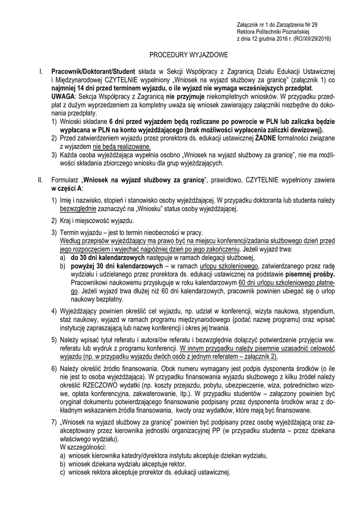 Załącznik nr 1 do Zarządzenia Nr 29 Rektora Politechniki Poznańskiej z dnia 12 grudnia 2016 r. (RO/XII/29/2016) PROCEDURY WYJAZDOWE I. Pracownik/Doktorant/Student składa w Sekcji Współpracy z Zagranicą Działu Edukacji Ustawicznej i Międzynarodowej CZYTELNIE wypełniony „Wniosek na wyjazd służbowy za granicę” (załącznik 1) co najmniej 14 dni przed terminem wyjazdu, o ile wyjazd nie wymaga wcześniejszych przedpłat. UWAGA: Sekcja Współpracy z Zagranicą nie przyjmuje niekompletnych wniosków. W przypadku przedpłat z dużym wyprzedzeniem za kompletny uważa się wniosek zawierający załączniki niezbędne do dokonania przedpłaty. 1) Wnioski składane 6 dni przed wyjazdem będą rozliczane po powrocie w PLN lub zaliczka będzie wypłacana w PLN na konto wyjeżdżającego (brak możliwości wypłacenia zaliczki dewizowej). 2) Przed zatwierdzeniem wyjazdu przez prorektora ds. edukacji ustawicznej ŻADNE formalności związane z wyjazdem nie będą realizowane. 3) Każda osoba wyjeżdżająca wypełnia osobno „Wniosek na wyjazd służbowy za granicę”, nie ma możliwości składania zbiorczego wniosku dla grup wyjeżdzających. II. Formularz „Wniosek na wyjazd służbowy za granicę”, prawidłowo, CZYTELNIE wypełniony zawiera w części A: 1) Imię i nazwisko, stopień i stanowisko osoby wyjeżdżającej. W przypadku doktoranta lub studenta należy bezwzględnie zaznaczyć na „Wniosku” status osoby wyjeżdżającej. 2) Kraj i miejscowość wyjazdu. 3) Termin wyjazdu – jest to termin nieobecności w pracy. Według przepisów wyjeżdżający ma prawo być na miejscu konferencji/zadania służbowego dzień przed jego rozpoczęciem i wyjechać najpóźniej dzień po jego zakończeniu. Jeżeli wyjazd trwa: a) do 30 dni kalendarzowych następuje w ramach delegacji służbowej, b) powyżej 30 dni kalendarzowych – w ramach urlopu szkoleniowego, zatwierdzanego przez radę wydziału i udzielanego przez prorektora ds. edukacji ustawicznej na podstawie pisemnej prośby. Pracownikowi naukowemu przysługuje w roku kalendarzowym 60 dni urlopu szkoleniowego płatnego. Jeżeli wyjazd trwa dłużej niż 60 dni kalendarzowych, pracownik powinien ubiegać się o urlop naukowy bezpłatny. 4) Wyjeżdżający powinien określić cel wyjazdu, np. udział w konferencji, wizyta naukowa, stypendium, staż naukowy, wyjazd w ramach programu międzynarodowego (podać nazwę programu) oraz wpisać instytucję zapraszającą lub nazwę konferencji i okres jej trwania. 5) Należy wpisać tytuł referatu i autora/ów referatu i bezwzględnie dołączyć potwierdzenie przyjęcia ww. referatu lub wydruk z programu konferencji. W innym przypadku należy pisemnie uzasadnić celowość wyjazdu (np. w przypadku wyjazdu dwóch osób z jednym referatem – załącznik 2). 6) Należy określić źródło finansowania. Obok numeru wymagany jest podpis dysponenta środków (o ile nie jest to osoba wyjeżdżająca). W przypadku finansowania wyjazdu służbowego z kilku źródeł należy określić RZECZOWO wydatki (np. koszty przejazdu, pobytu, ubezpieczenie, wiza, pośrednictwo wizowe, opłata konferencyjna, zakwaterowanie, itp.). W przypadku studentów – załączony powinien być oryginał dokumentu potwierdzającego finansowanie podpisany przez dysponenta środków wraz z dokładnym wskazaniem źródła finansowania, kwoty oraz wydatków, które mają być finansowane. 7) „Wniosek na wyjazd służbowy za granicę” powinien być podpisany przez osobę wyjeżdżającą oraz zaakceptowany przez kierownika jednostki organizacyjnej PP (w przypadku studenta – przez dziekana właściwego wydziału). W szczególności: a) wniosek kierownika katedry/dyrektora instytutu akceptuje dziekan wydziału, b) wniosek dziekana wydziału akceptuje rektor, c) wniosek rektora akceptuje prorektor ds. edukacji ustawicznej. 2 III. W części B „Wniosku na wyjazd służbowy za granicę” należy zaznaczyć rodzaj środka transportu: 1) W przypadku planowania podróży samolotem/koleją/promem należy skontaktować się z biurem podróży w celu rozeznania możliwości przejazdu. UWAGA: rezerwacji biletów można dokonać dopiero po uzyskaniu zgody prorektora ds. edukacji ustawicznej na wyjazd. 2) Dopuszcza się zakup biletów przez wyjeżdżającego bez pośrednictwa biura podróży obsługującego Politechnikę Poznańską (po uzyskaniu zgody na wyjazd). W takim przypadku wyjeżdżający winien sam opłacić bilet, uzyskując za niego prawidłowo wystawioną fakturę, wg wzoru: Politechnika Poznańska/Poznan University of Technology Pl. M. Sklodowskiej-Curie 5 60-965 Poznan, Polska/ POLAND NIP/VAT number PL 777-00-03-699 (z nazwiskiem osoby, dla której został wystawiony rachunek) 3) 4) 5) 6) 7) 8) lub uzyskać od biura podróży fakturę przelewową (wystawioną wg danych powyżej ) z co najmniej 7dniowym terminem płatności. Refundację zakupu biletu kupionego bez pośrednictwa biura podróży obsługującego Politechnikę Poznańską można uzyskać wyłącznie gdy zakup był dokonany po uzyskaniu zgody prorektora ds. edukacji ustawicznej na wyjazd służbowy za granicę oraz zostały zachowane procedury wynikające z Pzp (patrz pkt. 4 – ceny biletów) Faktury, bilety do wglądu oraz potwierdzenie płatności (wydruk z transakcji w przypadku opłacenia biletu kartą lub przelewem przez wyjeżdżającego) należy dostarczyć do Sekcji Współpracy z Zagranicą najpóźniej tydzień po dokonaniu zakupu. Po zweryfikowaniu prawidłowości nastąpi zwrot kosztów w PLN na konto wyjeżdżającego. UWAGA: Refundacji podlegają jedynie bilety zakupione na służbowy wyjazd zgodnie z jego terminem. Jeżeli cena biletu lotniczego międzynarodowego typu europejski i Bliski Wschód przekracza kwotę 3 000 PLN brutto lub w przypadku biletu międzynarodowego typu interkontynentalny przekracza kwotę 4 500 PLN brutto wyjeżdżający ma obowiązek dostarczyć dokumentację przewidzianą w Zarządzeniu Rektora Politech