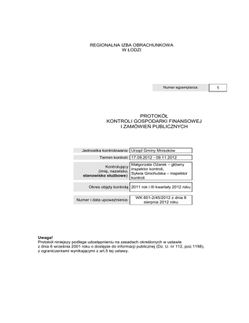 REGIONALNA IZBA OBRACHUNKOWA W ŁODZI Numer egzemplarza: PROTOKÓŁ KONTROLI GOSPODARKI FINANSOWEJ I ZAMÓWIEŃ PUBLICZNYCH Jednostka kontrolowana: Urząd Gminy Mniszków Termin kontroli: 17.09.2012 - 09.11.2012 Małgorzata Ożarek – główny Kontrolujący inspektor kontroli, (imię, nazwisko, Sylwia Grochulska – inspektor stanowisko służbowe): kontroli Okres objęty kontrolą 2011 rok i III kwartały 2012 roku Numer i data upoważnienia: WK 601-2/45/2012 z dnia 9 sierpnia 2012 roku Uwaga! Protokół niniejszy podlega udostępnieniu na zasadach określonych w ustawie z dnia 6 września 2001 roku o dostępie do informacji publicznej (Dz. U. nr 112, poz.1198), z ograniczeniami wynikającymi z art.5 tej ustawy. 1 PROTOKÓŁ Z KONTROLI KOMPLEKSOWEJ PRZEPROWADZONEJ W GMINIE MNISZKÓW Regionalna Izba Obrachunkowa w Łodzi, ul. Zamenhofa 10 90-431 Łódź, tel. (0-42) 6366896, fax (0-42) 6367424 I. INFORMACJE WSTĘPNE DANE O JEDNOSTCE Mniszków jest gminą wiejską położoną w Powiecie Opoczyńskim i zlokalizowaną w północno – wschodniej części Województwa Łódzkiego. Granice gminy stanowią: od północy – Gmina Tomaszów Mazowiecki, od wschodu – Gmina Sławno, od południa – Gminy Paradyż i Aleksandrów i od zachodu – Gmina Sulejów. Powierzchnia administracyjna Gminy Mniszków wynosi 12.383 ha. Liczba ludności wg stanu na dzień 8 marca 2012 roku wynosiła 4723 osób, w tym 2.325 kobiet i 2.398 mężczyzn. Na dzień 30 czerwca 2012 roku na terenie gminy było 238 bezrobotnych osób. W stosunku do stanu na dzień 31 grudnia 2011 roku liczba bezrobotnych wzrosła o 35 osób. Siedziba Urzędu Gminy mieści się w Mniszkowie 26-341 ul. Powstańców Wielkopolskich 10. Numery NIP i REGON kontrolowanej jednostki są następujące: Urząd Gminy Gmina Mniszków NIP 768-13-01-188 768-17-19-189 REGON 00054219 590648126 Kontrola kompleksowa gospodarki finansowej i zamówień publicznych w Urzędzie Gminy w Mniszkowie została przeprowadzona na podstawie przepisów art. 1 ust 1 i 2 oraz art. 7a ustawy z dnia 7 października 1992 r. o regionalnych izbach obrachunkowych (tekst jednolity Dz. U z 2001 r., nr 55, poz. 577 ze zm.) w dniach od 17 września do 9 listopada 2012 roku. II. USTALENIA OGÓLNE 1. KIEROWNICTWO JEDNOSTKI Przewodniczący rady gminy Przewodniczącym Rady Gminy Mniszków jest Sławomir Pawłowski wybrany do pełnienia tej funkcji uchwałą Rady Gminy nr I/1/10 z dnia 30 listopada 2010 roku. Wójt i jego zastępca Wójtem Gminy Mniszków jest Janusz Ciesielski wybrany w powszechnych wyborach bezpośrednich w dniu 21 listopada 2010 roku. Janusz Ciesielski pełni funkcję Wójta od dnia 30 listopada 2010 roku – uchwała nr I/6/10 z dnia 30 listopada 2010 roku, i pełnił funkcję Wójta Gminy również w poprzedniej kadencji. Funkcję Zastępcy Wójta powierzono Sekretarzowi Gminy Jerzemu Milczarkowi na mocy zarządzenia Wójta Gminy nr 24/06 z dnia 27 listopada 2006 roku. W zarządzeniu wskazano zakres wykonywanych obowiązków przez Zastępcę Wójta, komórki organizacyjne Urzędu Gminy nadzorowane przez Zastępcę oraz jednostki współpracujące z Zastępcą Wójta. W związku z powierzeniem obowiązków Zastępcy Wójta w niniejszym zarządzeniu wskazano również upoważnienie Jerzego Milczarka do: - wydawania decyzji administracyjnych w indywidualnych sprawach administracji publicznej – art.39 ust.2 ustawy o samorządzie gminnym, z zakresu _____________________________________________________ 2 PROTOKÓŁ Z KONTROLI KOMPLEKSOWEJ PRZEPROWADZONEJ W GMINIE MNISZKÓW Regionalna Izba Obrachunkowa w Łodzi, ul. Zamenhofa 10 90-431 Łódź, tel. (0-42) 6366896, fax (0-42) 6367424 - składania samodzielnie oświadczeń woli w imieniu gminy w zakresie zarządu mieniem komunalnym – art.46 ust.1 ustawy o samorządzie gminnym, - prowadzenia spraw związanych z przygotowaniem i przeprowadzeniem postępowania o udzielenie zamówienia publicznego, w tym zawierania umów, - zawierania umów i zaciągania zobowiązań w ramach bieżącej obsługi technicznej i materiałowej Urzędu Gminy, - wykonywania obowiązków Wójta Gminy w czasie nieobecności lub niemożności pełnienia obowiązków. Skarbnik gminy Skarbnikiem Gminy Mniszków jest Marianna Marszałek-Sadowska wybrana na to stanowisko uchwałą nr III/16/90 Rady Gminy Mniszków z dnia 21 czerwca 1990 roku. Uchwałą nr XI/59/2011 z dnia 28 października 2011 roku Rada Gminy Mniszków odwołała Skarbnika Gminy Mniszków z dniem 28 października 2011 roku. Dnia 4 listopada 2011 roku Skarbnik Gminy zwrócił się z podaniem do Wójta Gminy o przyjęcie do pracy na stanowisko Skarbnika Gminy. Uchwałą nr XII/66/2011 z dnia 7 listopada 2011 roku Rada Gminy Mniszków powołała ponownie Mariannę Sadowską Marszałek na stanowisko Skarbnika Gminy Mniszków na wniosek Wójta Gminy. Sekretarz gminy Funkcję Sekretarza Gminy Mniszków pełni Jerzy Milczarek powołany do pełnienia tej funkcji uchwałą Rady Gminy Mniszków nr I/6/98 z dnia 29 października 1998 roku. Zgodnie z treścią art. 53 ust. 1 ustawy z dnia 21 listopada 2008 roku o pracownikach samorządowych (Dz. U. nr 223, poz. 1458 ze zmianami), z dniem wejścia w życie niniejszej ustawy, stosunek pracy na podstawie powołania Sekretarza Gminy, przekształcił się w stosunek pracy na podstawie umowy o pracę na czas nieokreślony. 2. GMINNE JEDNOSTKI ORGANIZACYJNE I PRAWNOORGANIZACYJNE FORMY ICH DZIAŁALNOŚCI Według rejestru jednostek organizacyjnych na terenie Gminy Mniszków funkcjonują następujące jednostki organizacyjne: - Gimnazjum Publiczne w Mniszkowie – statut szkoły przyjęty do realizacji uchwałą Rady Pedagogicznej nr 1 z dnia 30 sierpnia 2007 rok. - Szkoła Podstawowa w Stoku – statut szkoły przyjęty na posiedzeniu Rady Pedagogicznej w dniu 18 września 2007 roku. - Szkoła Podstawowa w Bukowcu nad Pilicą – statut szkoły zmieniony uchwałą Rady Pedagogicznej nr 3/08/07 z dnia 18 czerwca 2007 roku. - Szkoła Podstawowa w Błog