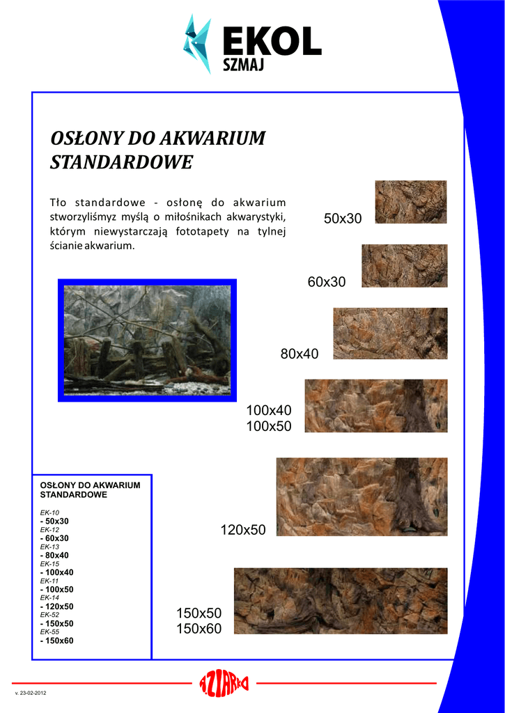 OSŁONY DO AKWARIUM STANDARDOWE Tło standardowe - osłonę do akwarium stworzyliśmyz myślą o miłośnikach akwarystyki, którym niewystarczają fototapety na tylnej ścianie akwarium. 50x30 60x30 80x40 100x40 100x50 OSŁONY DO AKWARIUM STANDARDOWE EK-10 - 50x30 EK-12 - 60x30 120x50 EK-13 - 80x40 EK-15 - 100x40 EK-11 - 100x50 EK-14 - 120x50 EK-52 - 150x50 EK-55 - 150x60 v. 23-02-2012 150x50 150x60 OSŁONY DO AKWARIUM SKALNE Tło typ skała zostało opracowane specjalnie z myślą o hodowcach i pasjonatach ryb z rodziny pielęgnicowatych żyjących w biotopach skalnych. 50x30 60x30 80x40 100x40 100x50 100x60 OSŁONY DO AKWARIUM SKALNE EK-16 - 50x30 EK-17 - 60x30 EK-21 - 80x40 120x50 120x60 EK-42 - 100x40 EK-22 - 100x50 EK-46 - 100x60 EK-23 - 120x50 EK-48 - 120x60 EK-51 - 150x50 150x50 150x60 EK-68 - 150x60 v. 23-02-2012 OSŁONY DO AKWARIUM KORZENNE Tło typ korzeń zostało stworzone z myślą o klientach mających większe wymagania dotyczące form skalno-korzennych. Zastosowana w nich technologia odwzorowuje skały i korzenie dając wrażenie pełnej naturalności. 50x30 60x30 80x40 100x40 100x50 OSŁONY DO AKWARIUM KORZENNE EK-24 - 50x30 EK-26 120x50 - 60x30 EK-27 - 80x40 EK-41 - 100x40 EK-28 - 100x50 EK-29 - 120x50 EK-50 - 150x50 EK-71 - 150x60 v. 23-02-2012 150x50 OSŁONY DO AKWARIUM AMAZONKA Osłona do akwarium amazonka to NOWOŚĆ. Odwzorowuje biotop dorzecza Amazonki. Stosując ją jako tło uzyskujemy wspaniały wystrój akwarium przy minimalnym nakładzie pracy. 50x30 60x30 80x40 100x40 100x50 100x60 OSŁONY DO AKWARIUM AMAZONKA 120x50 EK-56 - 50x30 EK-57 - 60x30 EK-59 - 80x40 150x50 150x60 EK-40 - 100x40 EK-43 - 100x50 EK-44 - 100x60 EK-47 - 120x50 EK-49 - 150x50 EK-53 - 150x60 200x60 EK-70 - 200x60 v. 23-02-2012 OSŁONY DO AKWARIUM PŁASKIE Tło typ korzeń zostało stworzone z myślą o klientach mających większe wymagania dotyczące form skalno-korzennych. Zastosowana w nich technologia odwzorowuje skały i korzenie dając wrażenie pełnej naturalności. 50x30 60x30 80x40 OSŁONY DO AKWARIUM PŁASKA EK-69 - 50x30 100x40 100x50 EK-58 - 60x30 EK-60 - 80x40 EK-61 - 100x40 EK-62 - 100x50 EK-64 - 120x50 v. 23-02-2012 120x50 SKAŁY HODOWLANE Skały hodowlane zostały opracowane na podstawie doświadczeń hodowców ryb hodowlanych. Zewnętrzna struktura produktów jest doskonałą imitacja naturalnej skały, a wnętrze z kilkoma otworami, stanowi idealne schronienie dla ryb. Poszczególne rodzaje skał można zestawić tworząc urozmaicone kompozycje skalne SH - 20 SH - 24 SH - 27 SKAŁY HODOWLANE EK-07 - SH-20 EK-09 - SH-24 EK-06 - SH-27 EK-05 - SH-28 EK-08 - SH-30 SH - 30 SH - 28 v. 23-02-2012 KAMIENIE HODOWLANE Kamień hodowlany do zastosowania w małych zbiornikach akwariowych oraz w kompozycjach z kamieniami i korzeniami. Posiada dwa otwory wpływowe. KH - 42 KH - 45 KH - 47 KAMIENIE HODOWLANE EK-37 - KH-42 EK-36 - KH-45 EK-38 - KH-47 EK-39 - KH-49 v. 23-02-2012 KH - 49 NAPOWIETRZACZE Z OŚWIETLENIEM WULKAN KORZEŃ NAPOWIETRZACZE EK-NAPKD - korzeń duży EK-NAPKM - korzeń mały EK-NAPWD - wulkan duży EK-NAPWM - wulkan mały v. 23-02-2012