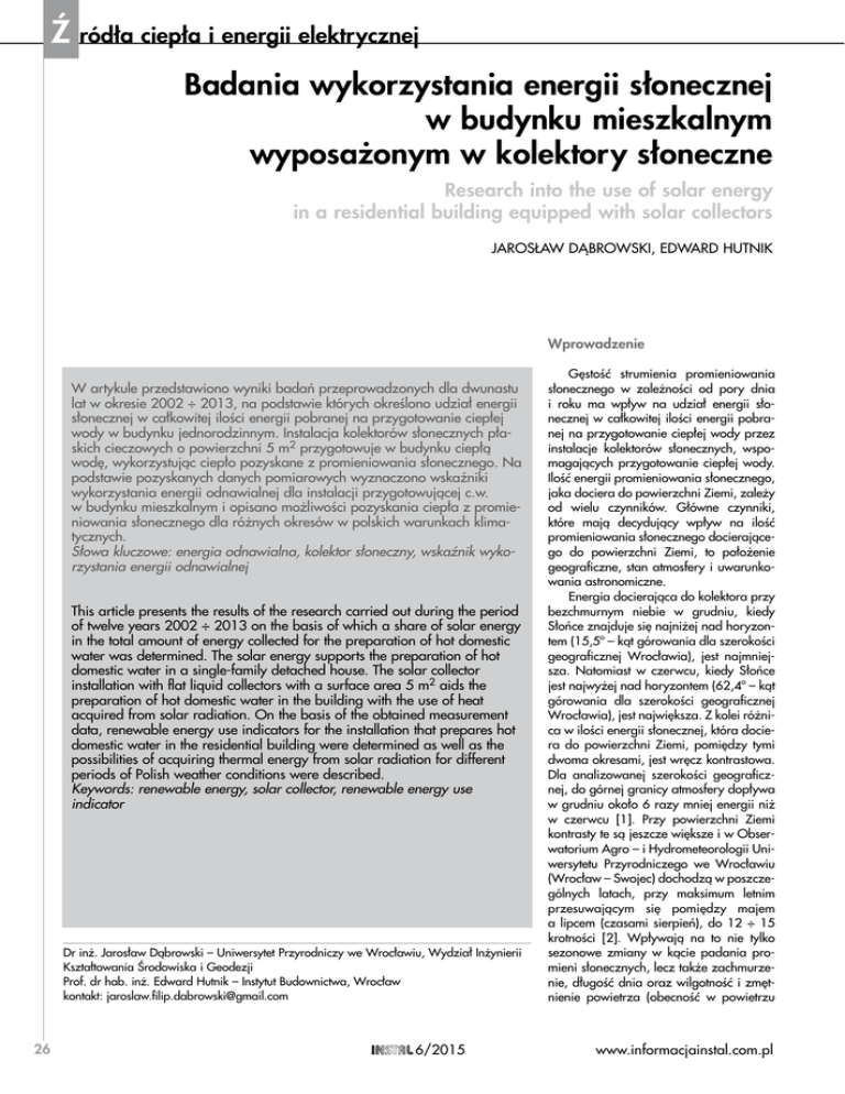Ź ródła ciepła i energii elektrycznej Badania wykorzystania energii słonecznej w budynku mieszkalnym wyposażonym w kolektory słoneczne Research into the use of solar energy in a residential building equipped with solar collectors JAROSŁAW DĄBROWSKI, EDWARD HUTNIK Wprowadzenie W artykule przedstawiono wyniki badań przeprowadzonych dla dwunastu lat w okresie 2002 ÷ 2013, na podstawie których określono udział energii słonecznej w całkowitej ilości energii pobranej na przygotowanie ciepłej wody w budynku jednorodzinnym. Instalacja kolektorów słonecznych płaskich cieczowych o powierzchni 5 m2 przygotowuje w budynku ciepłą wodę, wykorzystując ciepło pozyskane z promieniowania słonecznego. Na podstawie pozyskanych danych pomiarowych wyznaczono wskaźniki wykorzystania energii odnawialnej dla instalacji przygotowującej c.w. w budynku mieszkalnym i opisano możliwości pozyskania ciepła z promieniowania słonecznego dla różnych okresów w polskich warunkach klimatycznych. Słowa kluczowe: energia odnawialna, kolektor słoneczny, wskaźnik wykorzystania energii odnawialnej This article presents the results of the research carried out during the period of twelve years 2002 ÷ 2013 on the basis of which a share of solar energy in the total amount of energy collected for the preparation of hot domestic water was determined. The solar energy supports the preparation of hot domestic water in a single-family detached house. The solar collector installation with flat liquid collectors with a surface area 5 m2 aids the preparation of hot domestic water in the building with the use of heat acquired from solar radiation. On the basis of the obtained measurement data, renewable energy use indicators for the installation that prepares hot domestic water in the residential building were determined as well as the possibilities of acquiring thermal energy from solar radiation for different periods of Polish weather conditions were described. Keywords: renewable energy, solar collector, renewable energy use indicator Dr inż. Jarosław Dąbrowski – Uniwersytet Przyrodniczy we Wrocławiu, Wydział Inżynierii Kształtowania Środowiska i Geodezji Prof. dr hab. inż. Edward Hutnik – Instytut Budownictwa, Wrocław kontakt: [email protected] 26 6/2015 Gęstość strumienia promieniowania słonecznego w zależności od pory dnia i roku ma wpływ na udział energii słonecznej w całkowitej ilości energii pobranej na przygotowanie ciepłej wody przez instalacje kolektorów słonecznych, wspomagających przygotowanie ciepłej wody. Ilość energii promieniowania słonecznego, jaka dociera do powierzchni Ziemi, zależy od wielu czynników. Główne czynniki, które mają decydujący wpływ na ilość promieniowania słonecznego docierającego do powierzchni Ziemi, to położenie geograficzne, stan atmosfery i uwarunkowania astronomiczne. Energia docierająca do kolektora przy bezchmurnym niebie w grudniu, kiedy Słońce znajduje się najniżej nad horyzontem (15,5º – kąt górowania dla szerokości geograficznej Wrocławia), jest najmniejsza. Natomiast w czerwcu, kiedy Słońce jest najwyżej nad horyzontem (62,4º – kąt górowania dla szerokości geograficznej Wrocławia), jest największa. Z kolei różnica w ilości energii słonecznej, która dociera do powierzchni Ziemi, pomiędzy tymi dwoma okresami, jest wręcz kontrastowa. Dla analizowanej szerokości geograficznej, do górnej granicy atmosfery dopływa w grudniu około 6 razy mniej energii niż w czerwcu [1]. Przy powierzchni Ziemi kontrasty te są jeszcze większe i w Obserwatorium Agro – i Hydrometeorologii Uniwersytetu Przyrodniczego we Wrocławiu (Wrocław – Swojec) dochodzą w poszczególnych latach, przy maksimum letnim przesuwającym się pomiędzy majem a lipcem (czasami sierpień), do 12 ÷ 15 krotności [2]. Wpływają na to nie tylko sezonowe zmiany w kącie padania promieni słonecznych, lecz także zachmurzenie, długość dnia oraz wilgotność i zmętnienie powietrza (obecność w powietrzu www.informacjainstal.com.pl Źródła ciepła i energii elektrycznej aerozoli i pary wodnej, które kształtują jego właściwości absorpcyjne i przeźroczystość). Wpływ na wielkość energii dochodzącej do powierzchni kolektora słonecznego ma także stan zachmurzenia nieba. Największa liczba godzin usłonecznienia występuje w miesiącach letnich. W warunkach idealnej przejrzystości powietrza i przy bezchmurnym niebie promieniowanie bezpośrednie może stanowić 90% promieniowania całkowitego docierającego do powierzchni Ziemi, osiągając wartość w miesiącach letnich 1050 W/m2 (w południe). Z kolei przy całkowitym zachmurzeniu nieba dla tego samego okresu do powierzchni terenu dociera tylko promieniowanie rozproszone, którego wartość zmienia się w przedziale od 50 do 150 W/m2 [3]. Polska leży w strefie klimatu umiarkowanego o charakterze przejściowym pomiędzy klimatem lądowym a morskim. Jest to efekt ścierania się mas suchego powietrza z głębi kontynentu euroazjatyckiego z wilgotnym powietrzem znad Atlantyku. W efekcie tego zjawiska, klimat Polski cechuje się dużą zmiennością w przebiegu pór roku w następujących po sobie latach. W niniejszym artykule przeanalizowano czy instalacja słoneczna, wspomagająca przygotowanie ciepłej wody w budynku mieszkalnym, może być efektywnie wykorzystywana w polskich warunkach klimatycznych przy dużej zmienności warunków meteorologicznych występujących dla poszczególnych lat wielolecia 2002 ÷ 2013. Rys. 1. Schemat stanowiska badawczego: A – kolektory słoneczne, B – zestaw pompowy, C – zawór bezpieczeństwa, D – zbiornik na czynnik roboczy, E – naczynie wzbiorcze, F – pompa ręczna do napełniania układu, G – armatura do napełniania, H – wodomierz, I – przepływomierz, J – pętla termoizolacyjna, K – licznik ciepła, L – czujnik temperatury, M – tuleja zanurzeniowa, N – pojemnościowy podgrzewacz wody, O 