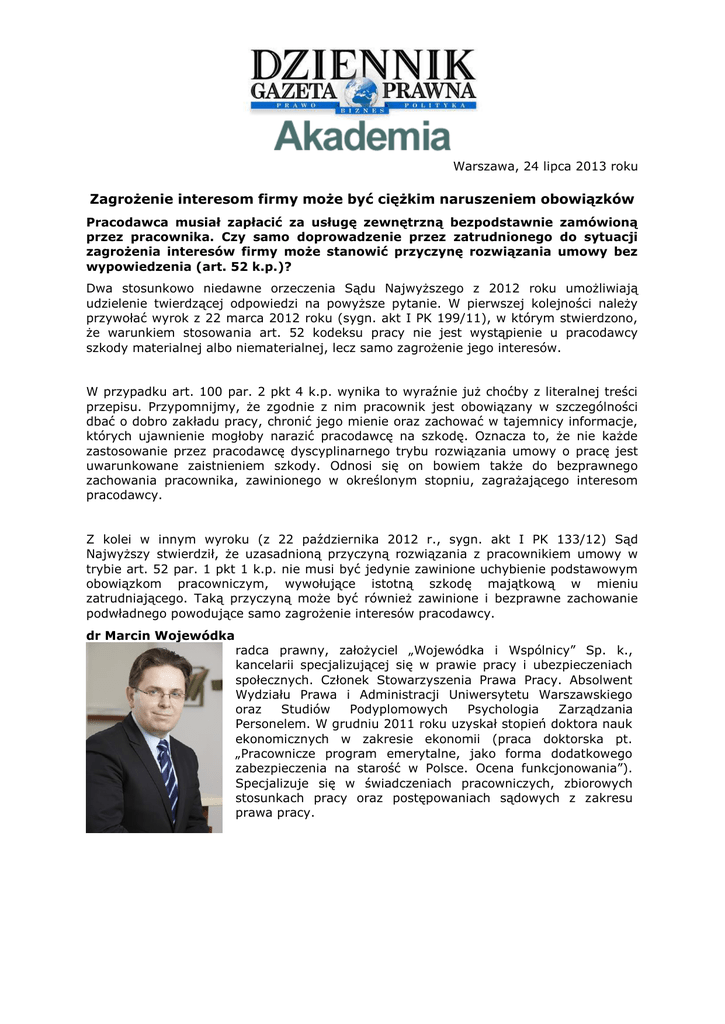 Warszawa, 24 lipca 2013 roku Zagrożenie interesom firmy może być ciężkim naruszeniem obowiązków Pracodawca musiał zapłacić za usługę zewnętrzną bezpodstawnie zamówioną przez pracownika. Czy samo doprowadzenie przez zatrudnionego do sytuacji zagrożenia interesów firmy może stanowić przyczynę rozwiązania umowy bez wypowiedzenia (art. 52 k.p.)? Dwa stosunkowo niedawne orzeczenia Sądu Najwyższego z 2012 roku umożliwiają udzielenie twierdzącej odpowiedzi na powyższe pytanie. W pierwszej kolejności należy przywołać wyrok z 22 marca 2012 roku (sygn. akt I PK 199/11), w którym stwierdzono, że warunkiem stosowania art. 52 kodeksu pracy nie jest wystąpienie u pracodawcy szkody materialnej albo niematerialnej, lecz samo zagrożenie jego interesów. W przypadku art. 100 par. 2 pkt 4 k.p. wynika to wyraźnie już choćby z literalnej treści przepisu. Przypomnijmy, że zgodnie z nim pracownik jest obowiązany w szczególności dbać o dobro zakładu pracy, chronić jego mienie oraz zachować w tajemnicy informacje, których ujawnienie mogłoby narazić pracodawcę na szkodę. Oznacza to, że nie każde zastosowanie przez pracodawcę dyscyplinarnego trybu rozwiązania umowy o pracę jest uwarunkowane zaistnieniem szkody. Odnosi się on bowiem także do bezprawnego zachowania pracownika, zawinionego w określonym stopniu, zagrażającego interesom pracodawcy. Z kolei w innym wyroku (z 22 października 2012 r., sygn. akt I PK 133/12) Sąd Najwyższy stwierdził, że uzasadnioną przyczyną rozwiązania z pracownikiem umowy w trybie art. 52 par. 1 pkt 1 k.p. nie musi być jedynie zawinione uchybienie podstawowym obowiązkom pracowniczym, wywołujące istotną szkodę majątkową w mieniu zatrudniającego. Taką przyczyną może być również zawinione i bezprawne zachowanie podwładnego powodujące samo zagrożenie interesów pracodawcy. dr Marcin Wojewódka radca prawny, założyciel „Wojewódka i Wspólnicy” Sp. k., kancelarii specjalizującej się w prawie pracy i ubezpieczeniach społecznych. Członek Stowarzyszenia Prawa Pracy. Absolwent Wydziału Prawa i Administracji Uniwersytetu Warszawskiego oraz Studiów Podyplomowych Psychologia Zarządzania Personelem. W grudniu 2011 roku uzyskał stopień doktora nauk ekonomicznych w zakresie ekonomii (praca doktorska pt. „Pracownicze program emerytalne, jako forma dodatkowego zabezpieczenia na starość w Polsce. Ocena funkcjonowania”). Specjalizuje się w świadczeniach pracowniczych, zbiorowych stosunkach pracy oraz postępowaniach sądowych z zakresu prawa pracy.